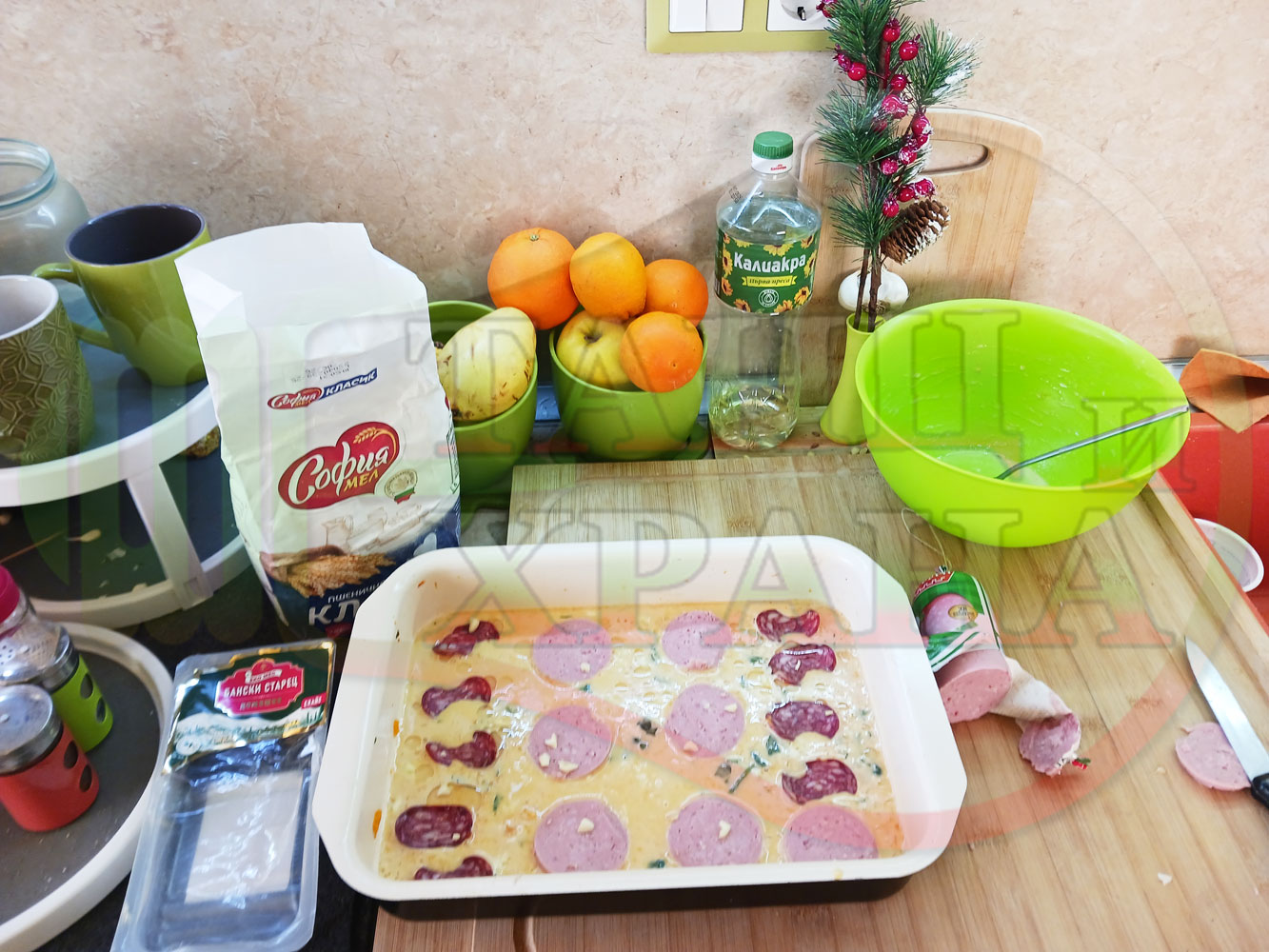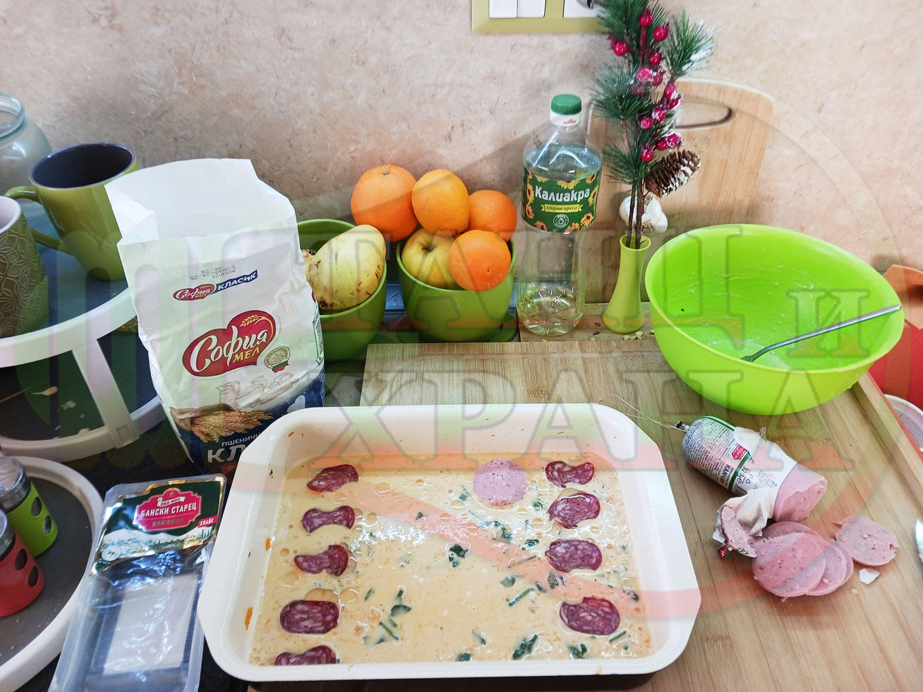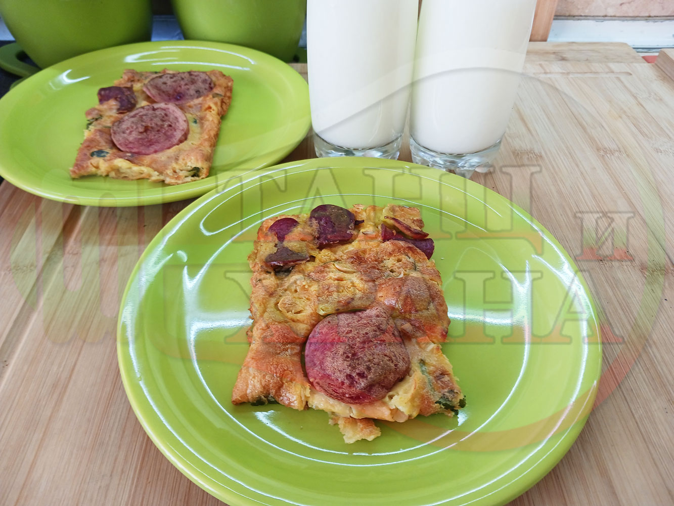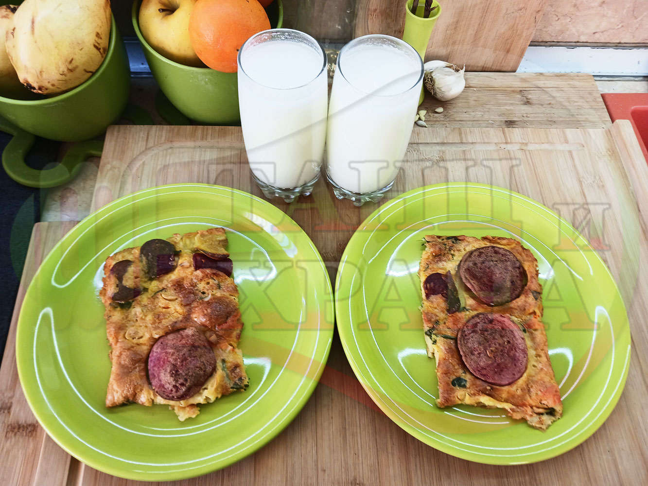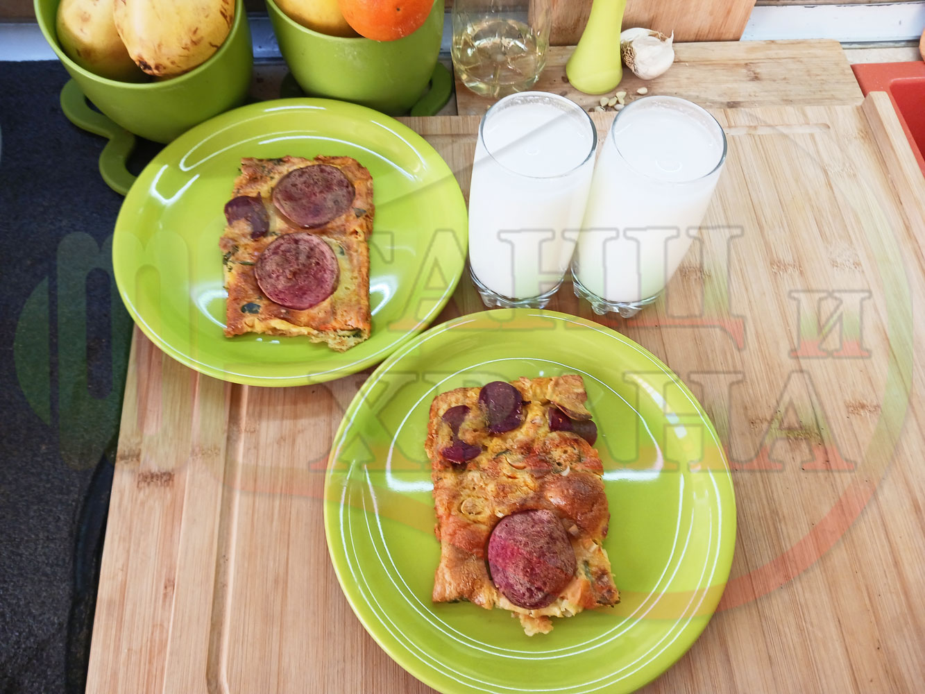 След коледните и новогодишни гозби все се чудим как да оползотворим останалата ни храна... laughing Замесих бухтена пита с останал сос от сварената на фурна българска тиквена яхния "Кренвиршова тиквеноспаначена". Добавих тиквения сос към разбитите със захар и сол яйца и прибавих 5 супени лъжици брашно за бухтеното тесто. Гарнирах питата с останала от празниците луканка и любимият ни салам "Камчия"...   Ммммм, отново спретнах невероятна вкусно, вкусна, вкусотия (вкуснотия) за закуска с изключително малко продукти. laughing