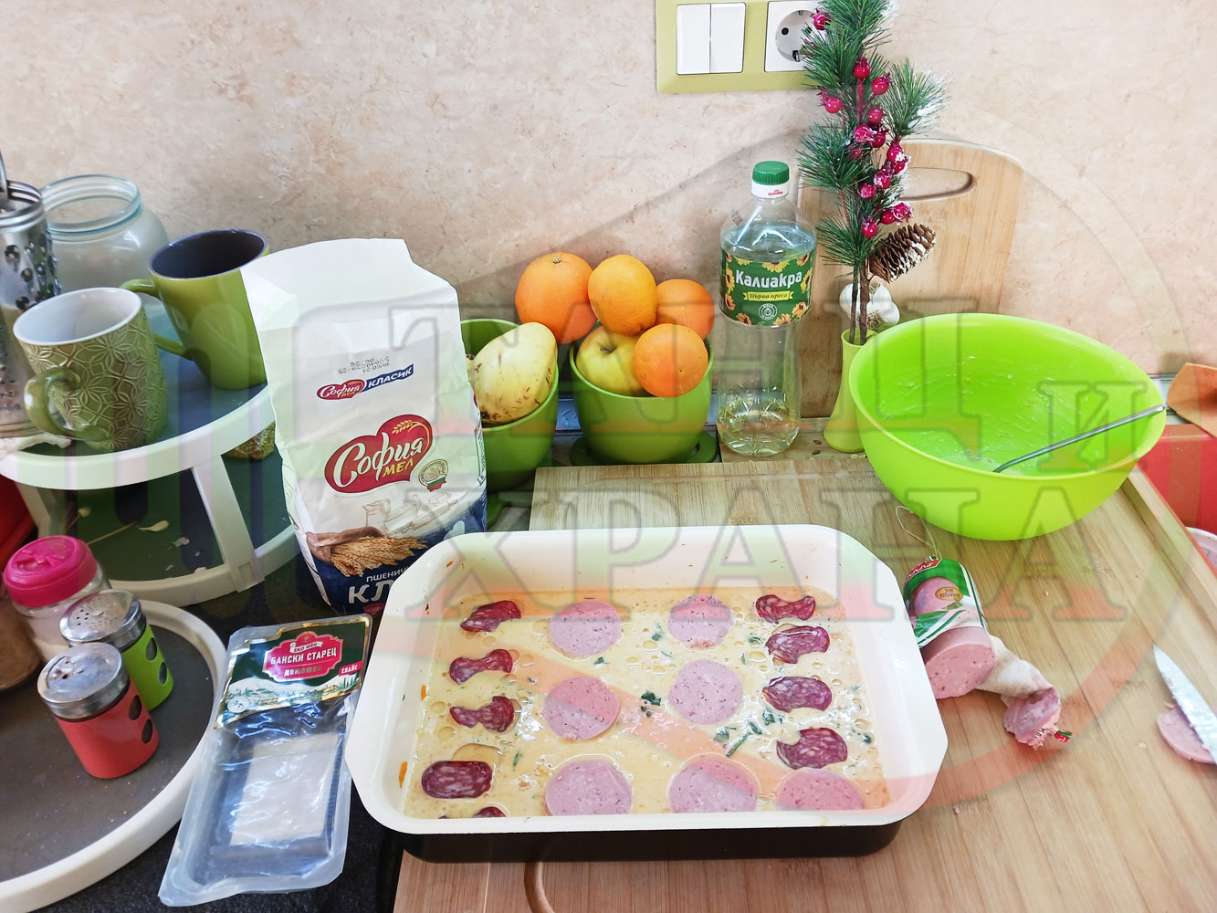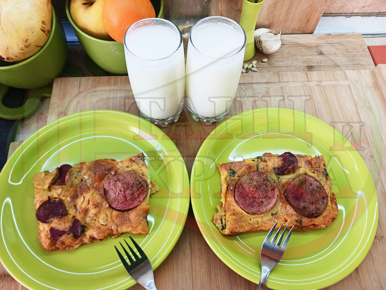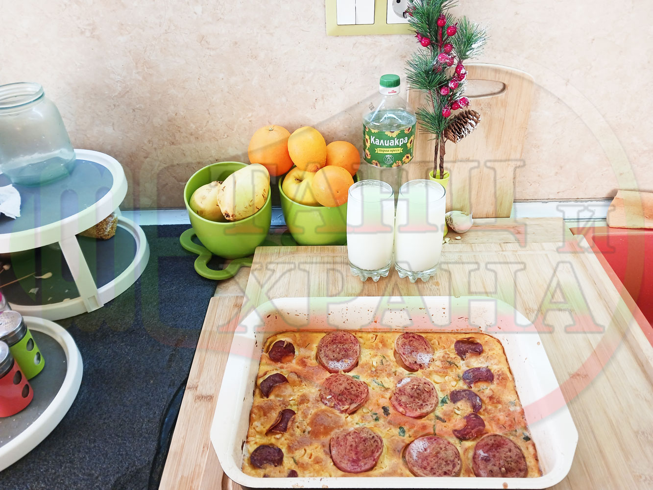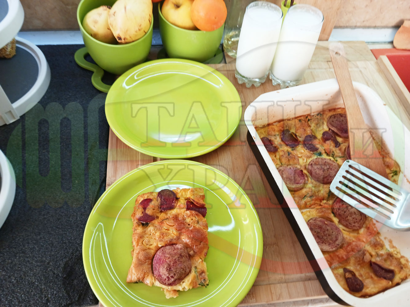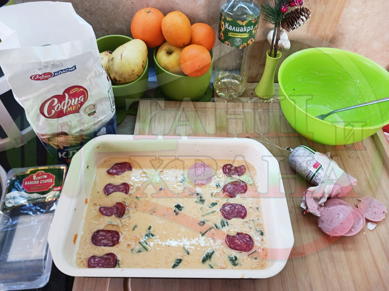 След коледните и новогодишни гозби все се чудим как да оползотворим останалата ни храна... laughing Замесих бухтена пита с останал сос от сварената на фурна българска тиквена яхния "Кренвиршова тиквеноспаначена". Добавих тиквения сос към разбитите със захар и сол яйца и прибавих 5 супени лъжици брашно за бухтеното тесто. Гарнирах питата с останала от празниците луканка и любимият ни салам "Камчия"...   Ммммм, отново спретнах невероятна вкусно, вкусна, вкусотия (вкуснотия) за закуска с изключително малко продукти. laughing