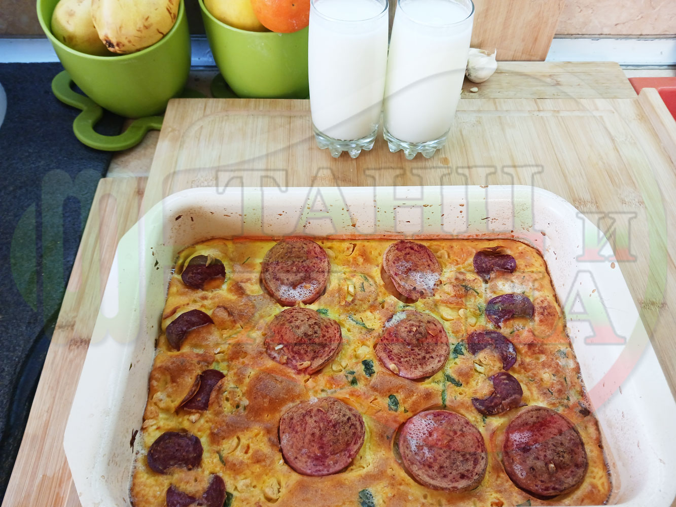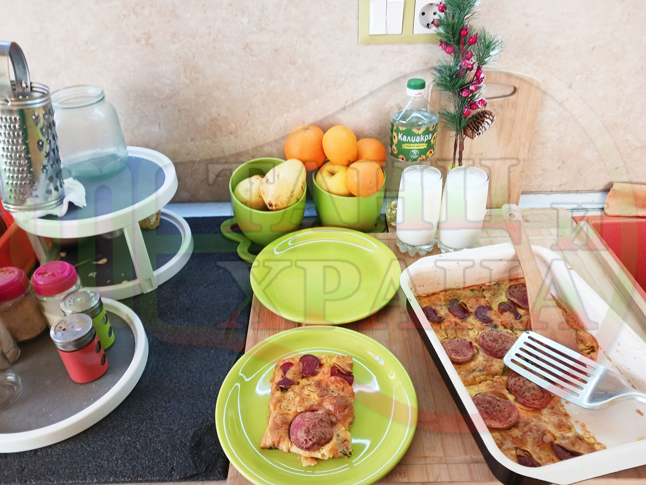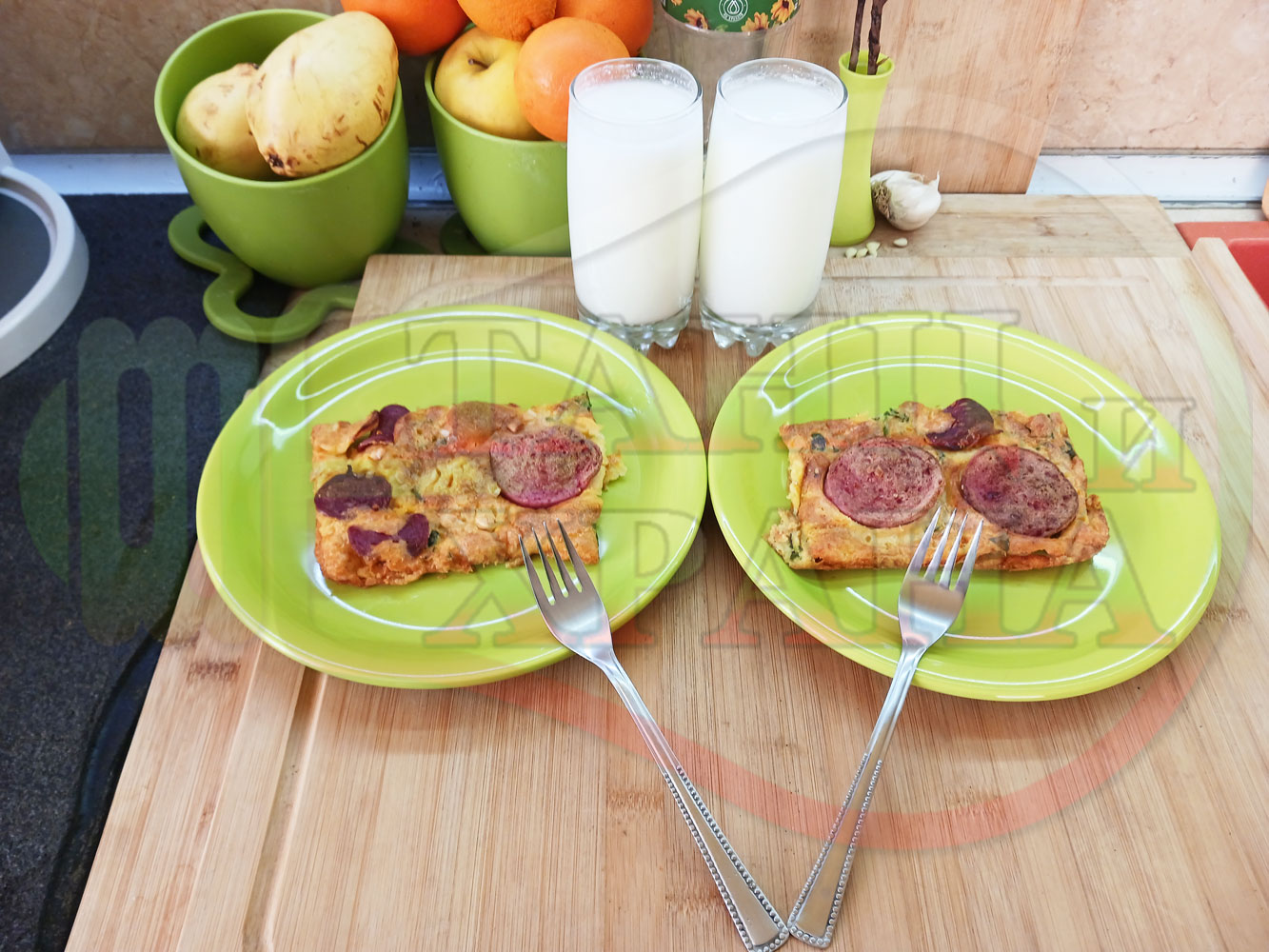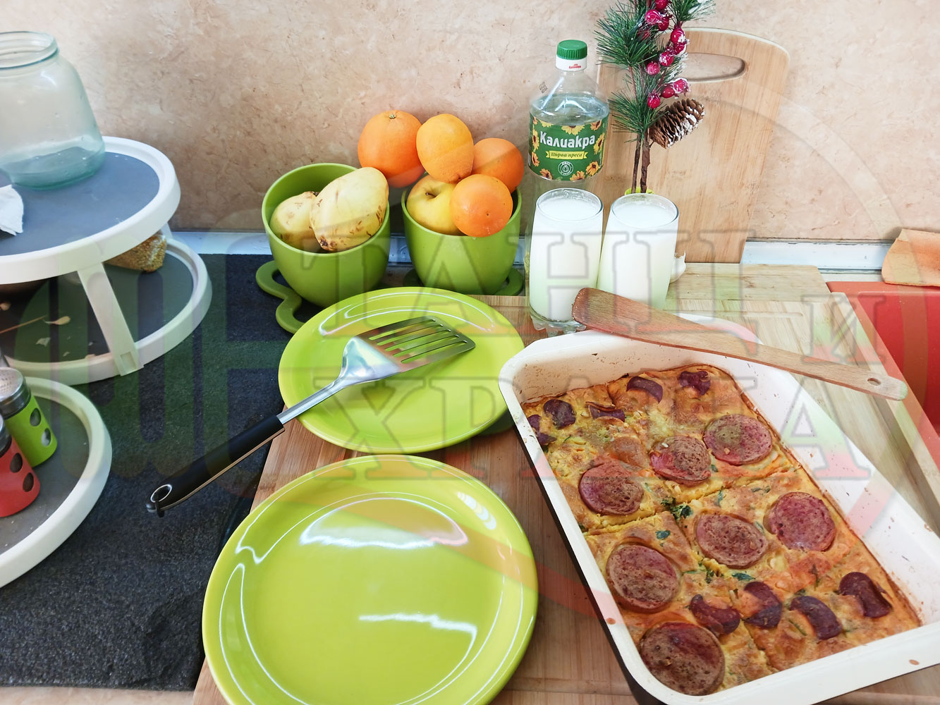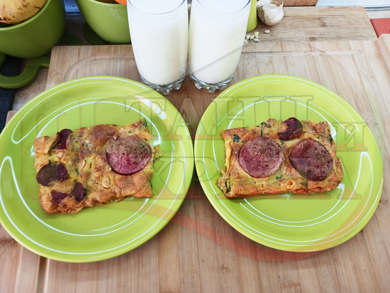 След коледните и новогодишни гозби все се чудим как да оползотворим останалата ни храна... laughing Замесих бухтена пита с останал сос от сварената на фурна българска тиквена яхния "Кренвиршова тиквеноспаначена". Добавих тиквения сос към разбитите със захар и сол яйца и прибавих 5 супени лъжици брашно за бухтеното тесто. Гарнирах питата с останала от празниците луканка и любимият ни салам "Камчия"...   Ммммм, отново спретнах невероятна вкусно, вкусна, вкусотия (вкуснотия) за закуска с изключително малко продукти. laughing