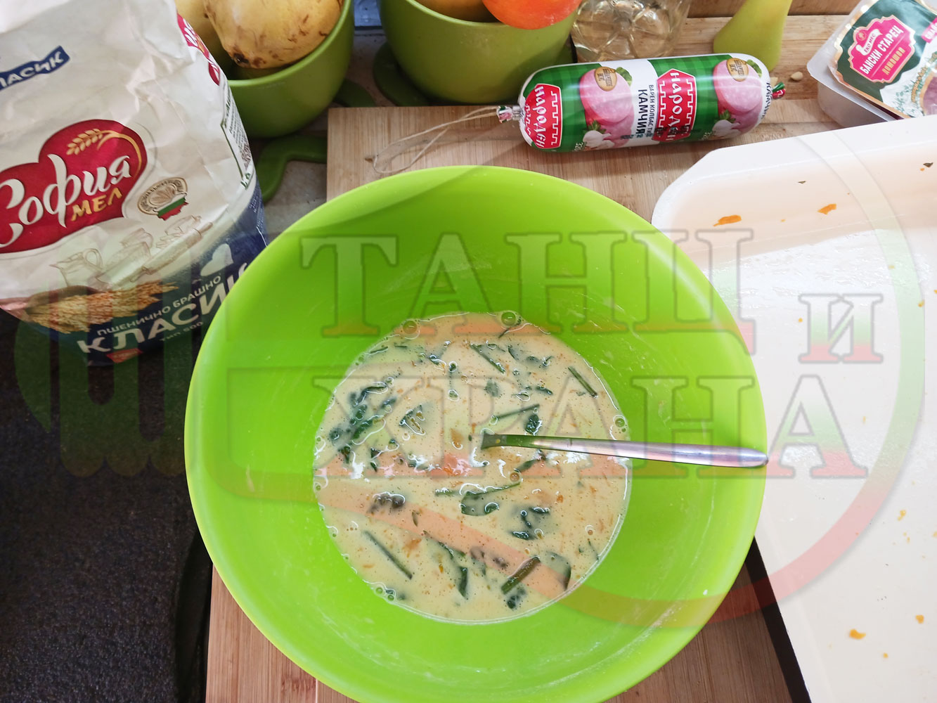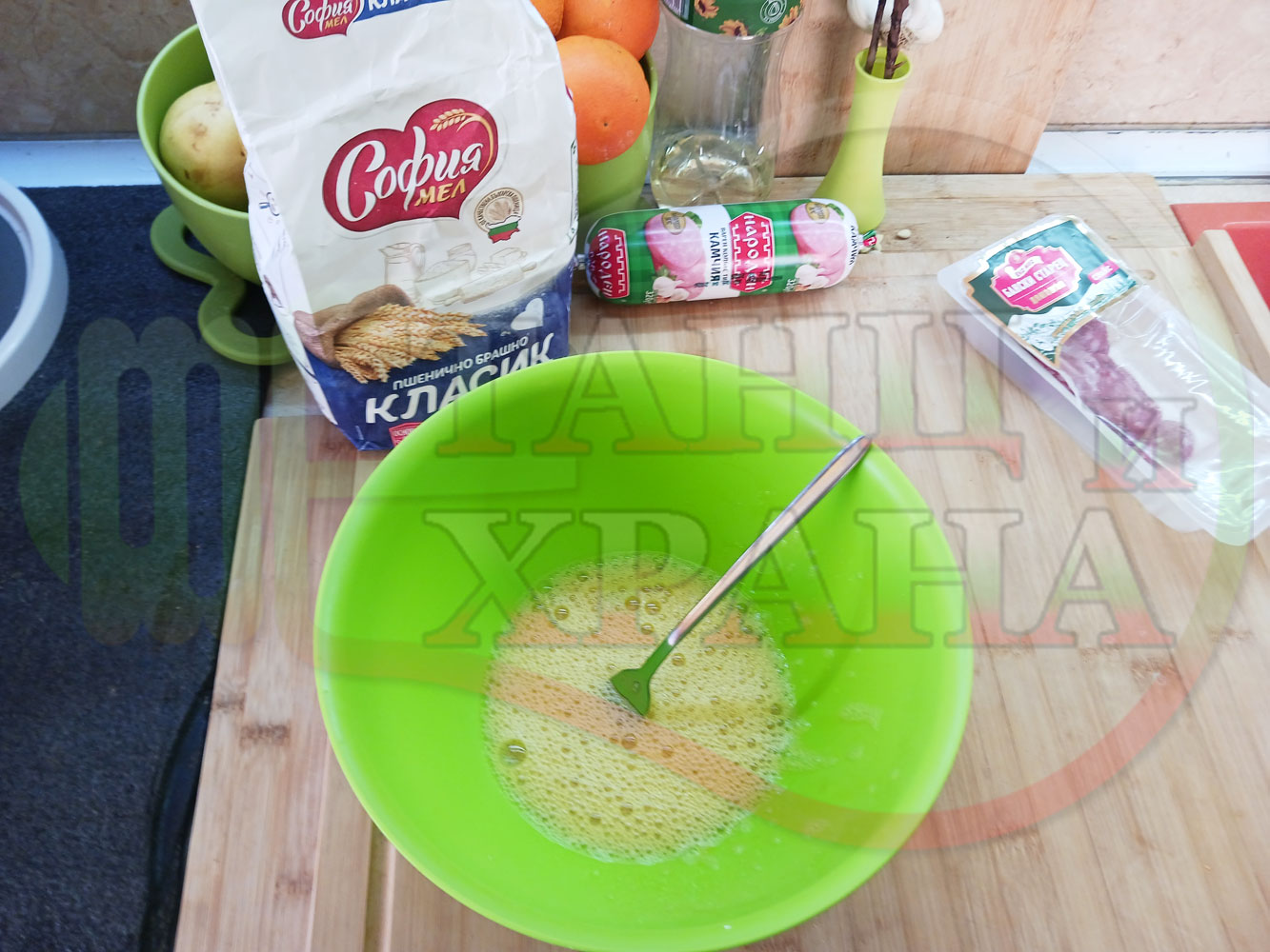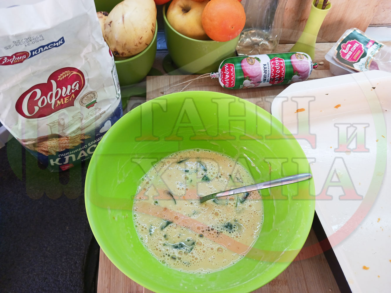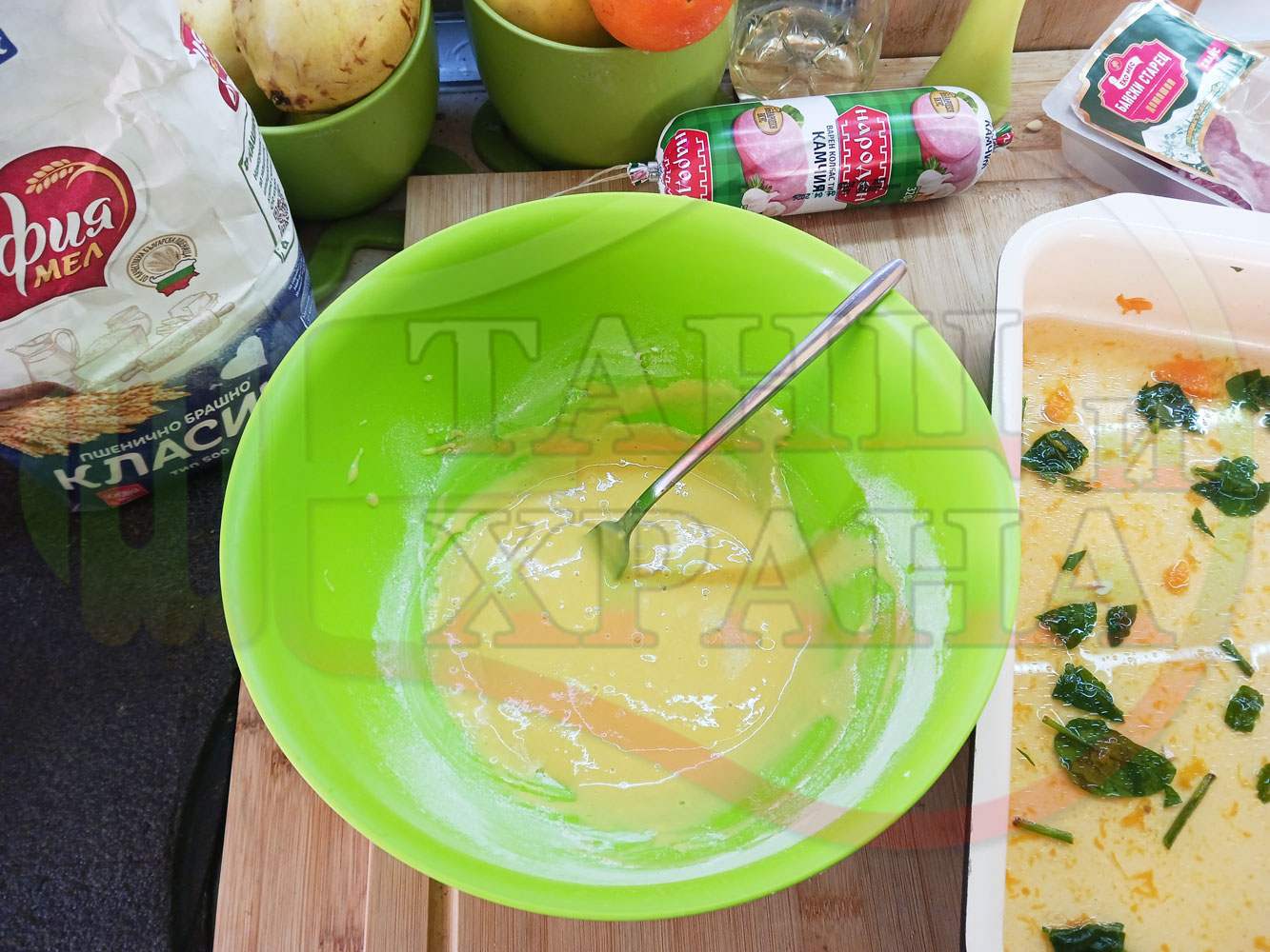 Разбийте яйцата в купа заедно със захарта и солта, добавете брашното и разбъркайте (на този етап сместта е доста гъста). Затоплете съвсем леко останалия сос от българската тиквена яхния, изсипете го в купата и разбъркайте до образуване на сравнително рядко бухтено тесто (малко по-рядко от палачинковото).