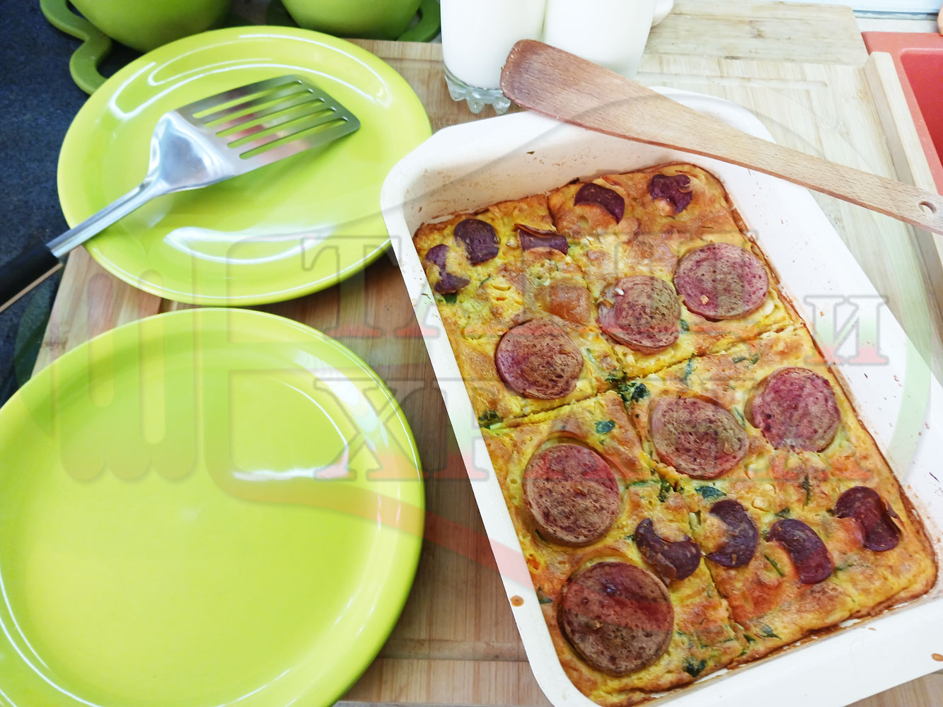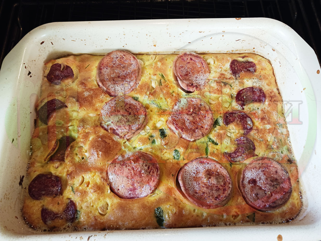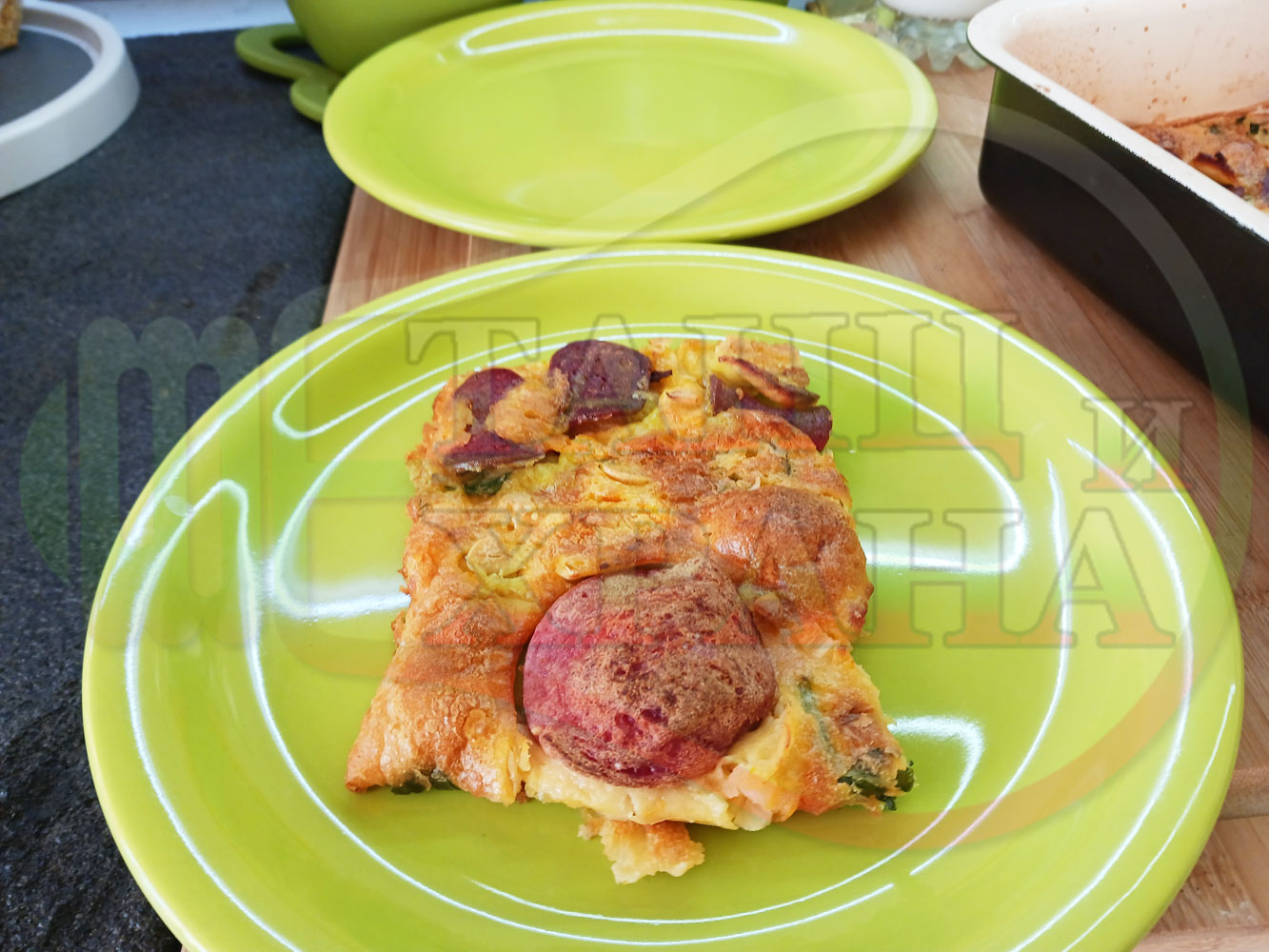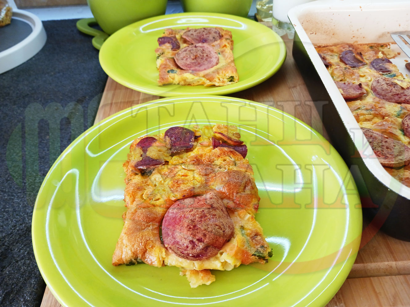 Бухтена тиквена пита "Камчиевосаламена луканкова тиквеноспаначено сосова " изпечена на фурна с луканка, чесън и пикантен чеснов салам омесена с яйца, брашно и сос от сварена тиква със свеж спанак - производна