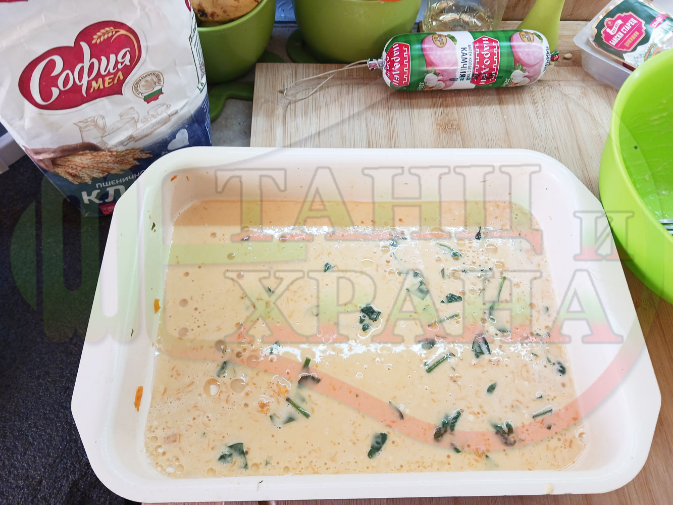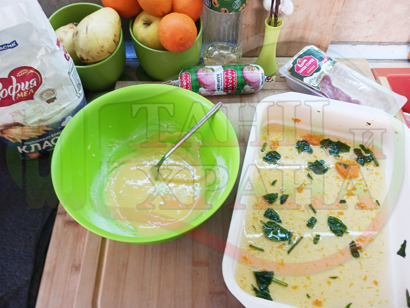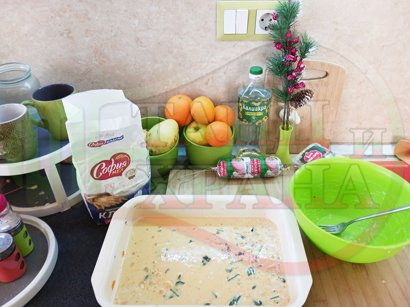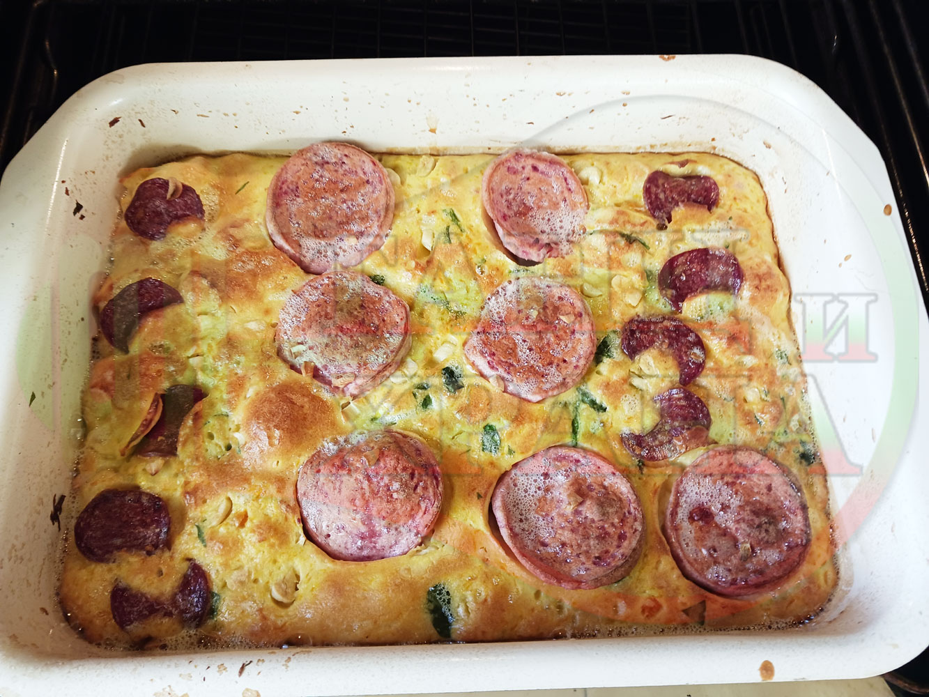 Бухтена тиквена пита "Камчиевосаламена луканкова тиквеноспаначено сосова " изпечена на фурна с луканка, чесън и пикантен чеснов салам омесена с яйца, брашно и сос от сварена тиква със свеж спанак - производна
