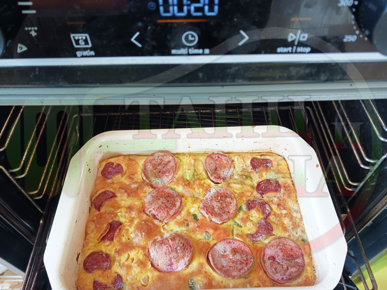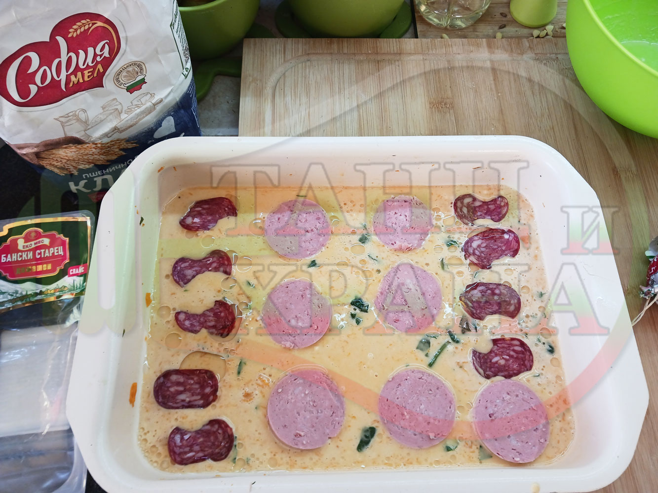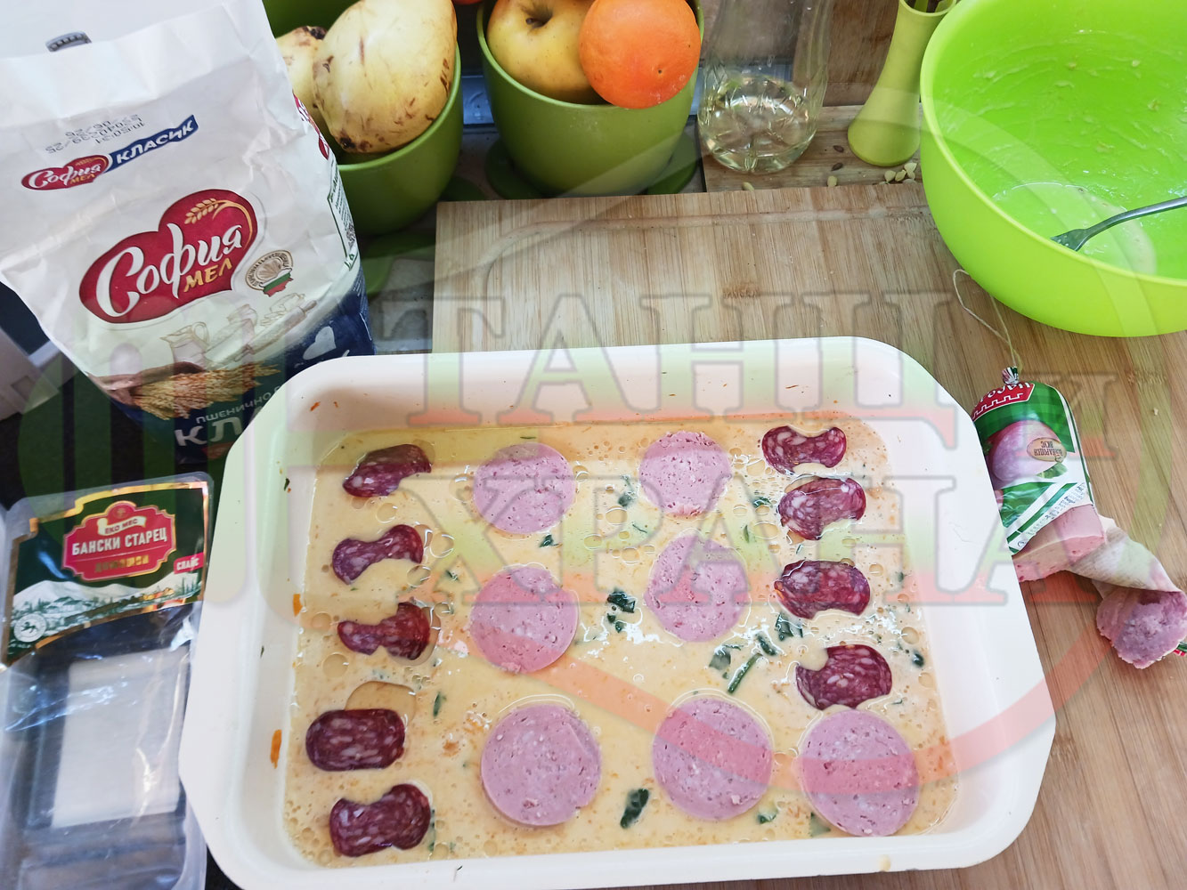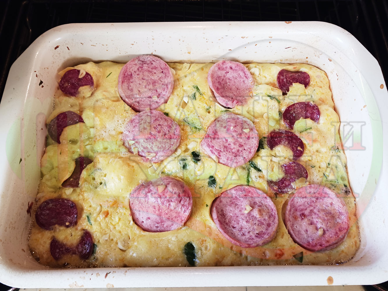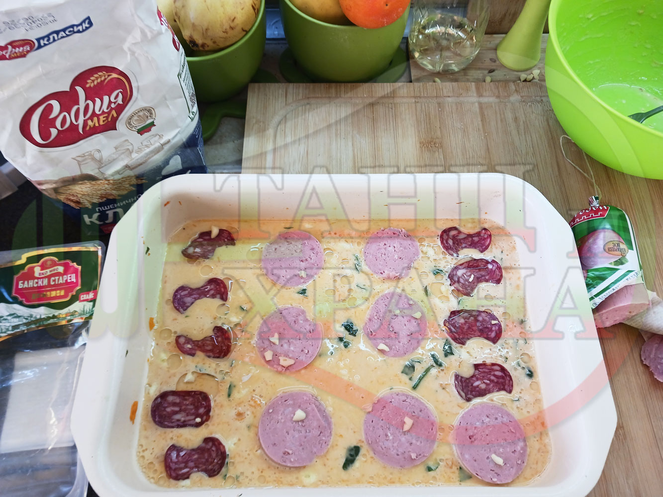Изсипете бухтеното тесто в намазана със слънчогледово олио тава за печене и подредете нарязаната на елипсовидни кръгчета луканка и нарязания на кръгове пикантен чеснов салам. Обелете чесъна, нарежете го на едро и го разпределете върхо 2-та вида колбаси. Поставете тавата в предварително загрятата фурна (загрейте я за поне 5 минути). Запечете на фурна без вентилатор на 180 градуса за около 25 минути.