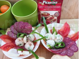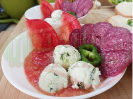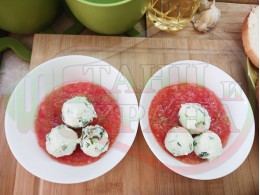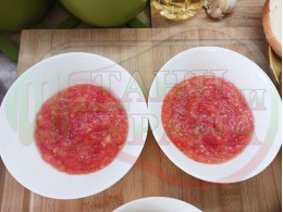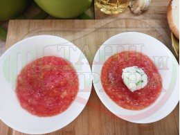 Българска доматена сурова супа "Кромидлучена зеленочушковочеснова с БГсирене" приготвена от домати и кромид лук гарнирана с луканка и топчета от сиренов крем със зелени пресни чушки, чесън и краве бяло сирене (българско, саламурено) - двукомпонентна