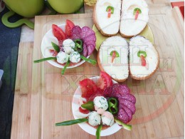 Разпределете равномерно количество от доматената кромидлучена супа в подходящи купи, така че да има поне два пръста разстояние от супата до ръба на купите, за да не прелеят при гарнирането със сиреновите топчета. Подредете по 3 топчета от сиреновия зеленочушков крем в центъра на всяка доматена супа, подредете по 7 ветрилообразни елипсовидни кръгчета от луканката до сиреновите топчета във всяка порция и украсете порциите с чушковите ивички, обръчи и връхчета и вътрешната част на кромид лука (украсете порциите по ваше желание и усмотрение).