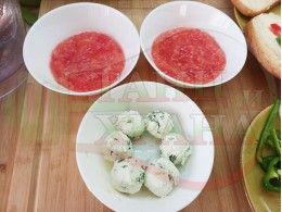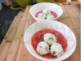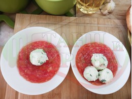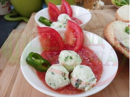 Българската доматена сурова, студена супа, която сътворих се оказа доста вкусна и се спретва буквално за "нула" време с чопър. Гарнирах супата с топчета от сиреново зеленочушков крем приготвени с българско краве бяло саламурено сирене, зелени пресни чушки и стар чесън и се получи най-вкусната сурова супа, която сме хапвали (поредната най-вкусна сурова супа (всичките сурови супи са вкусни по свой си начин според продуктите, които са включени в тях)). Двукомпонентността на супите (в голямата си част са авторски с иновативен метод на представяне и комбиниране на продуктите (прилагам метода на двукомпонентността в почти всички видове ястия, които приготвям)), който позволява да се комбинират сурови и/или запечени продукти, с което осъвременявам и обогатявам традиционни български вкусове за приготвянето на супи, ястия, печива и български гозби. Сиреновите топчета се разтварят постепенно в доматената супа и я овкусяват с неповторимия вкус на саламурата, който носят, допълнена с леката хрупкавина от зелените пресни чушки и отново се получи голяма вкусно, вкусна, вкусотия (вкуснотия), която е изключително полезна, обединяваща млечните протеини, минерали и микроелементи от българското краве бяло сирене с богатството от полезни съставки на доматите, чушките, чесъна и кромид лука. ![]()