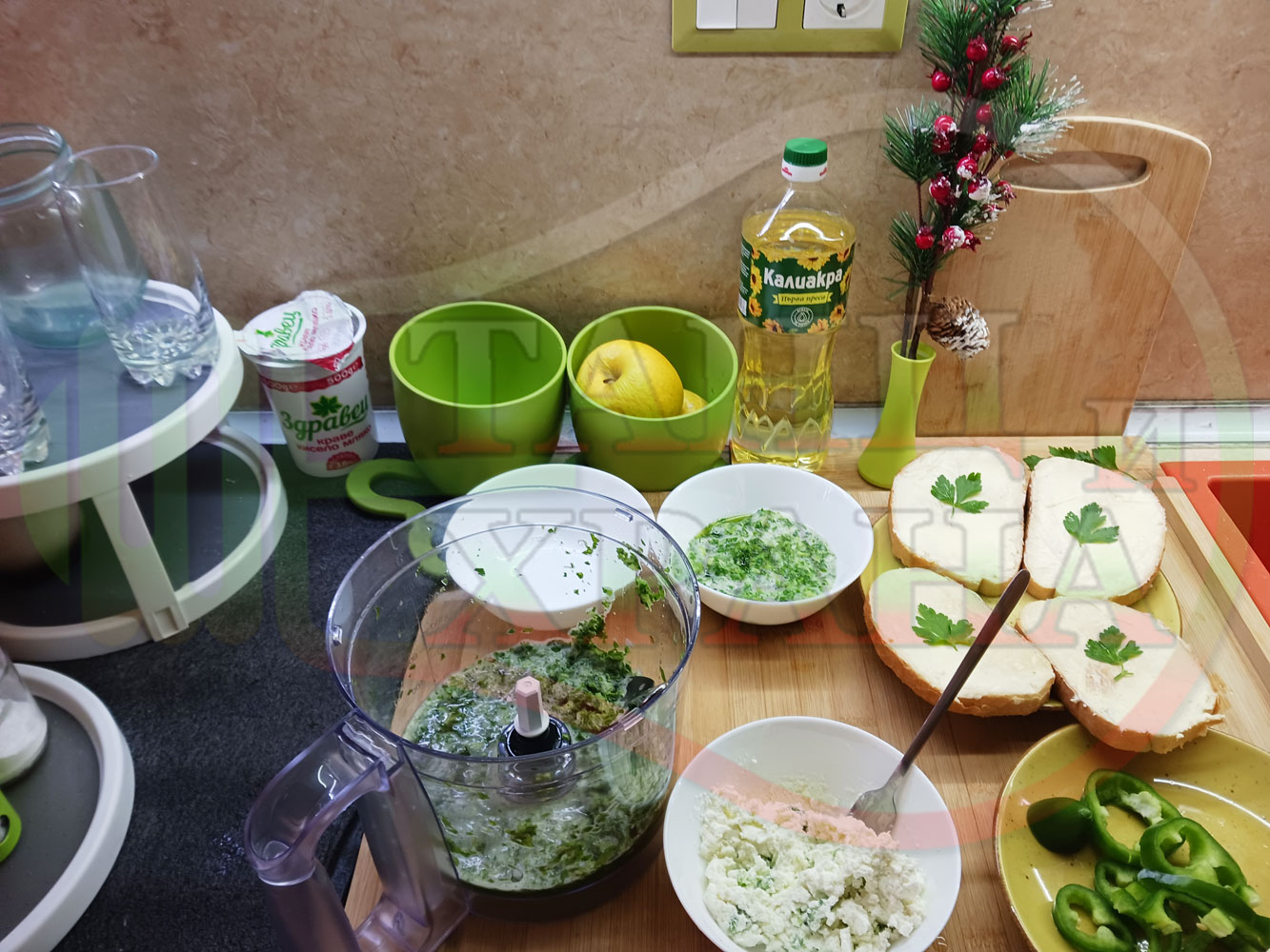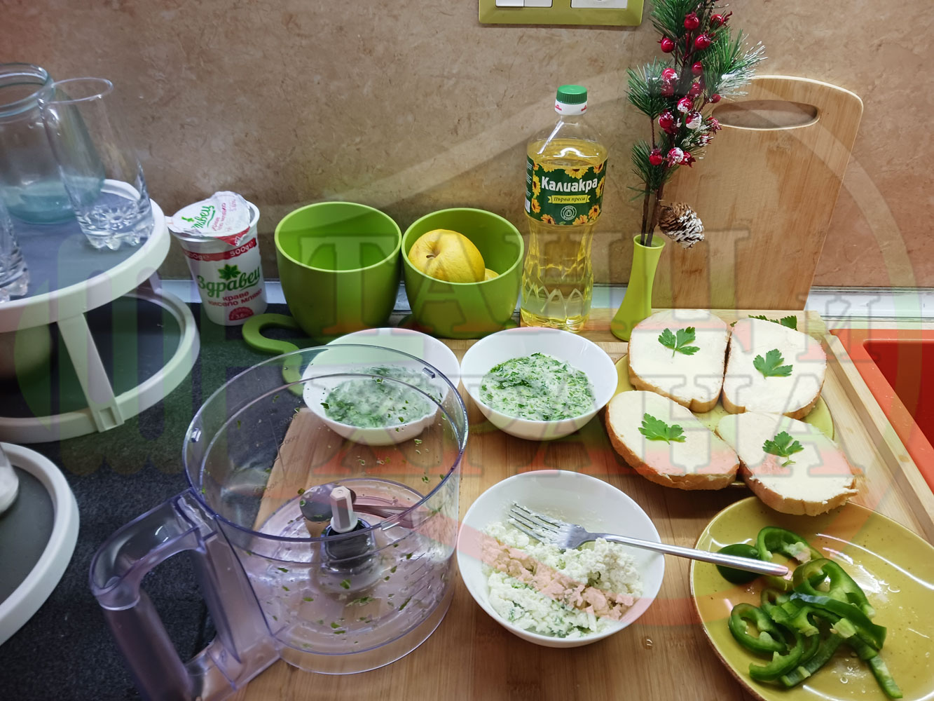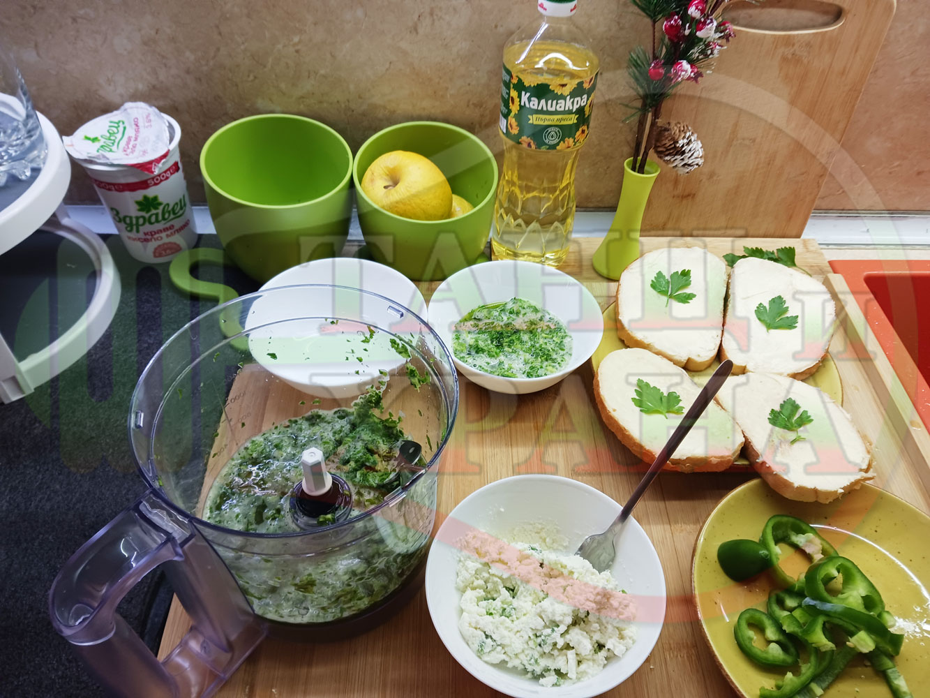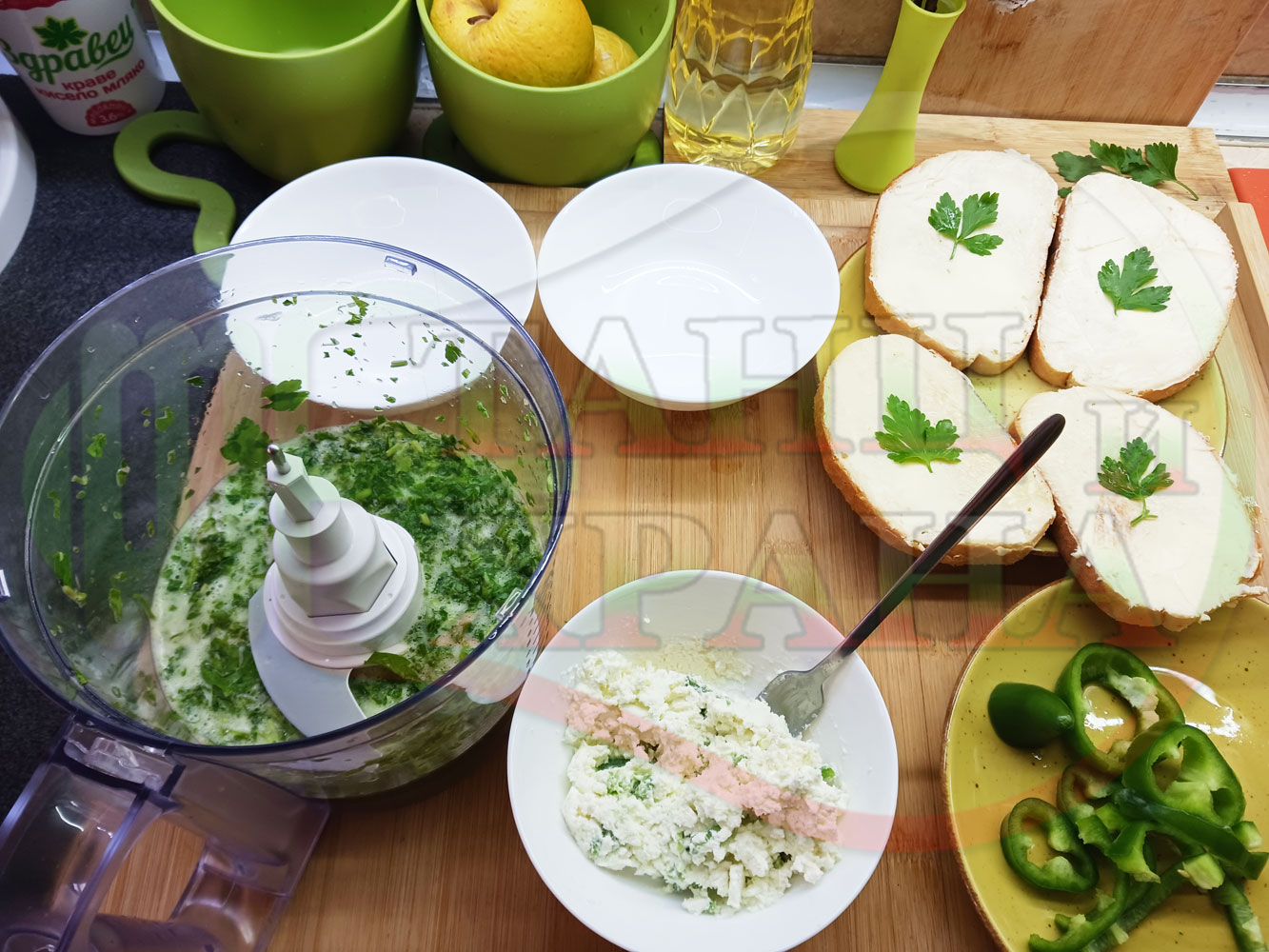 ПРОДУКТИ: Приблизителни количества за българска магданозена сурова супа "Зеленочушкова зеленочайна с БГсирене" приготвена със свеж магданоз, зелени пресни чушки и зелен чай гарнирана с топчета от сиреново зеленочушков крем с краве бяло сирене (българско, саламурено) - двукомпонентна