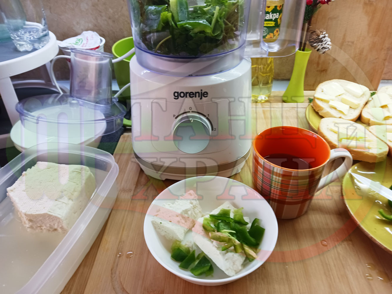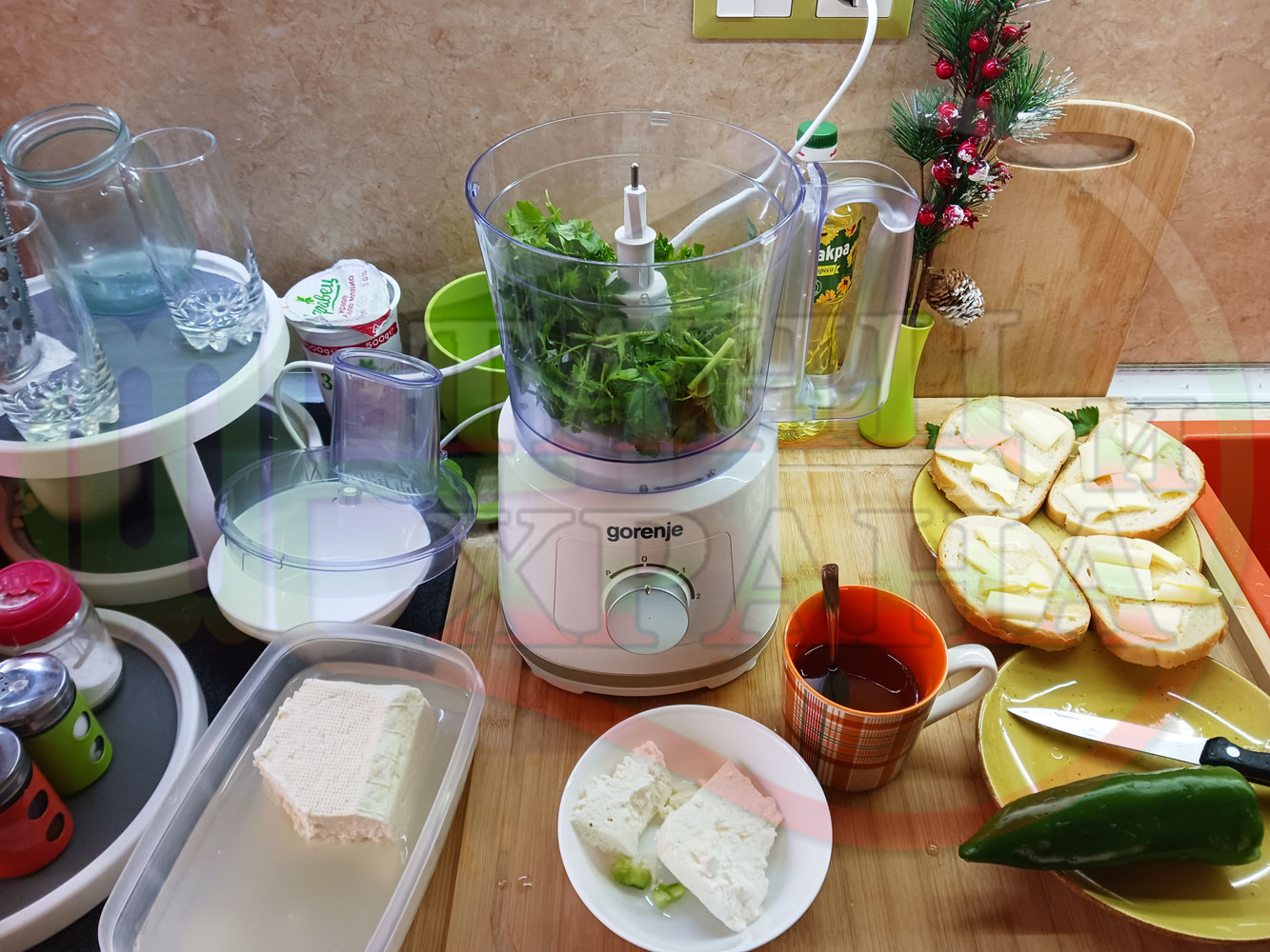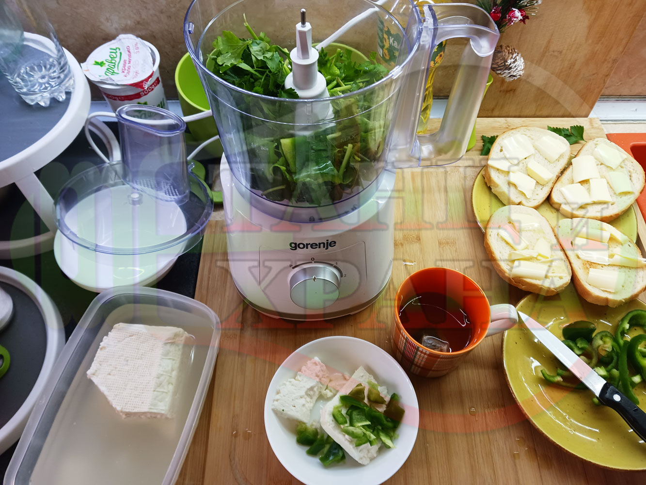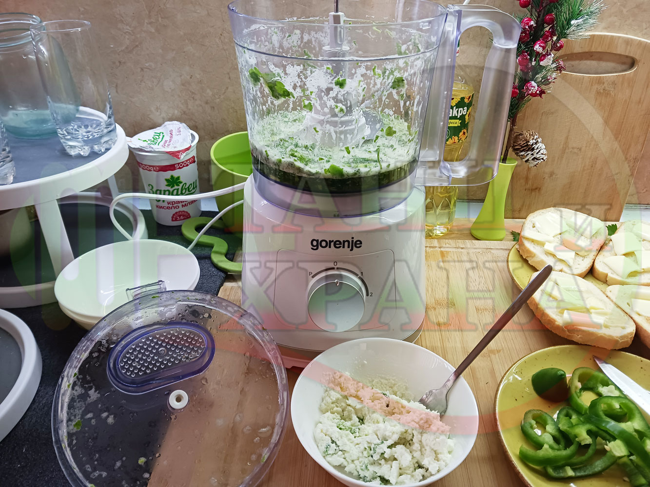 ПРОДУКТИ: Приблизителни количества за българска магданозена сурова супа "Зеленочушкова зеленочайна с БГсирене" приготвена със свеж магданоз, зелени пресни чушки и зелен чай гарнирана с топчета от сиреново зеленочушков крем с краве бяло сирене (българско, саламурено) - двукомпонентна