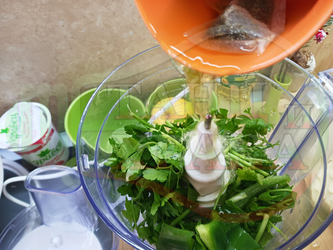 Измийте магданоза, нарежете ги на едро и го сипете в чопъра заедно с измитата, почистена от семките чрез т.нар . "изтърбушване" и нарязана на малки парченца зелена прясна чушка (нарежете част от чушката на "обръчи" и ивички и заделете връхчетата и по-хубави стръкчета магданоз за украса). Сипете подсладения зелен чай и разбийте с чопъра продуктите до образуване на средно гъста магданозена зеленочушкова, хомогенизирана супа със зелен чай (магданозена супа).