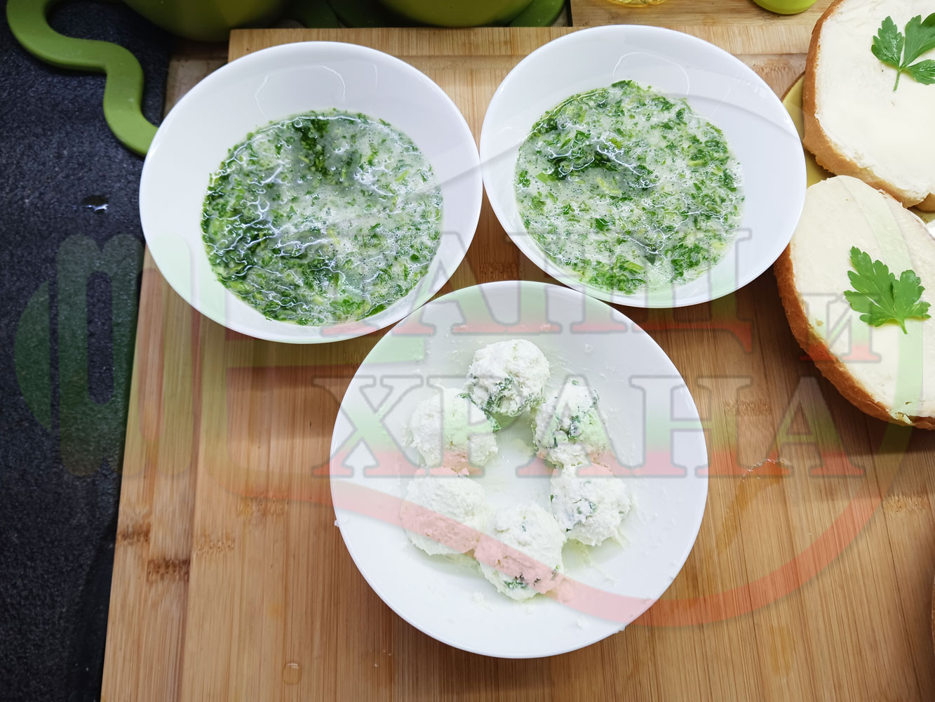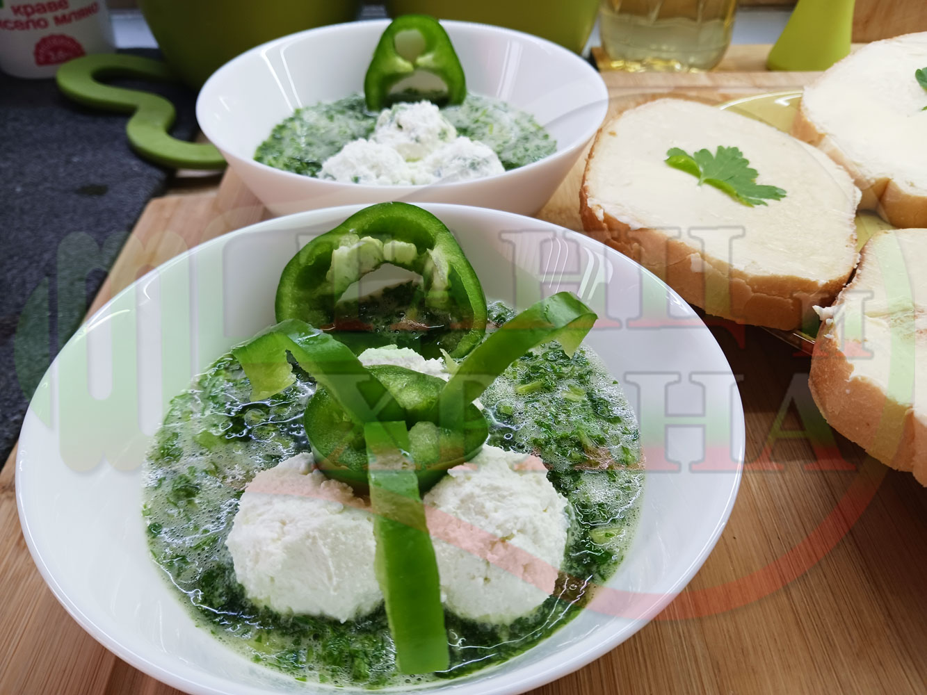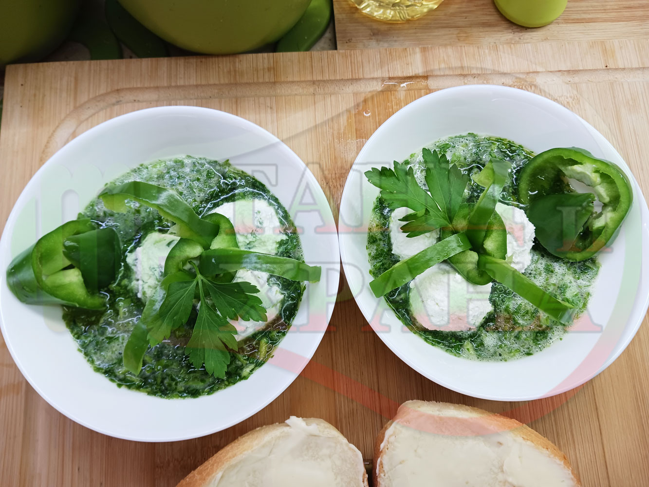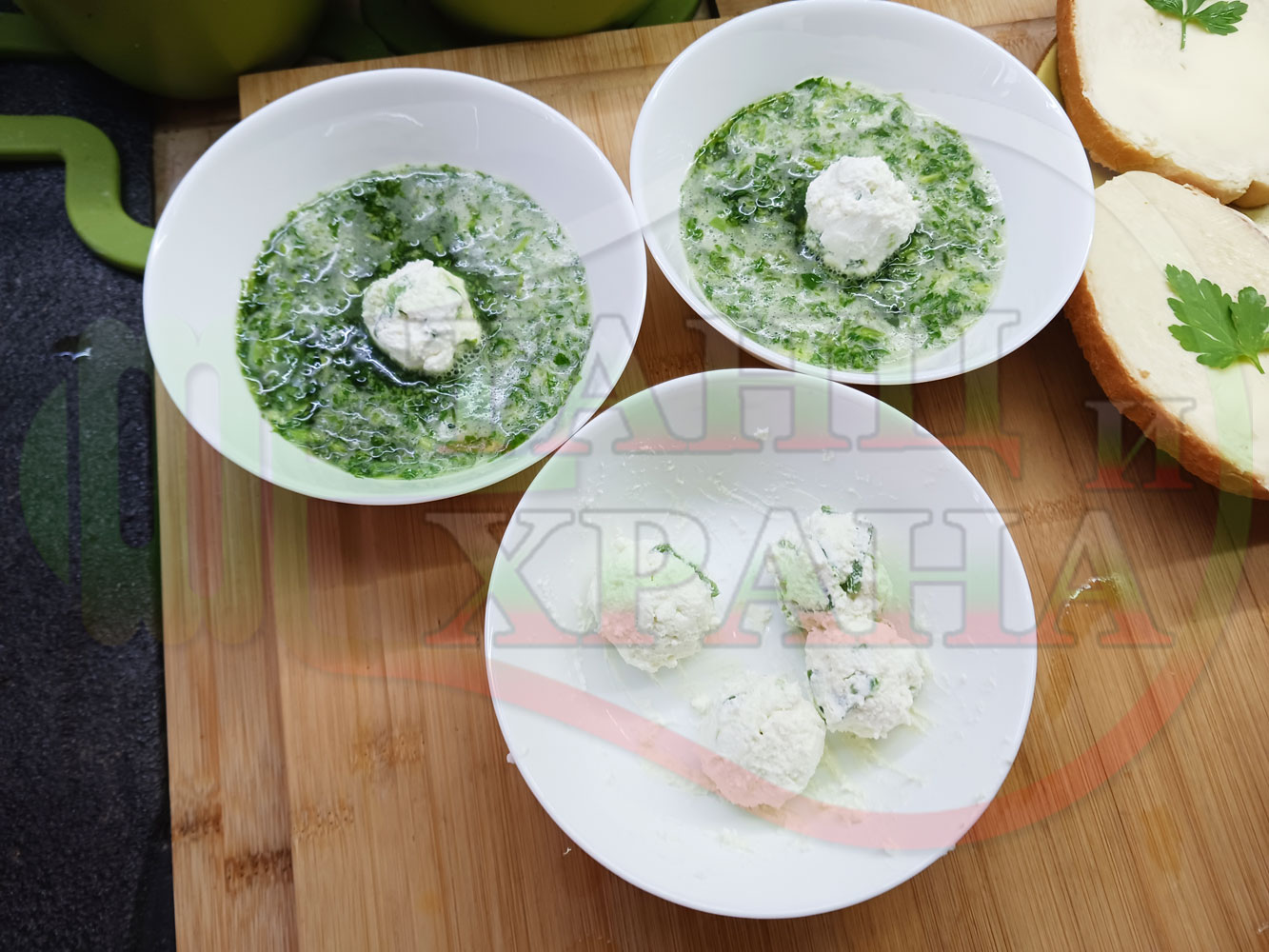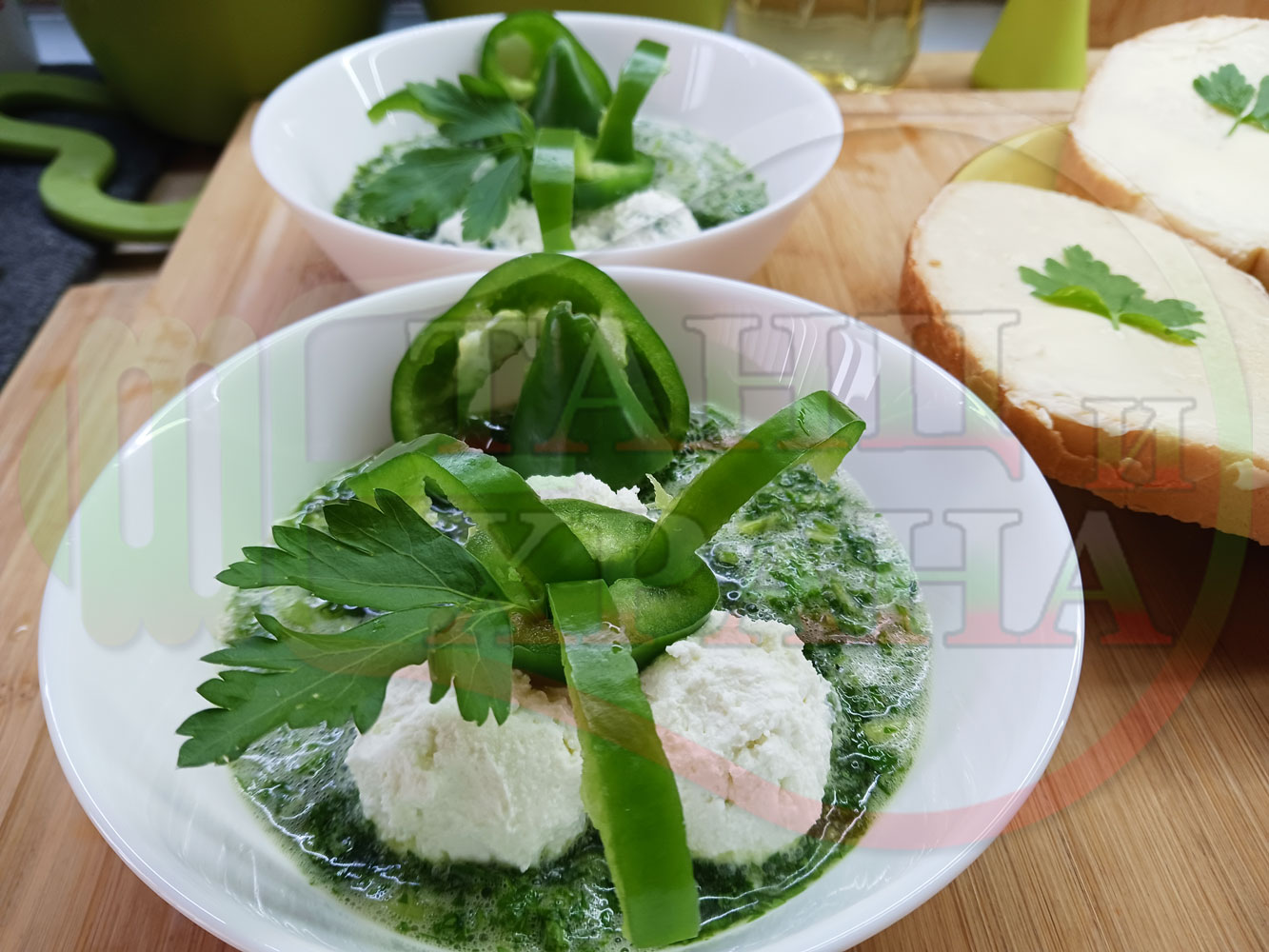 Българска магданозена сурова супа "Зеленочушкова зеленочайна с БГсирене" приготвена със свеж магданоз, зелени пресни чушки и зелен чай гарнирана с топчета от сиреново зеленочушков крем с краве бяло сирене (българско, саламурено) - двукомпонентна