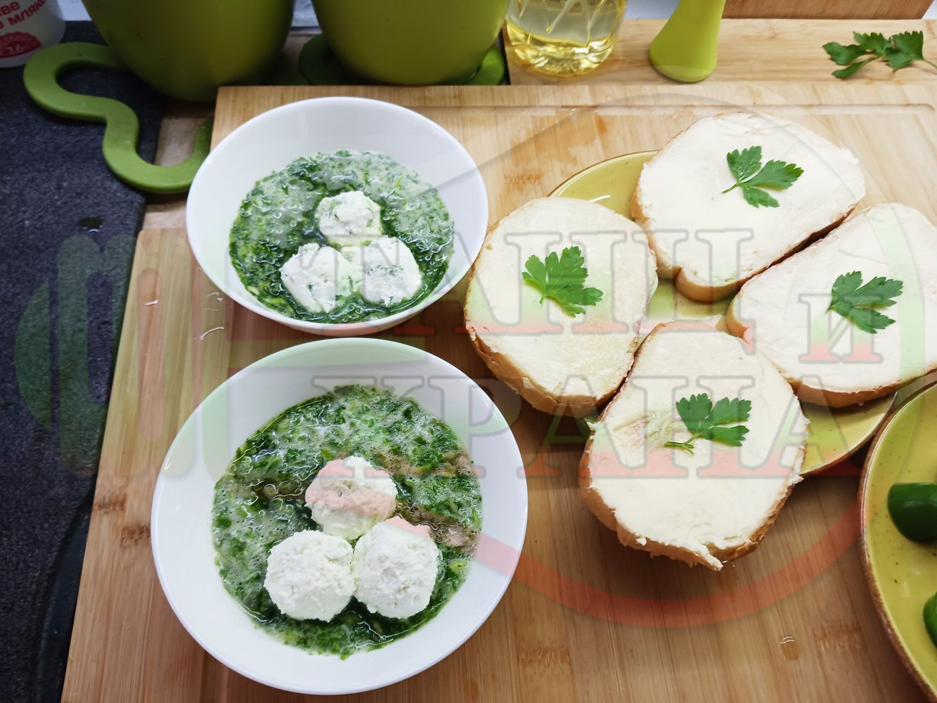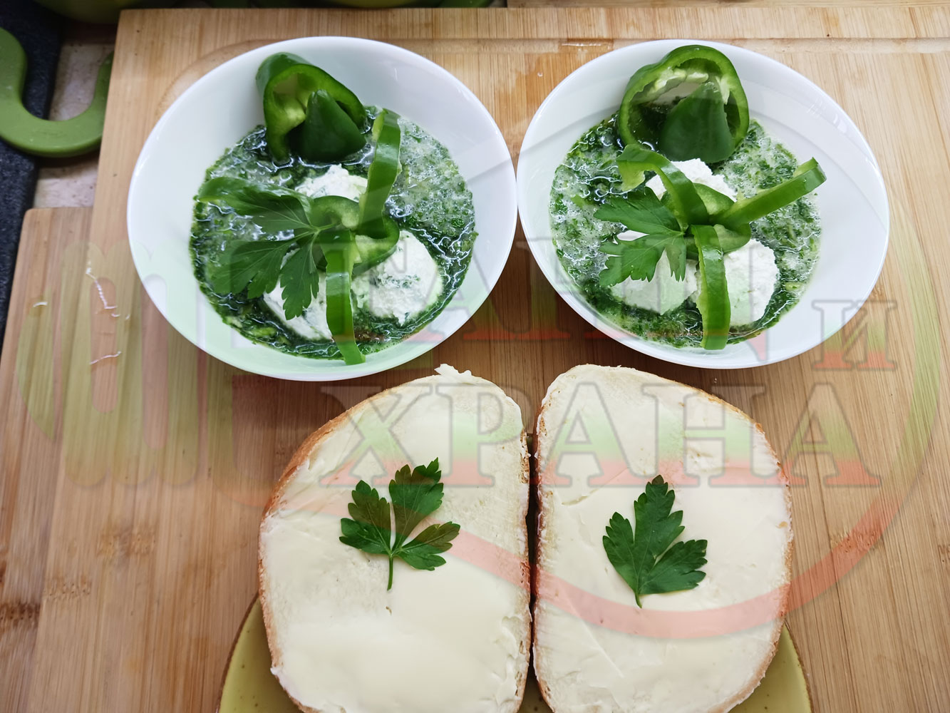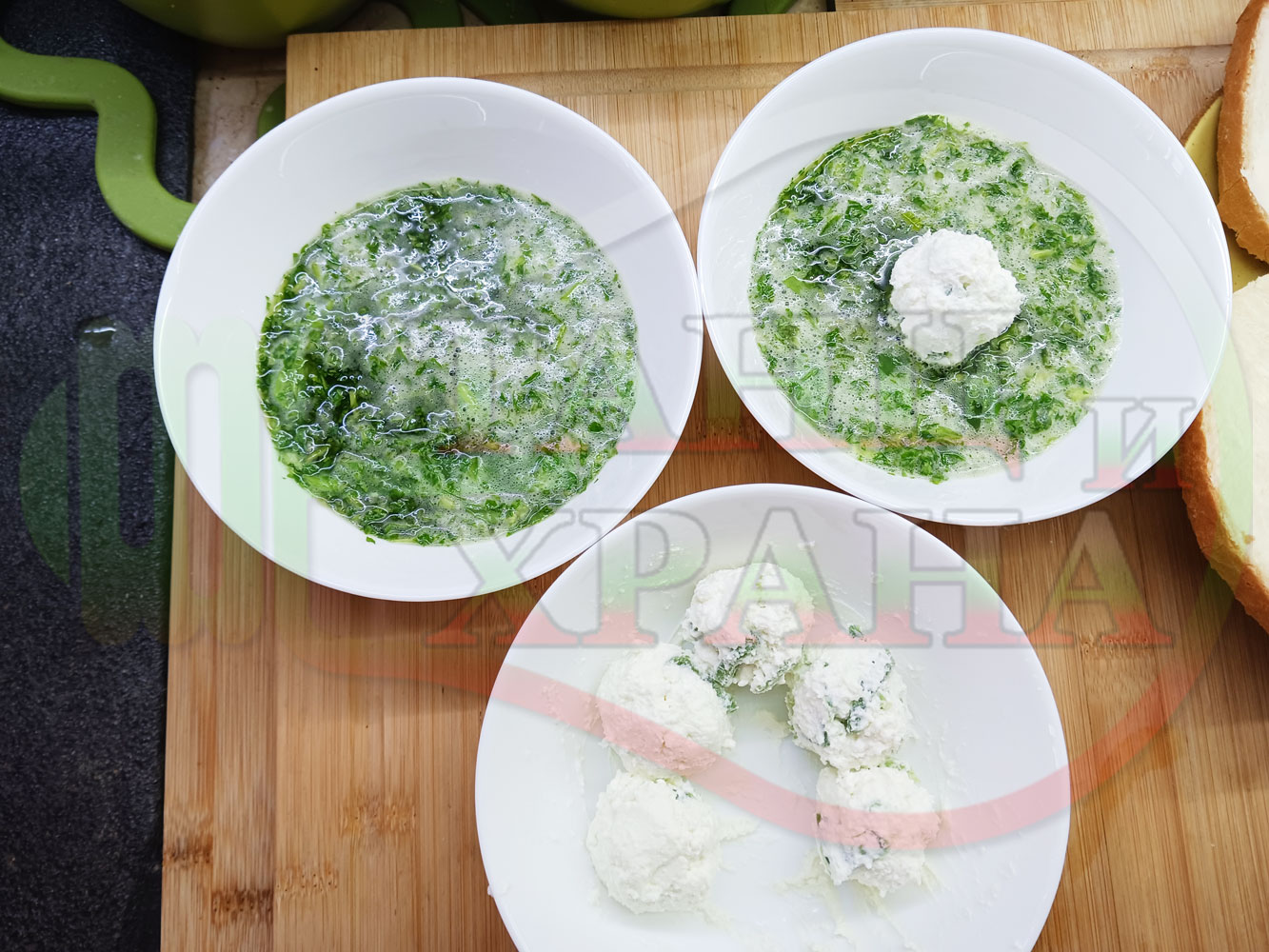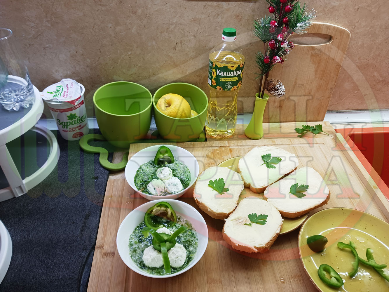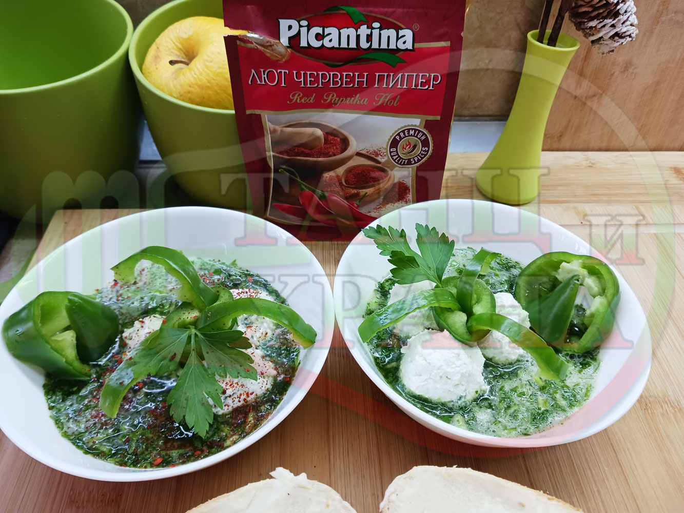 Българска магданозена сурова супа "Зеленочушкова зеленочайна с БГсирене" приготвена със свеж магданоз, зелени пресни чушки и зелен чай гарнирана с топчета от сиреново зеленочушков крем с краве бяло сирене (българско, саламурено) - двукомпонентна