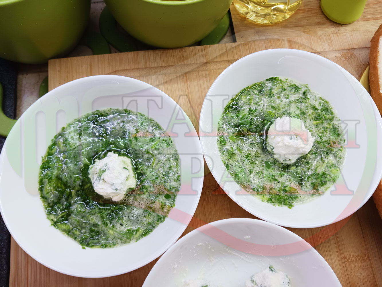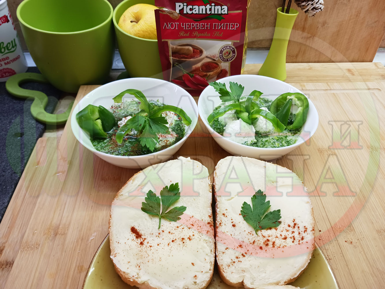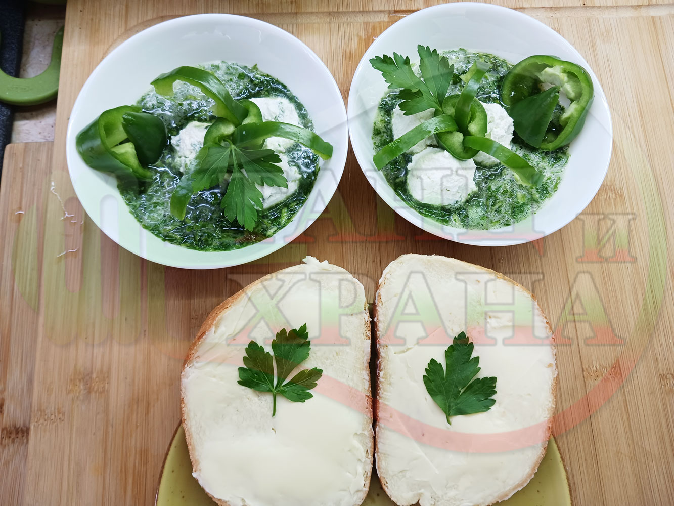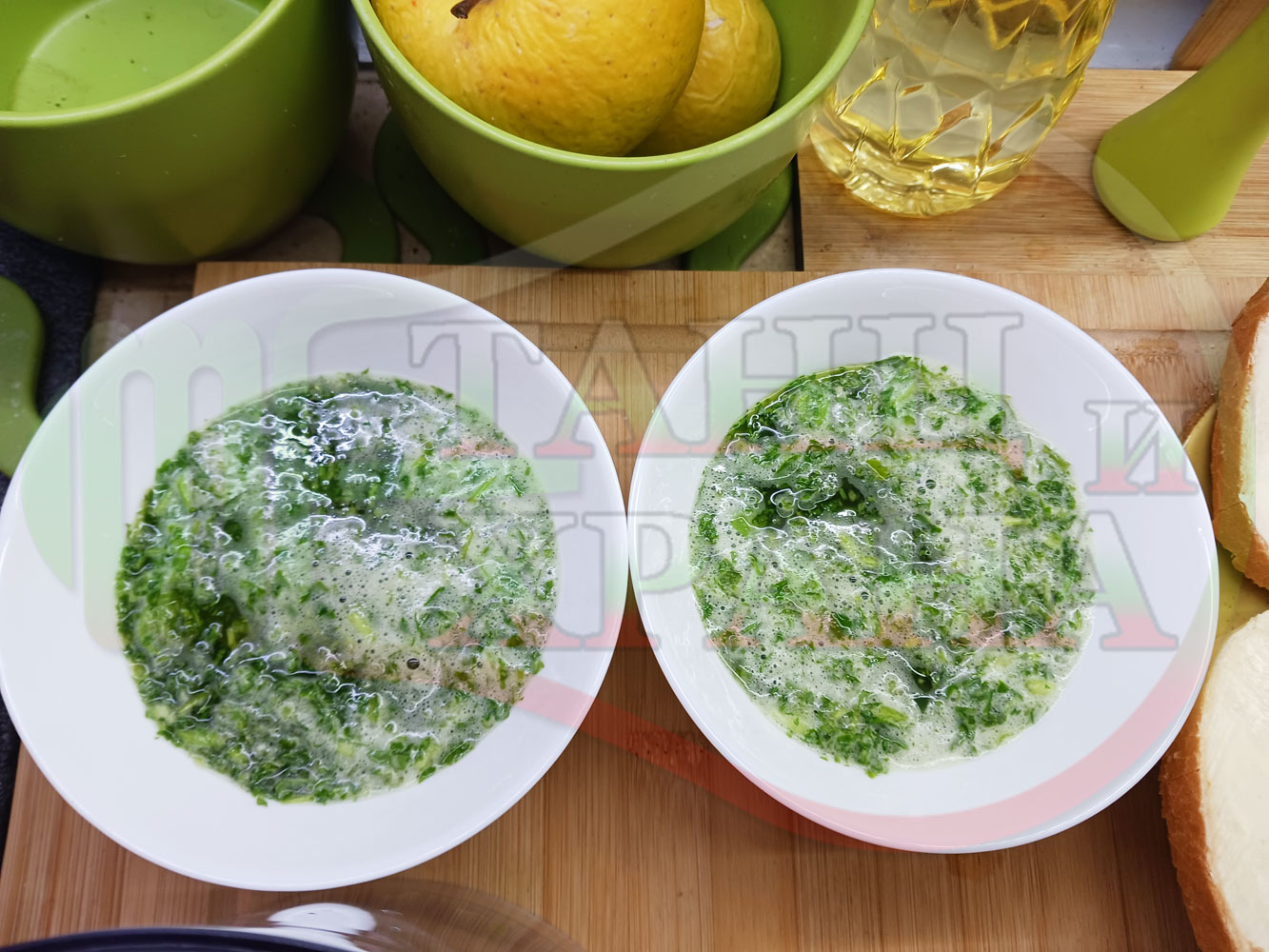 Българска магданозена сурова супа "Зеленочушкова зеленочайна с БГсирене" приготвена със свеж магданоз, зелени пресни чушки и зелен чай гарнирана с топчета от сиреново зеленочушков крем с краве бяло сирене (българско, саламурено) - двукомпонентна