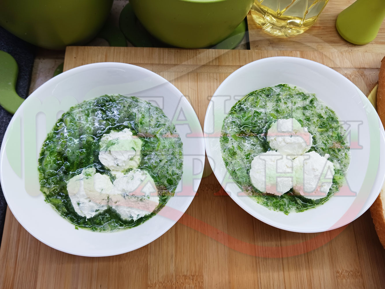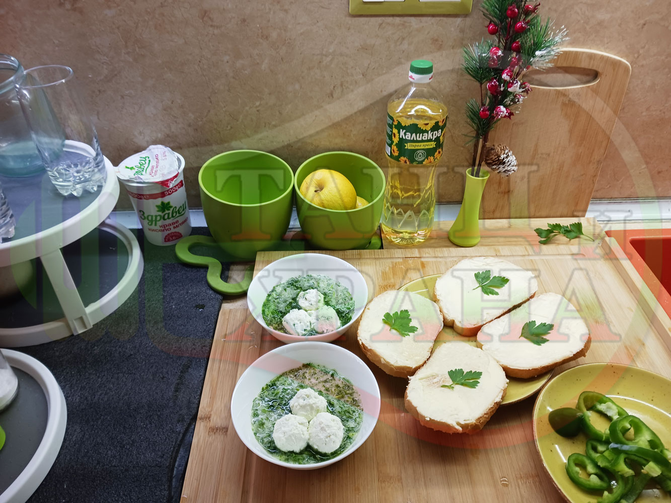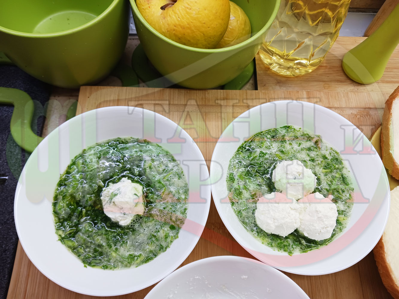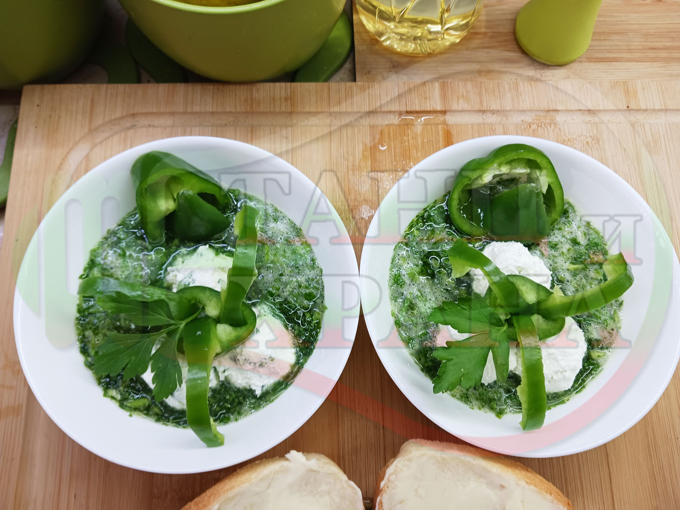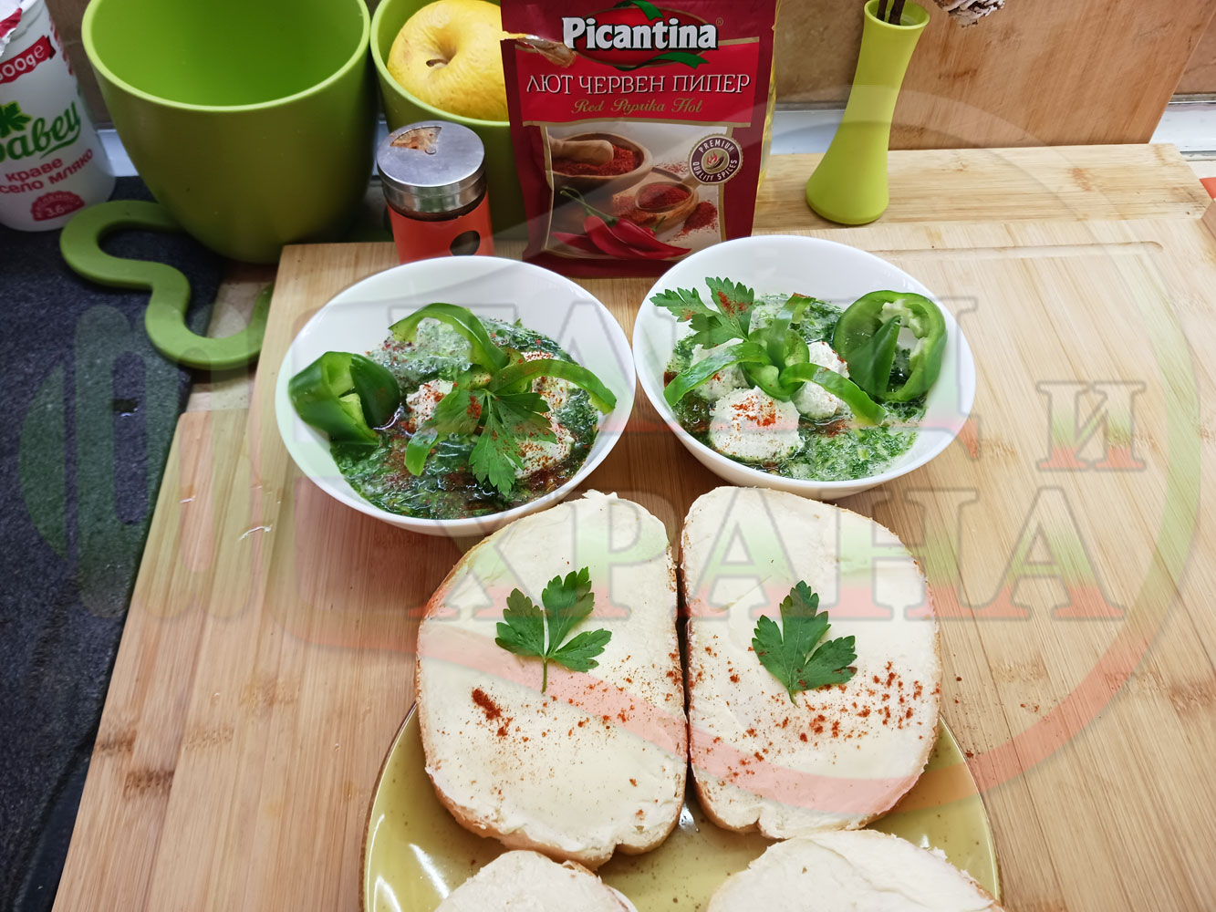 Българска магданозена сурова супа "Зеленочушкова зеленочайна с БГсирене" приготвена със свеж магданоз, зелени пресни чушки и зелен чай гарнирана с топчета от сиреново зеленочушков крем с краве бяло сирене (българско, саламурено) - двукомпонентна