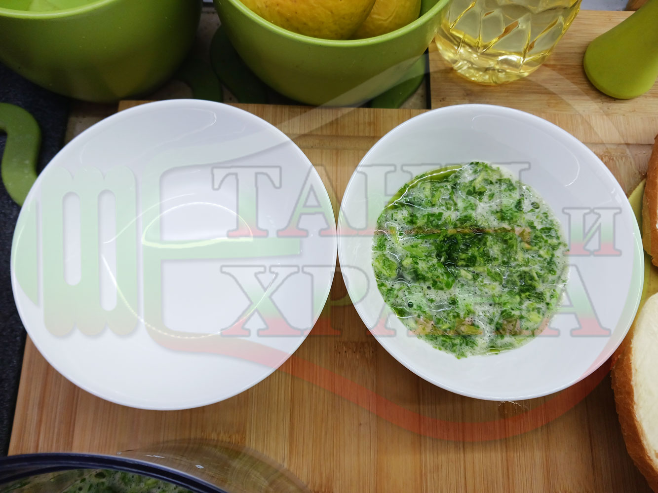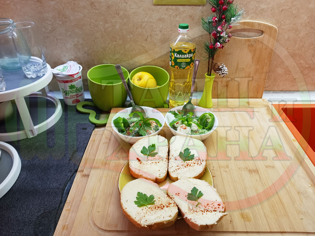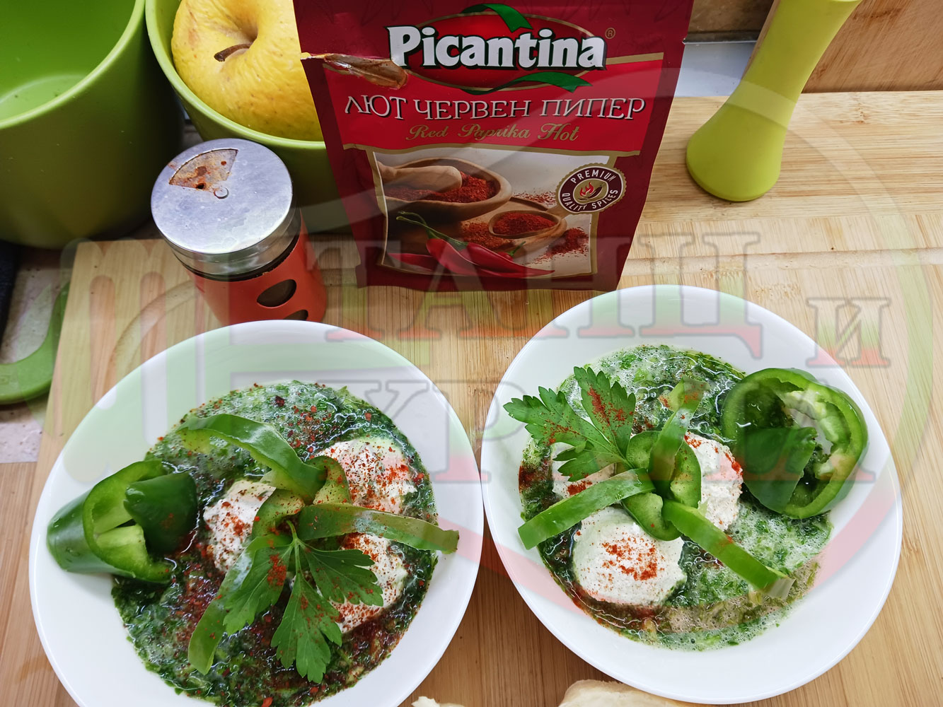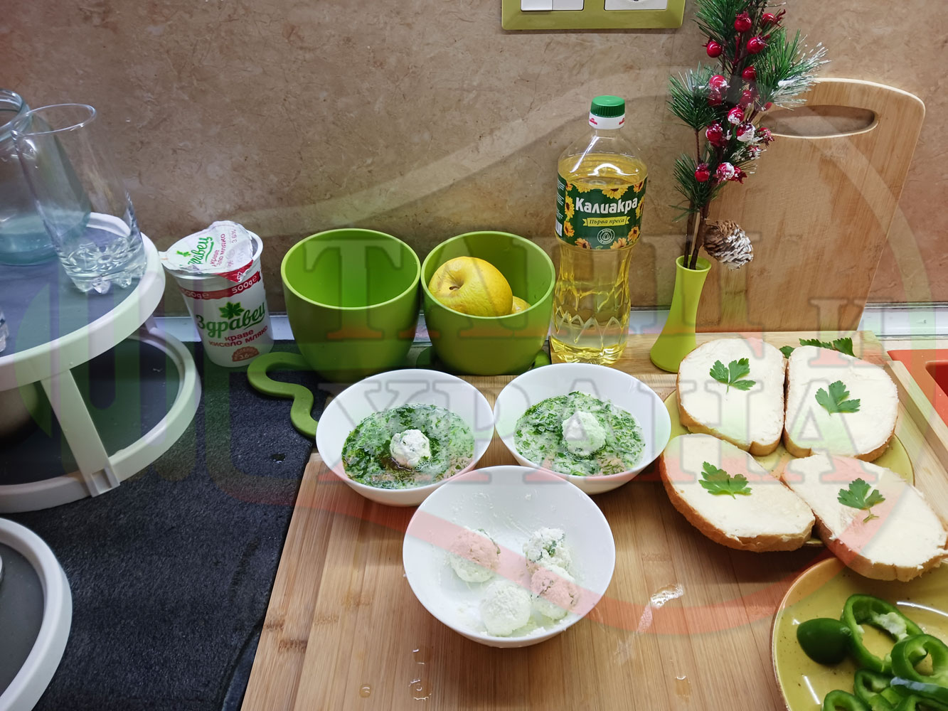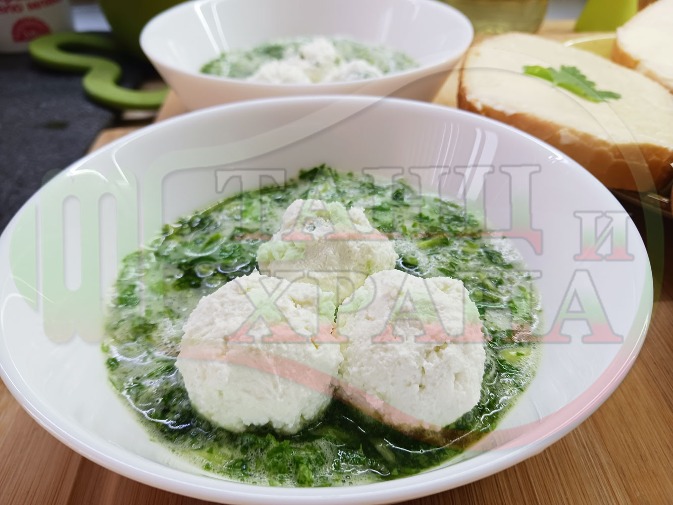 Българска магданозена сурова супа "Зеленочушкова зеленочайна с БГсирене" приготвена със свеж магданоз, зелени пресни чушки и зелен чай гарнирана с топчета от сиреново зеленочушков крем с краве бяло сирене (българско, саламурено) - двукомпонентна