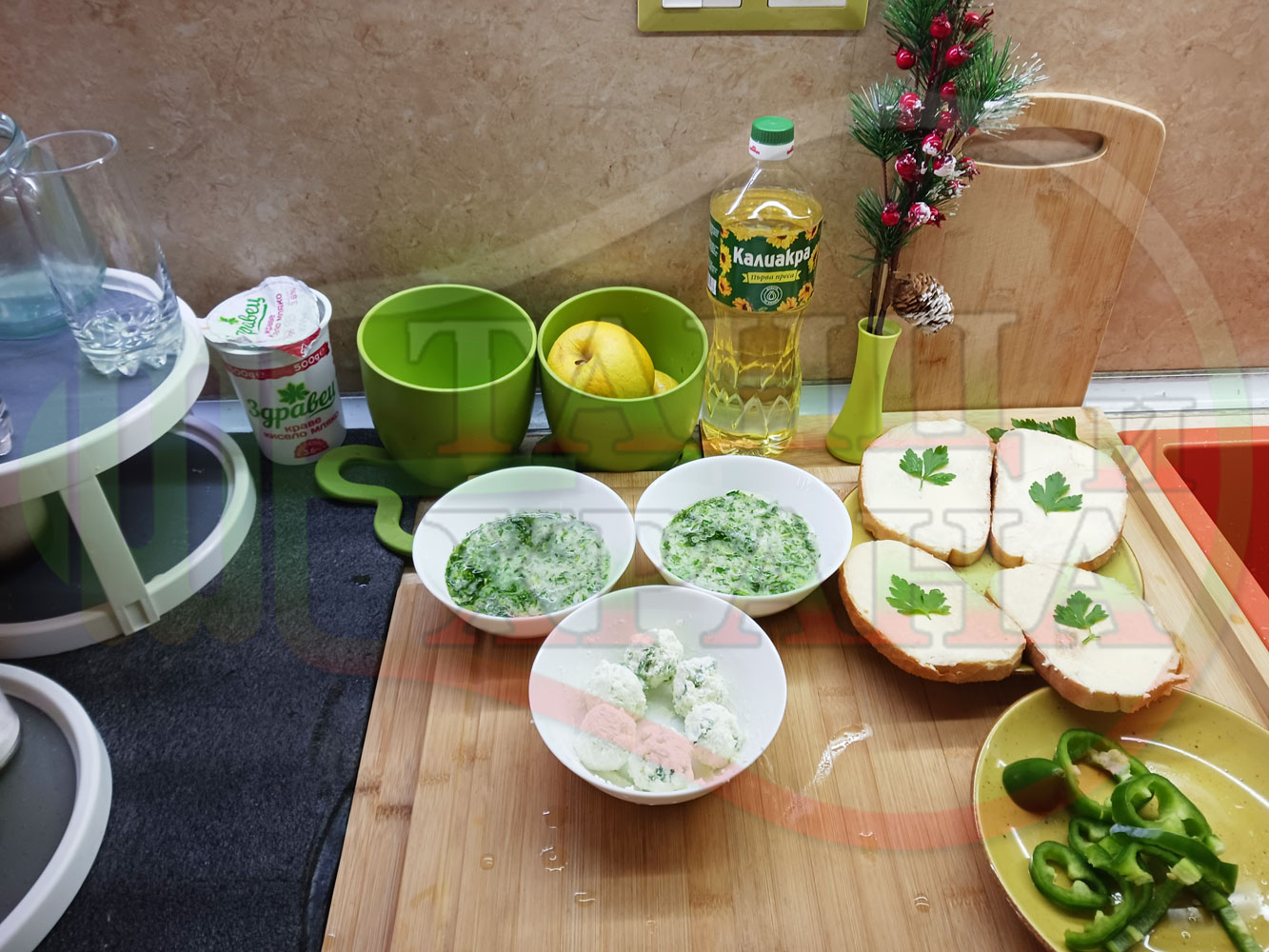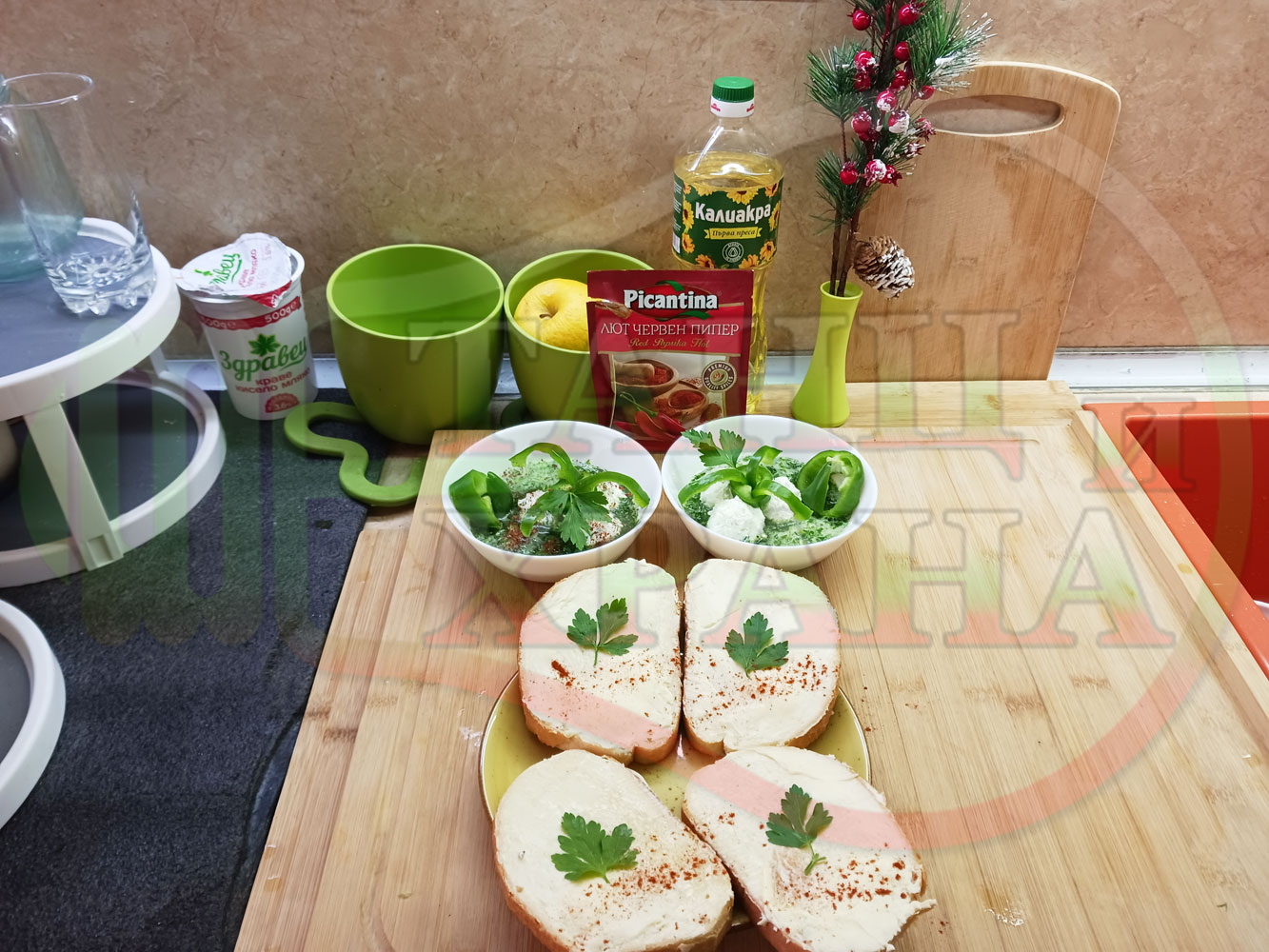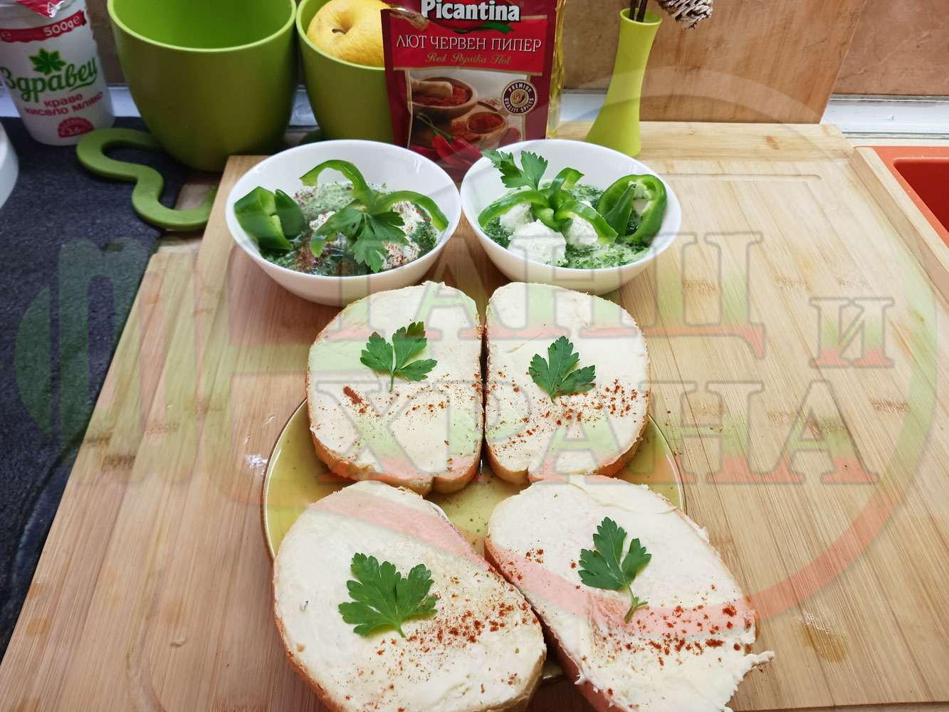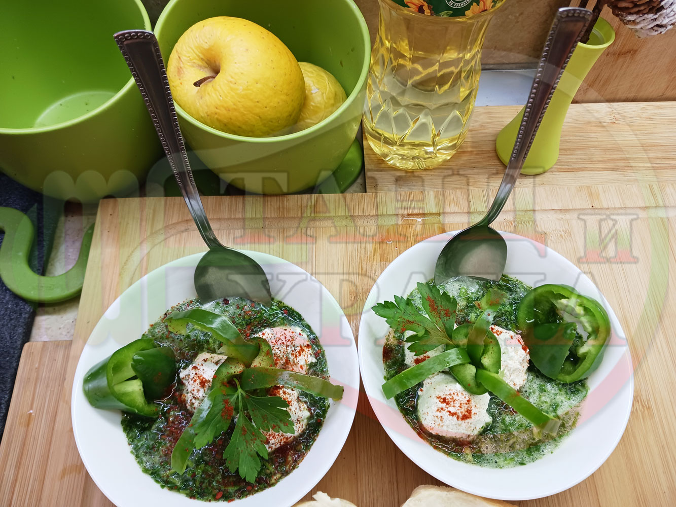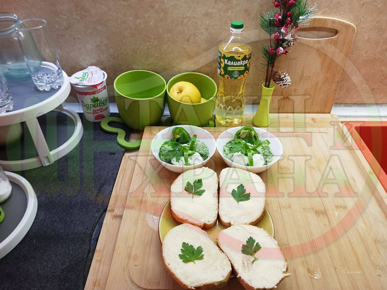 Българска магданозена сурова супа "Зеленочушкова зеленочайна с БГсирене" приготвена със свеж магданоз, зелени пресни чушки и зелен чай гарнирана с топчета от сиреново зеленочушков крем с краве бяло сирене (българско, саламурено) - двукомпонентна