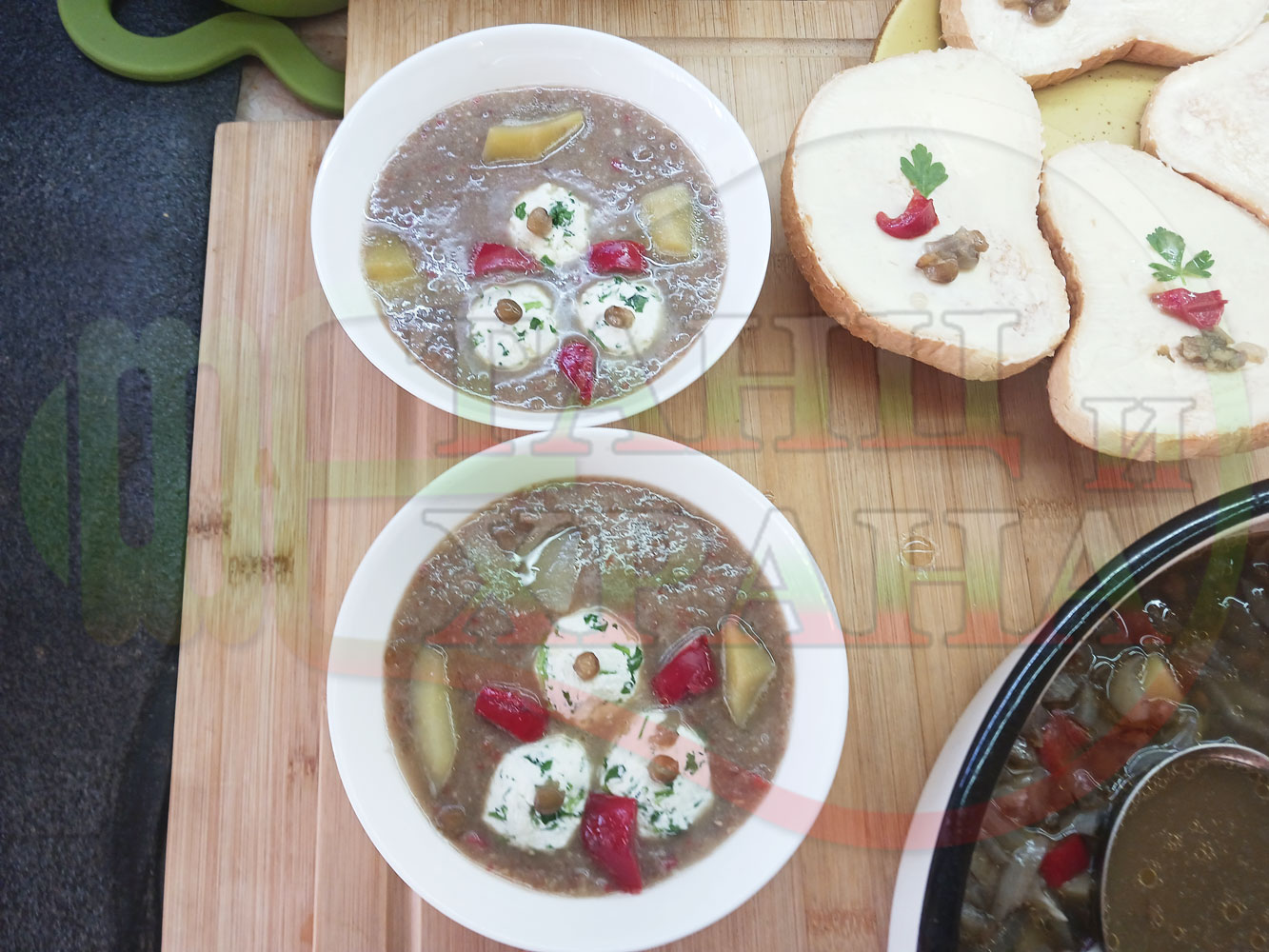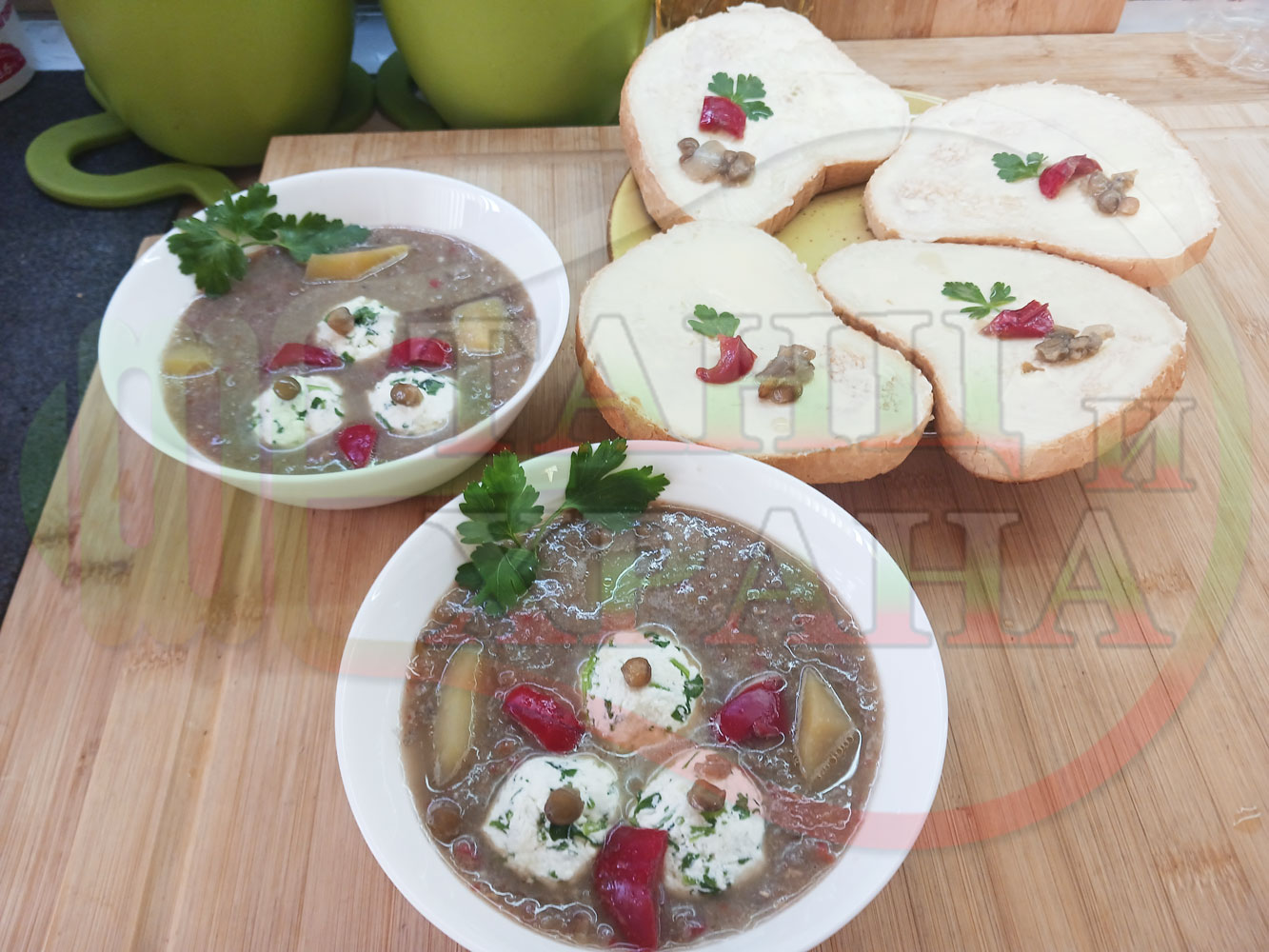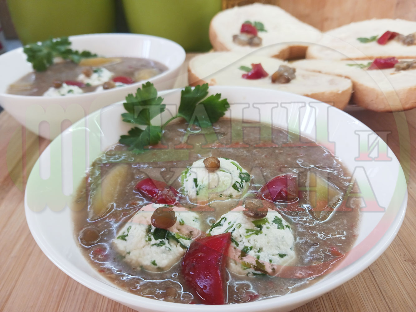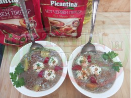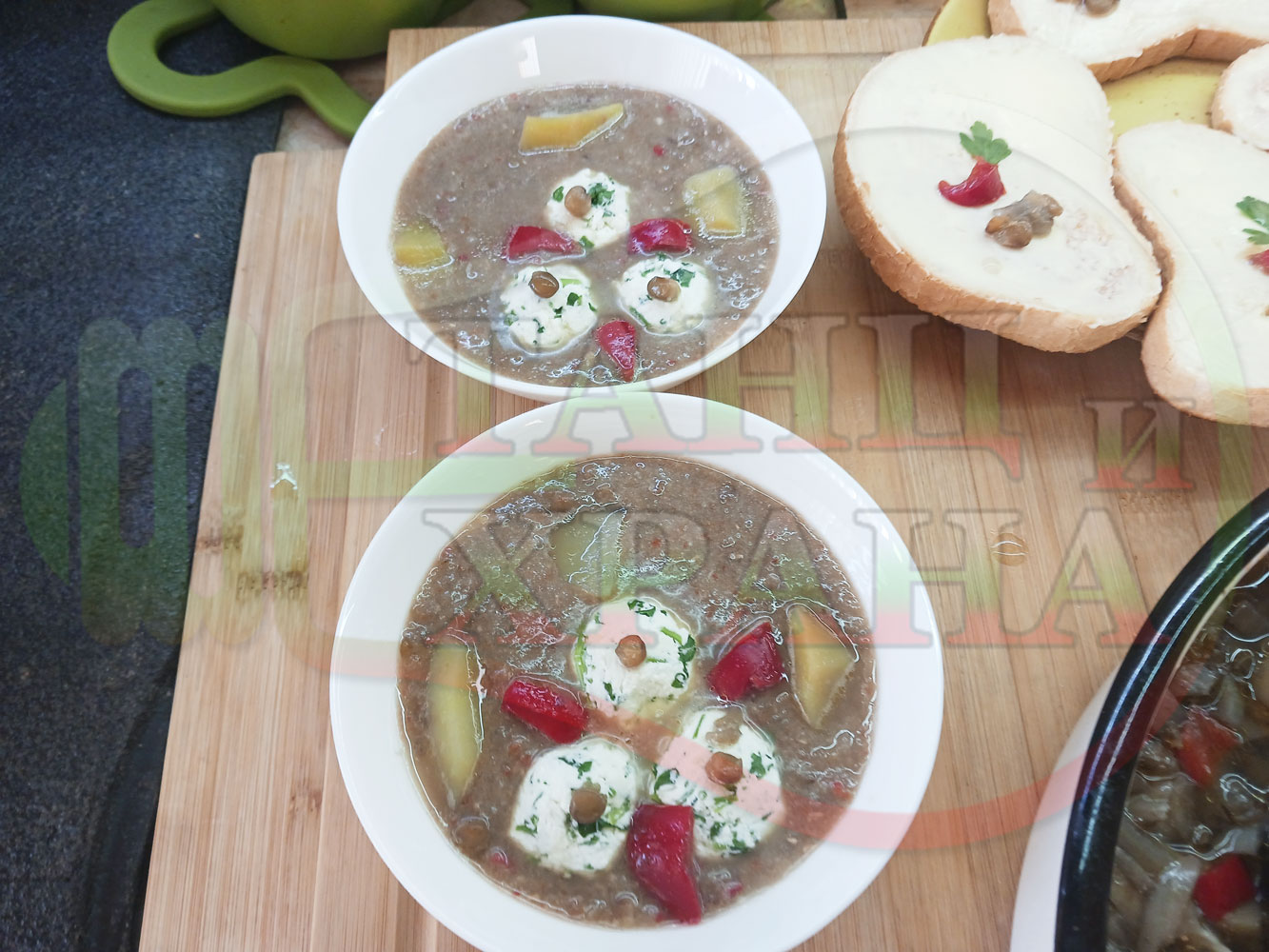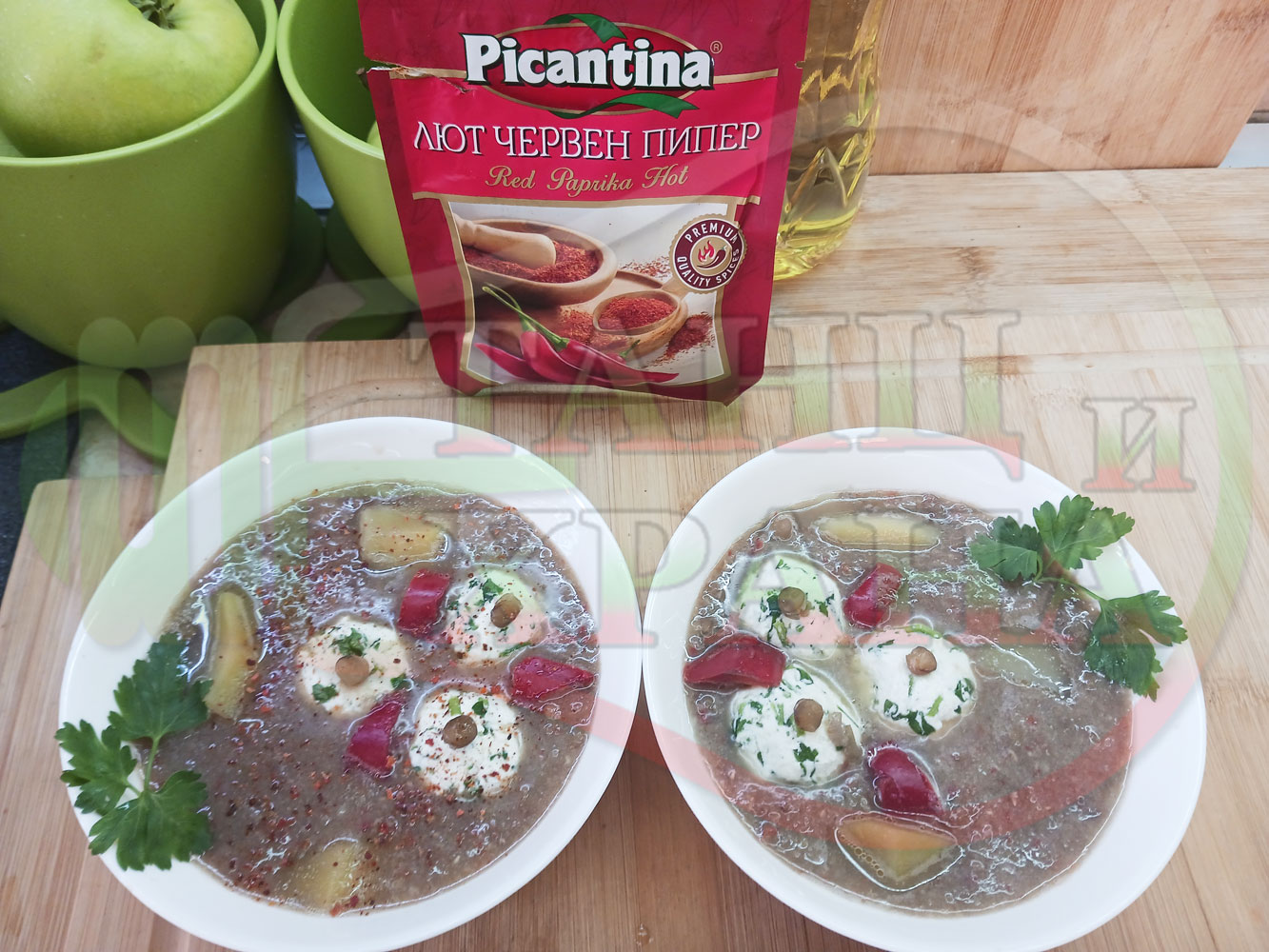 Българска производна леща "Лещеночервеночушкова картофена кромидлученочеснова с БГсирене" сварена на фурна с картофи, кромид лук, червени пресни чушки и стар чесън гарнирана с топчета от сиренов керм с магданоз, чесън и краве бяло сирене