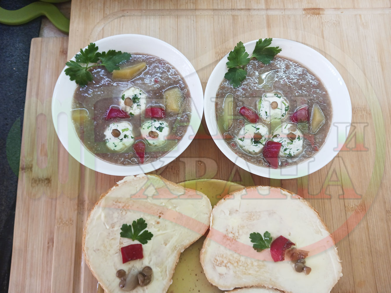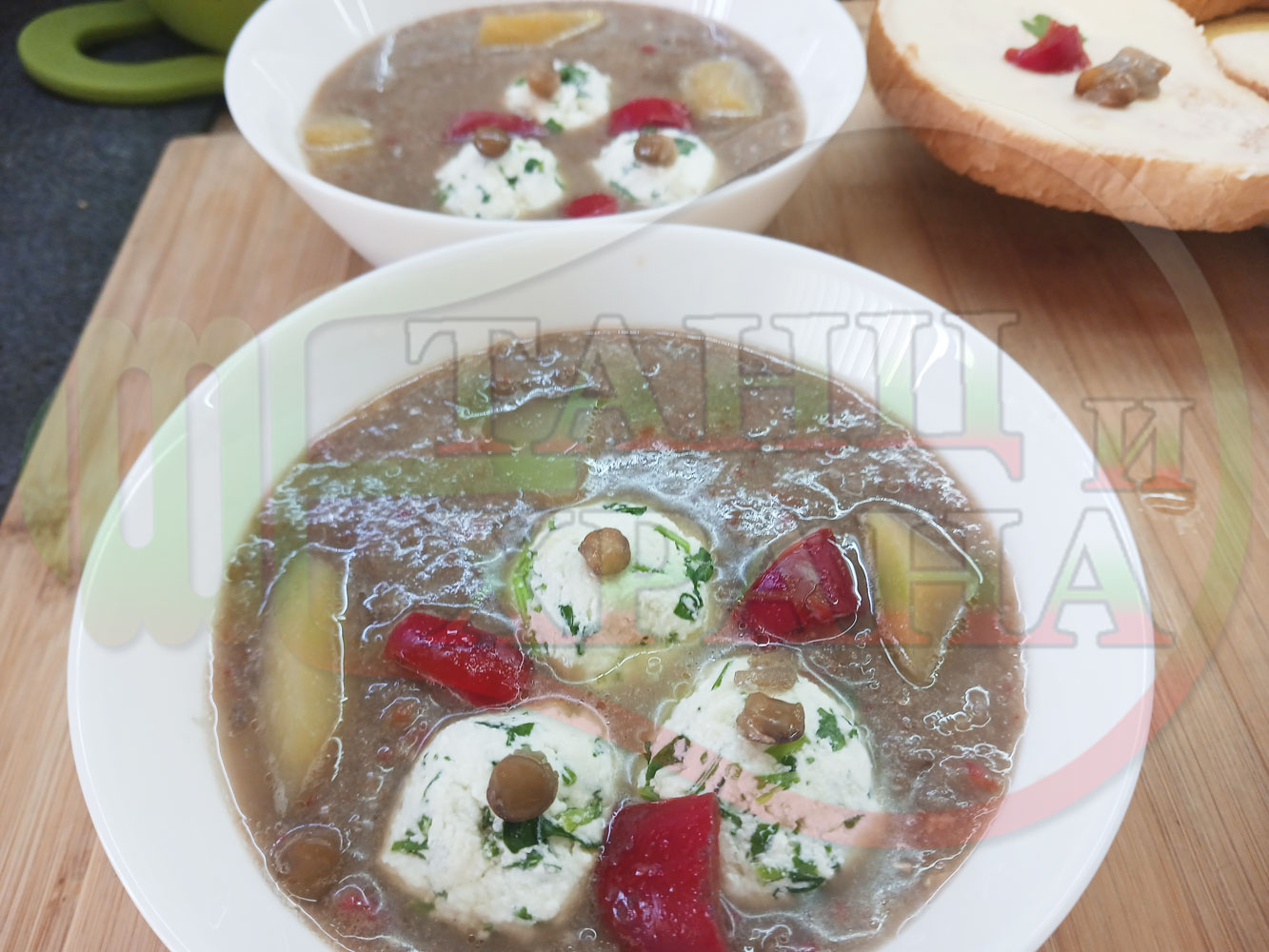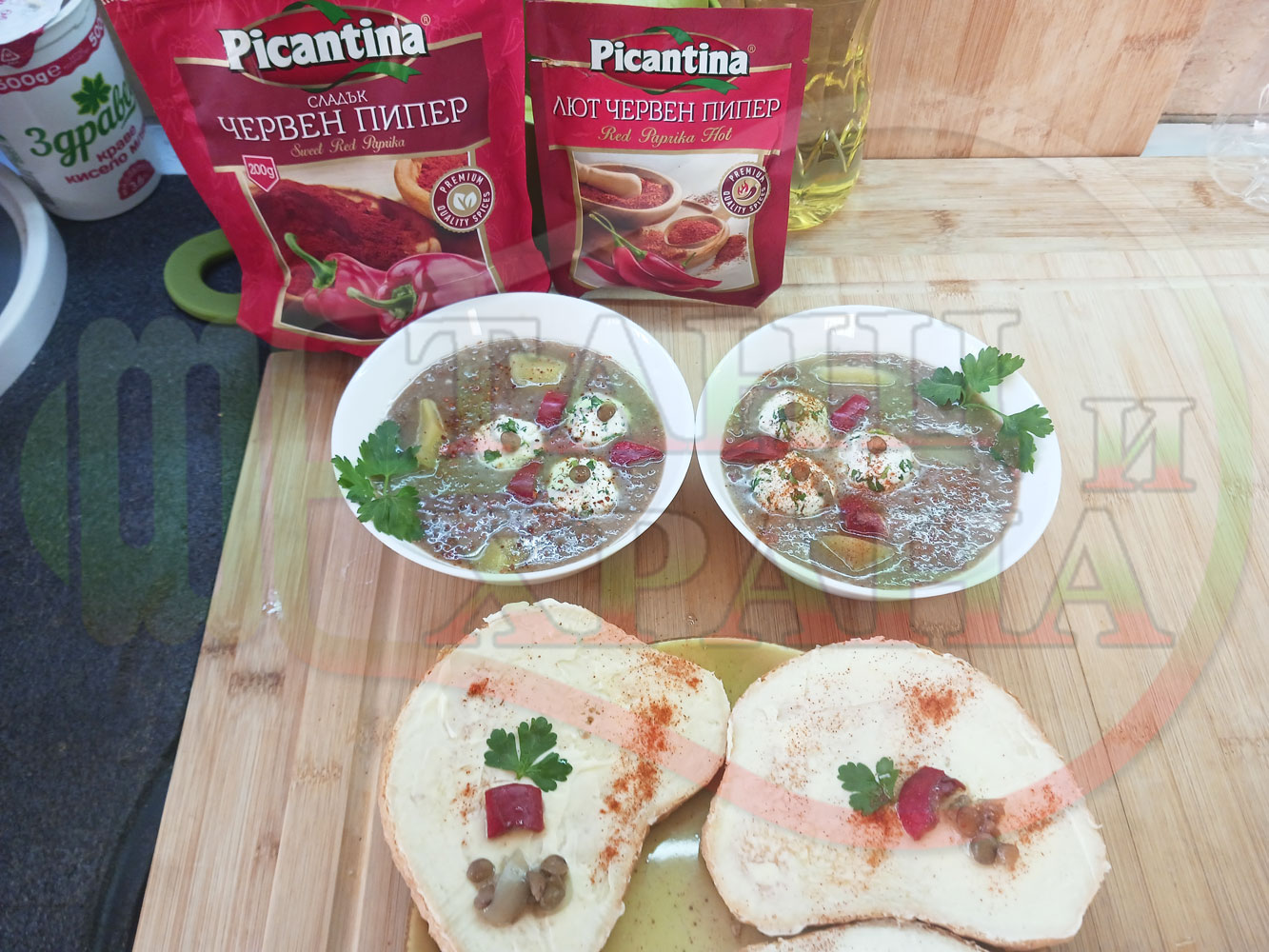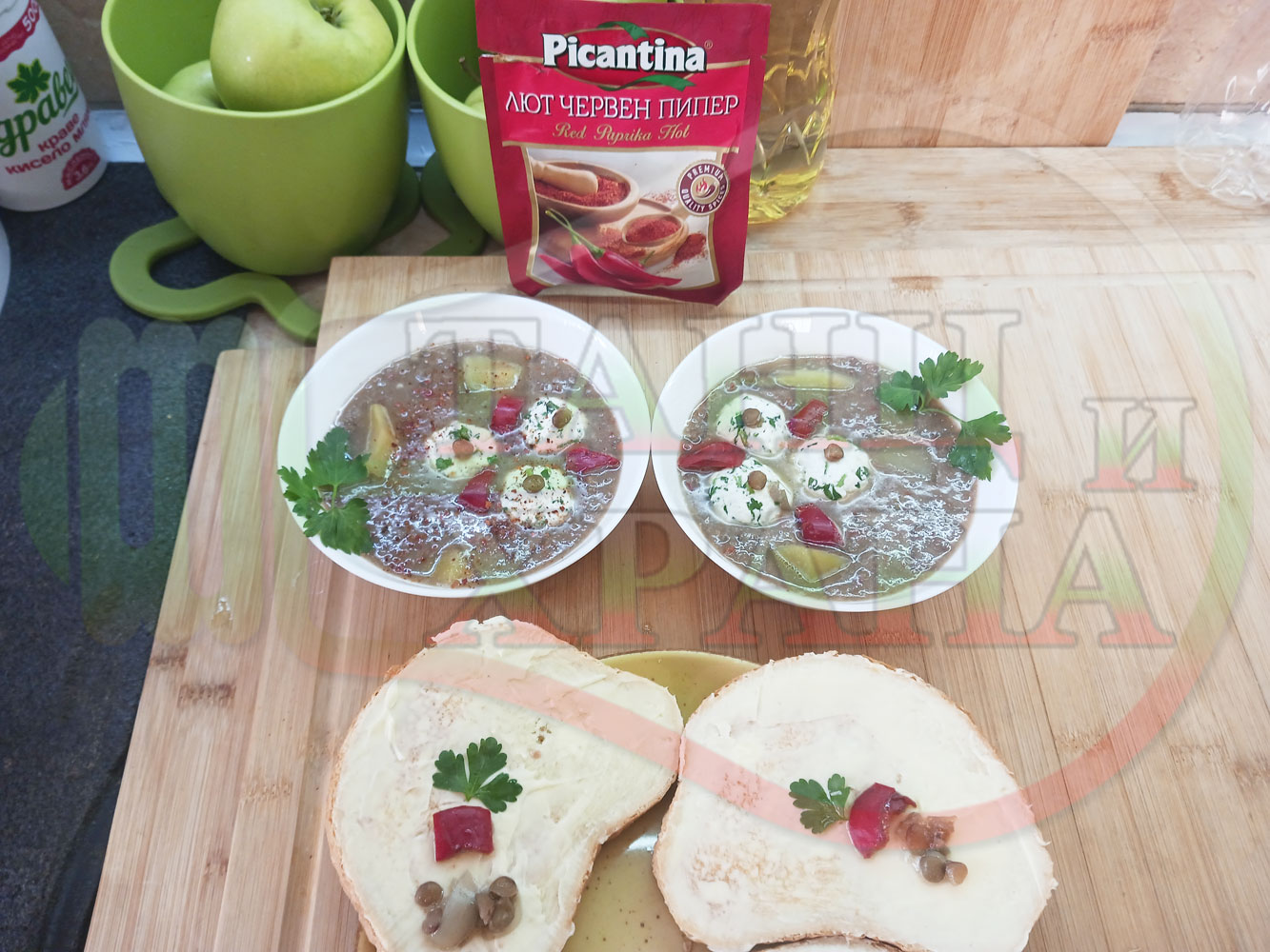Българска производна леща "Лещеночервеночушкова картофена кромидлученочеснова с БГсирене" сварена на фурна с картофи, кромид лук, червени пресни чушки и стар чесън гарнирана с топчета от сиренов керм с магданоз, чесън и краве бяло сирене