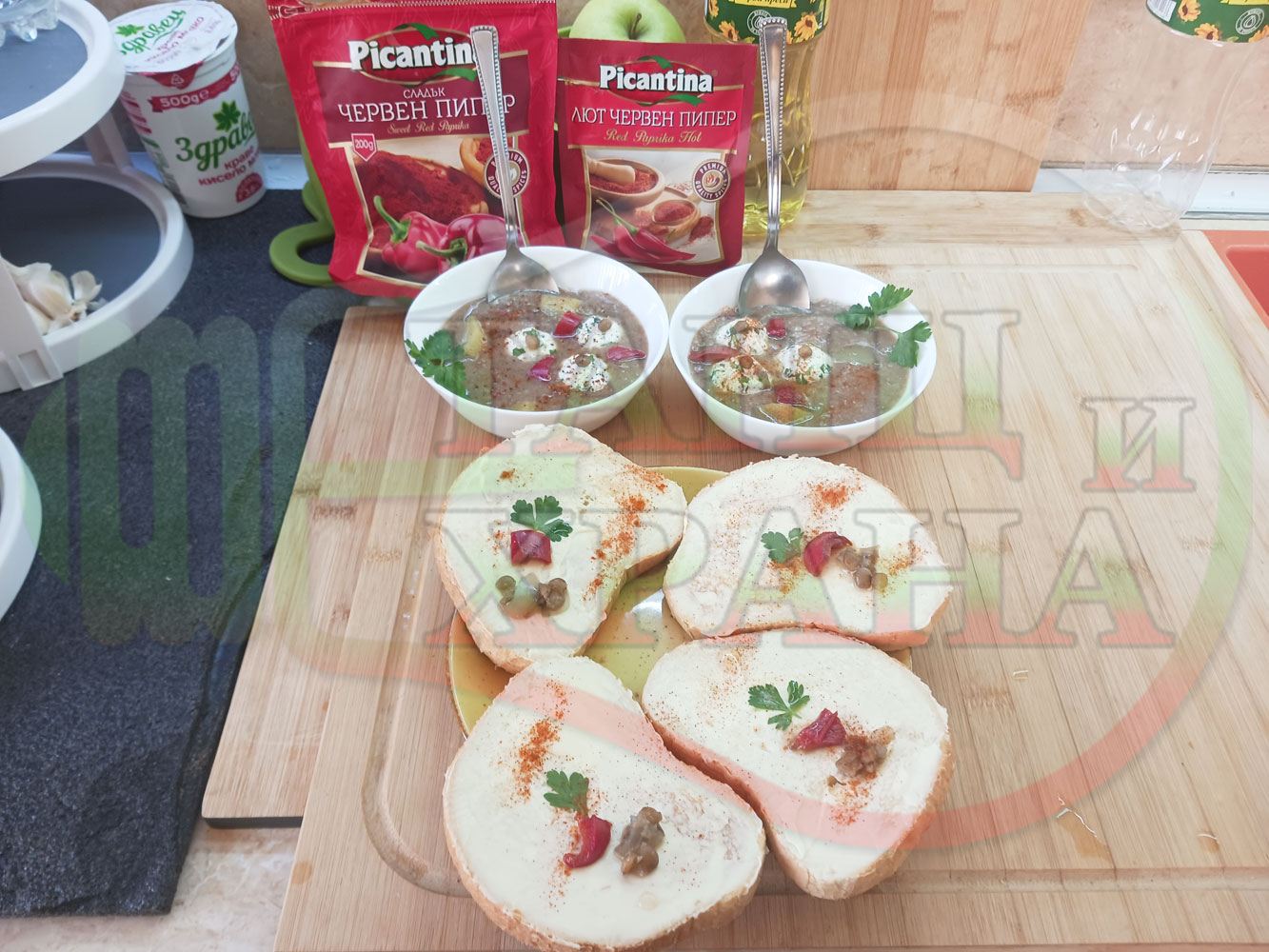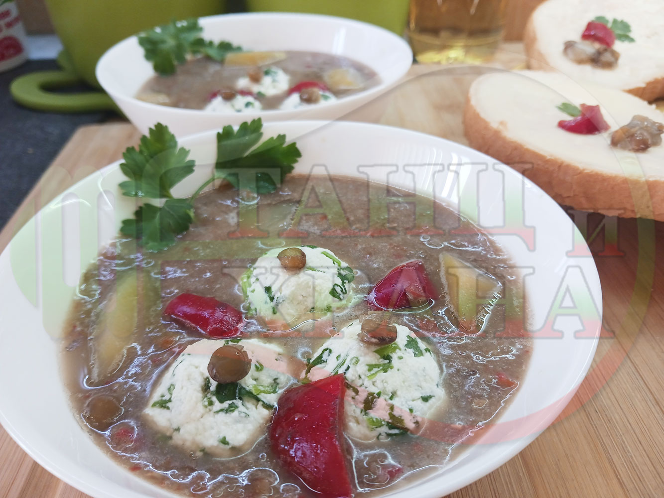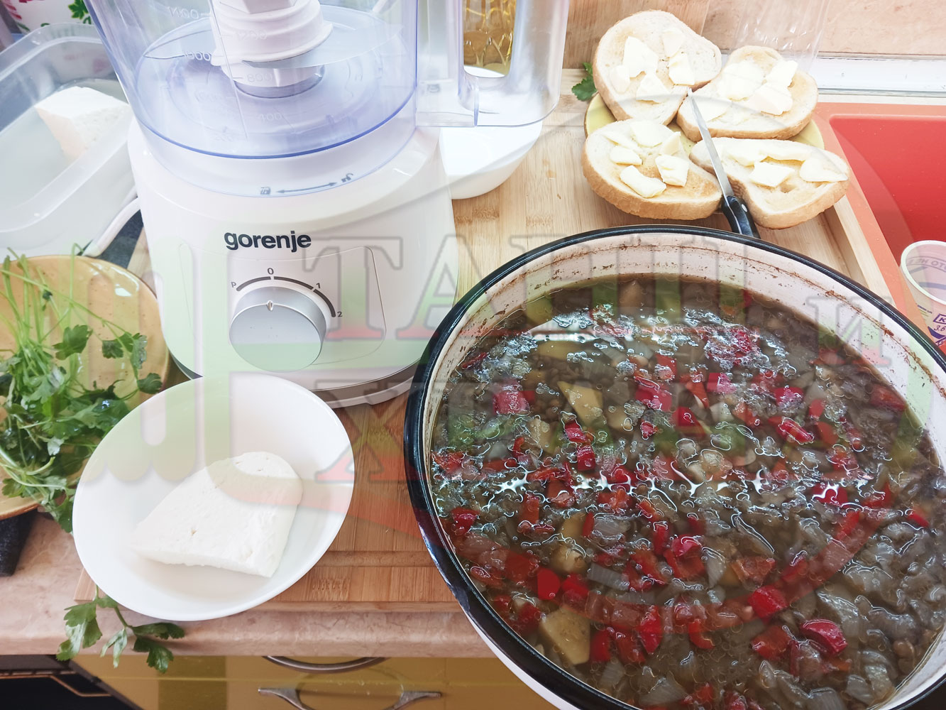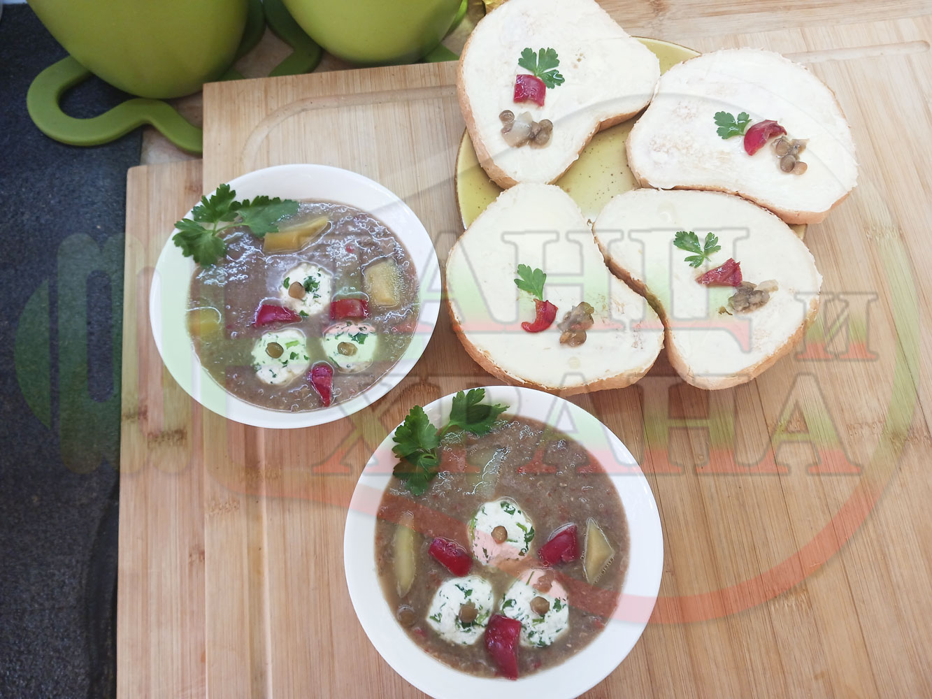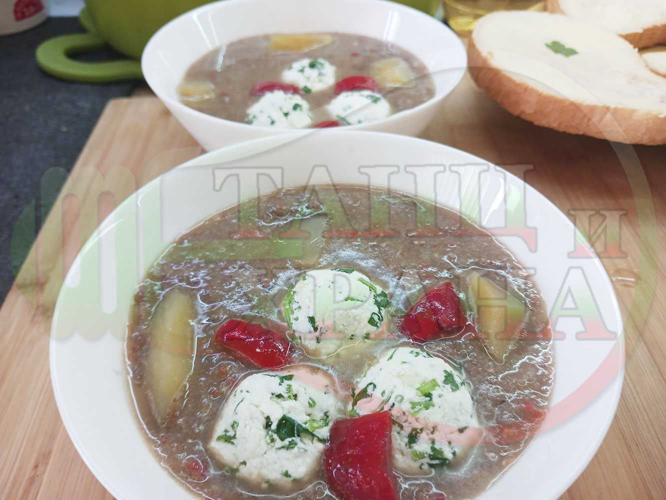 Българска производна леща "Лещеночервеночушкова картофена кромидлученочеснова с БГсирене" сварена на фурна с картофи, кромид лук, червени пресни чушки и стар чесън гарнирана с топчета от сиренов керм с магданоз, чесън и краве бяло сирене
