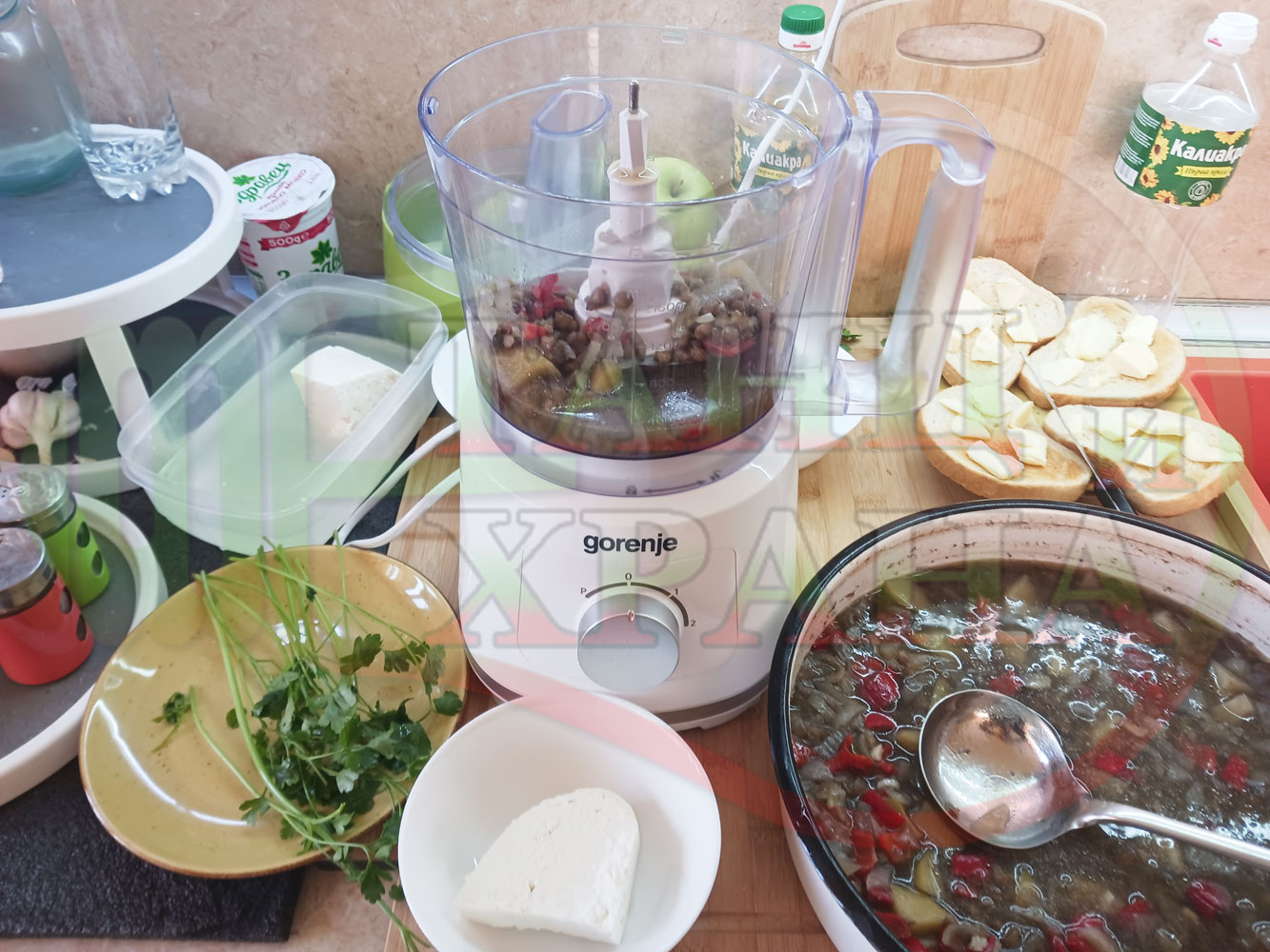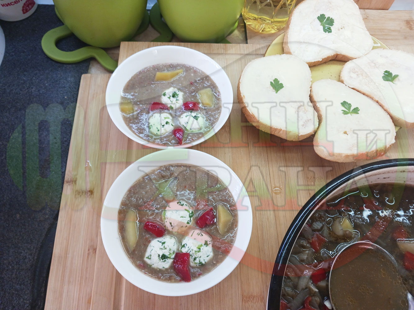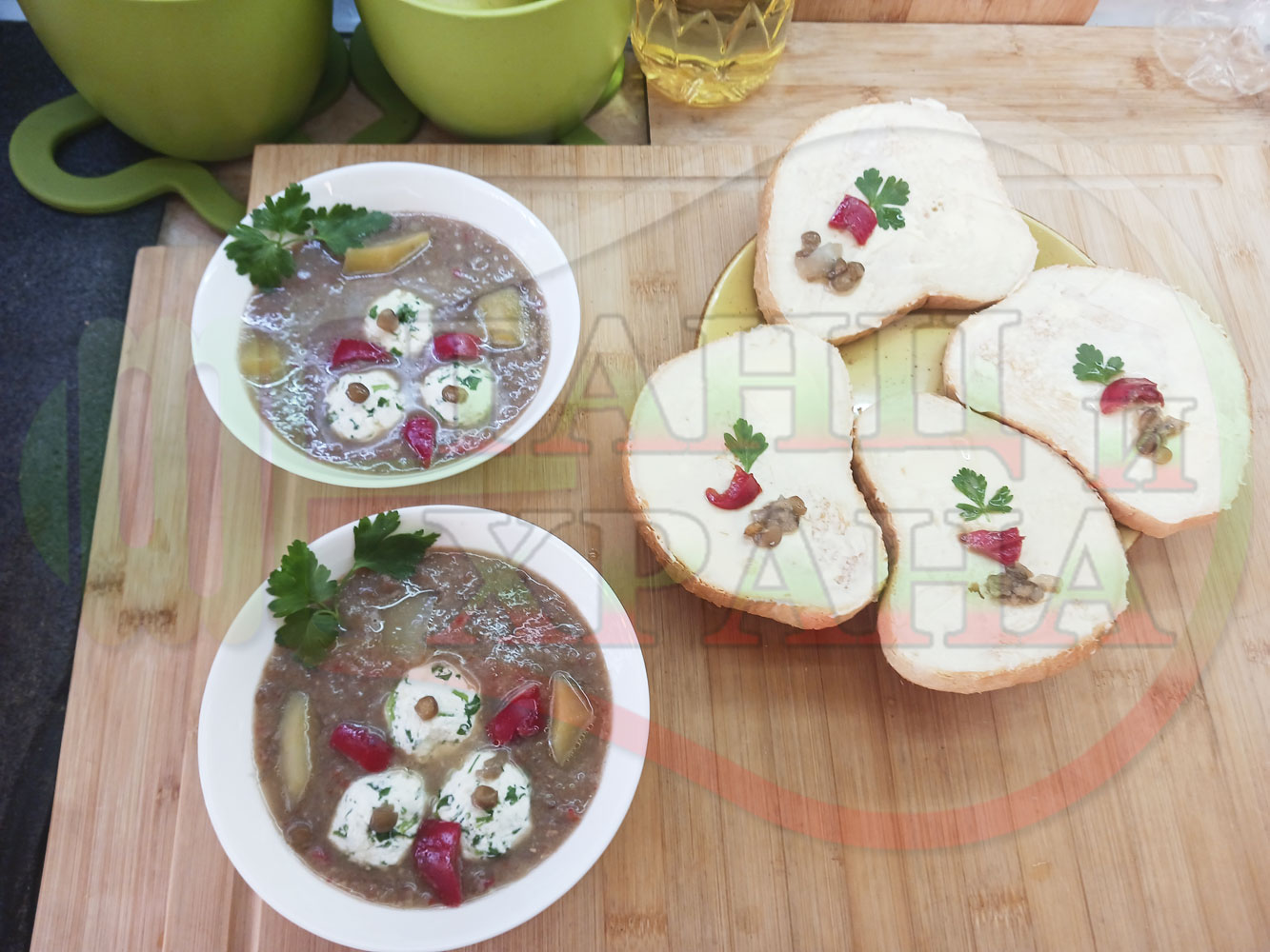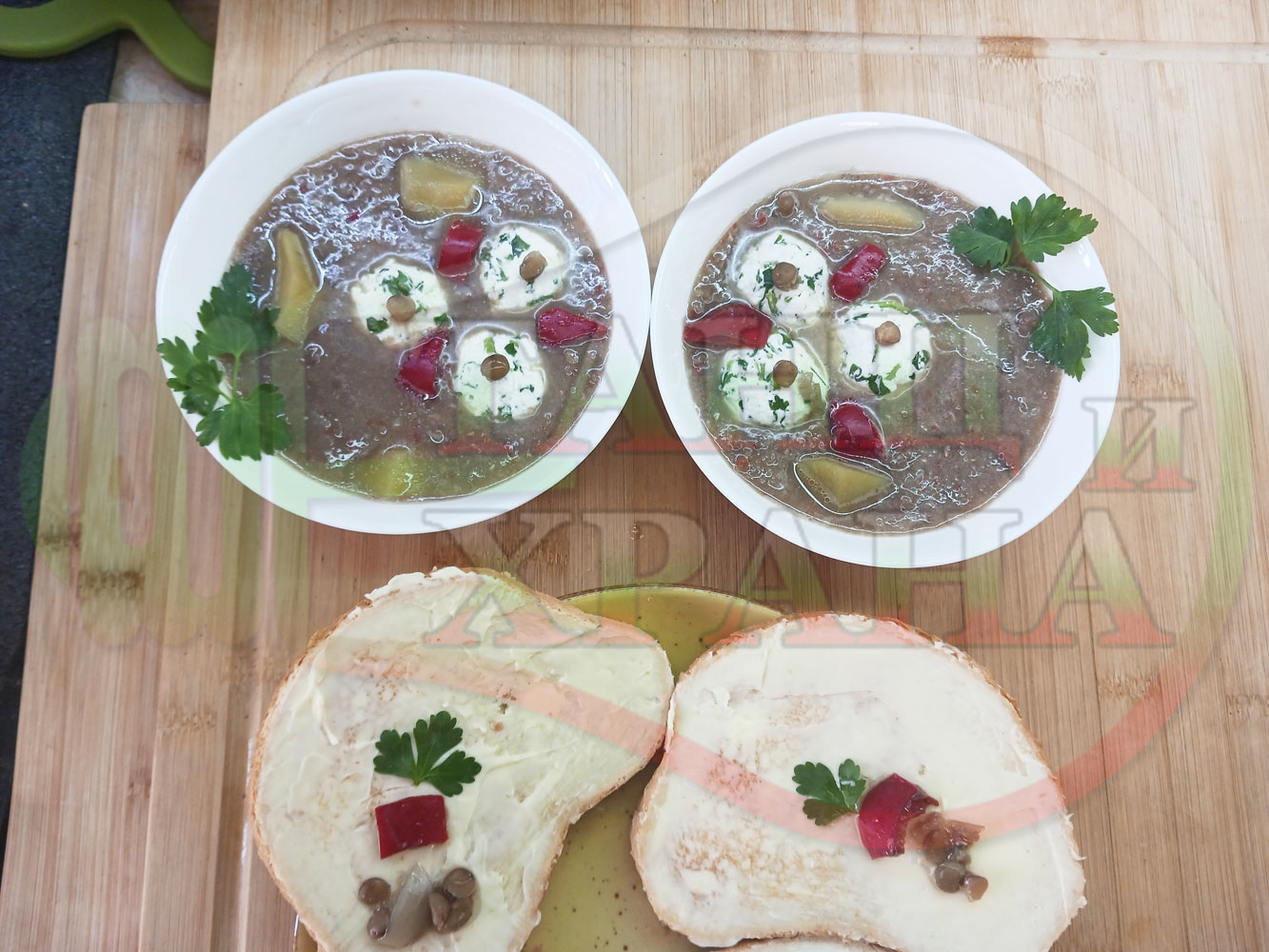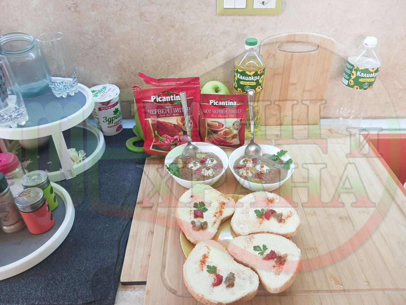 Българска производна леща "Лещеночервеночушкова картофена кромидлученочеснова с БГсирене" сварена на фурна с картофи, кромид лук, червени пресни чушки и стар чесън гарнирана с топчета от сиренов керм с магданоз, чесън и краве бяло сирене