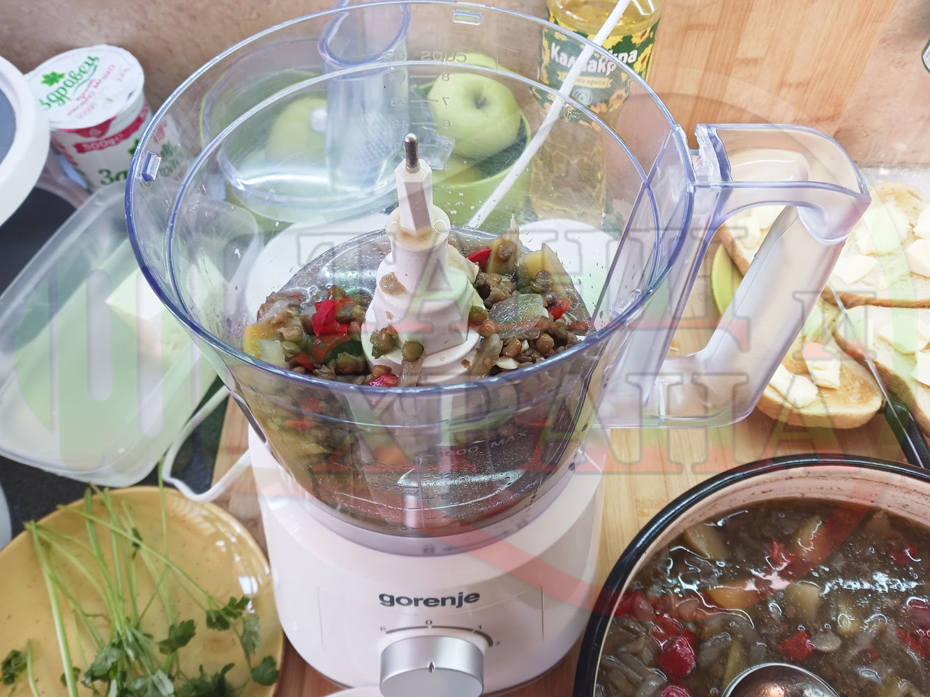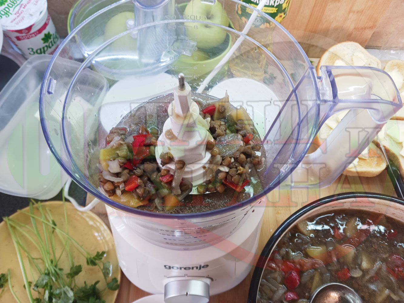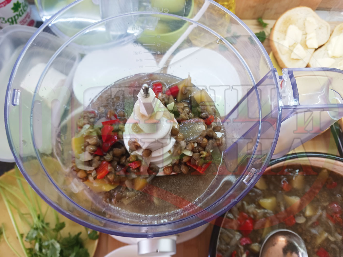 Сипете 5 средно големи черпака от сварената постна леща в чопър и разбийте с чопъра продуктите до образуване на средно гъста лещена, хомогенизирана супа (лещена супа).