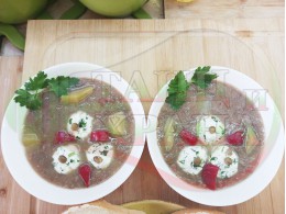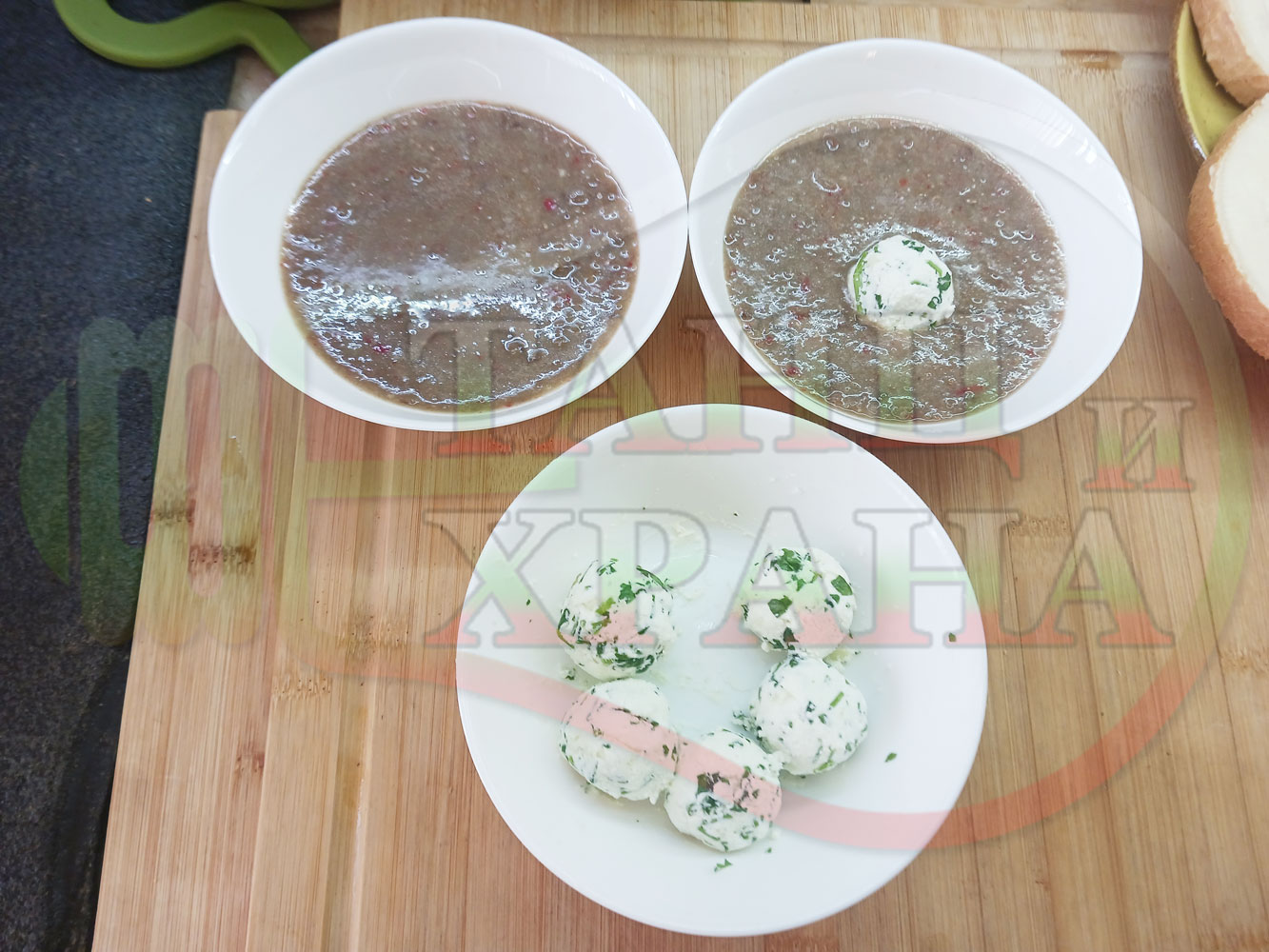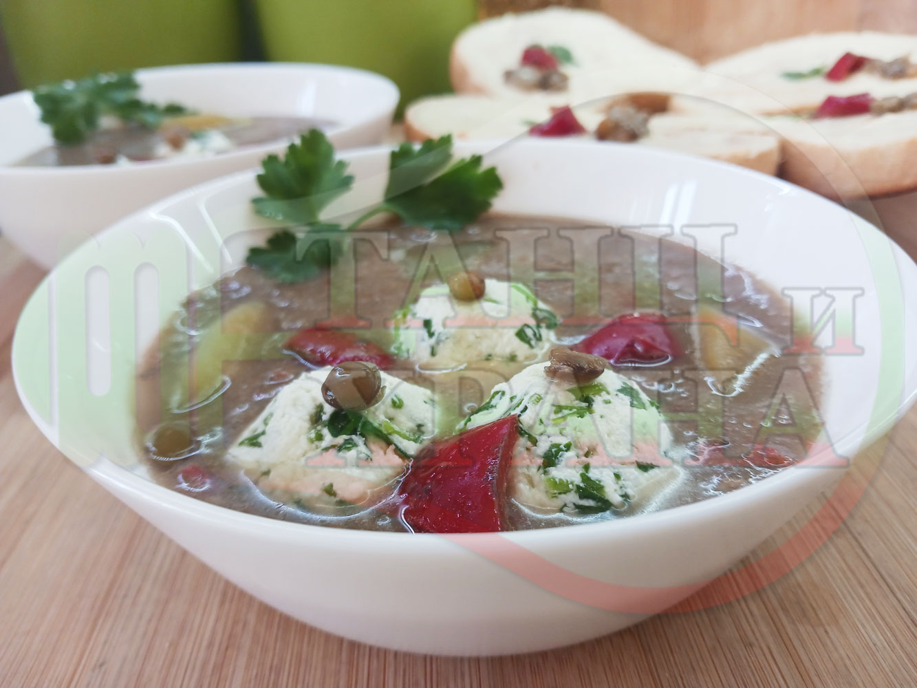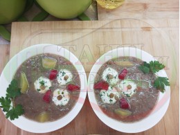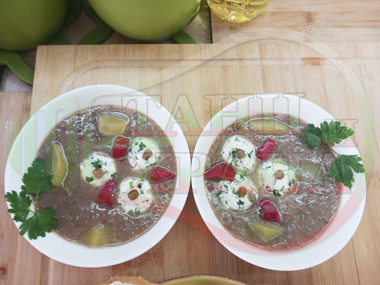 Спретнах изключително вкусна непостна студена производна леща от основно сварената постна леща с картофи, червени пресни чушки, кромид лук и стар чесън "Лещеночервеночушкова картофена кромидлученочеснова" (снимките от сваряването на основната постна леща са към рецептата за лещата). Гарнирах студената лещена супа със сиренови топчета, приготвени от сиренов магданозеночеснов крем със свеж магданоз, стар чесън и бълграско краве бяло саламурено сирене. Сиреновите топчета се разтварят постепенно в лещената производна постна супа, напоявайки я с вкусната саламура от сиренето и свежестта на пресния магданоз с едва доловимата пикантна нотка на чесъна и отново се получи невероятна вкусно, вкусна, вкусотия (вкуснотия).
