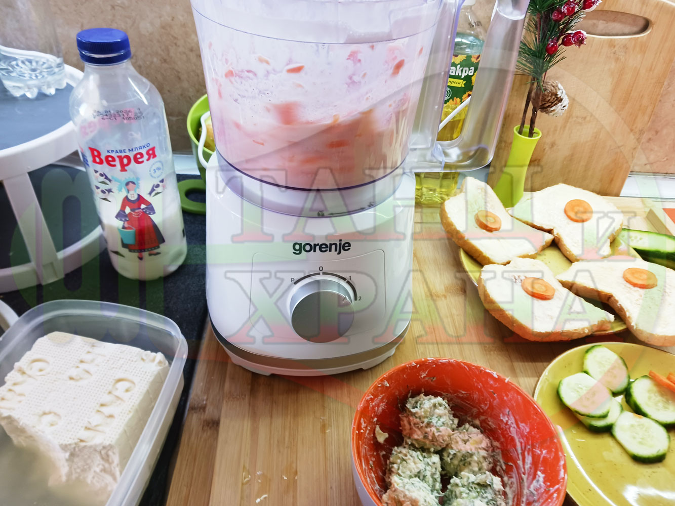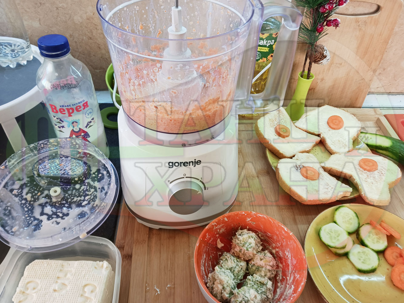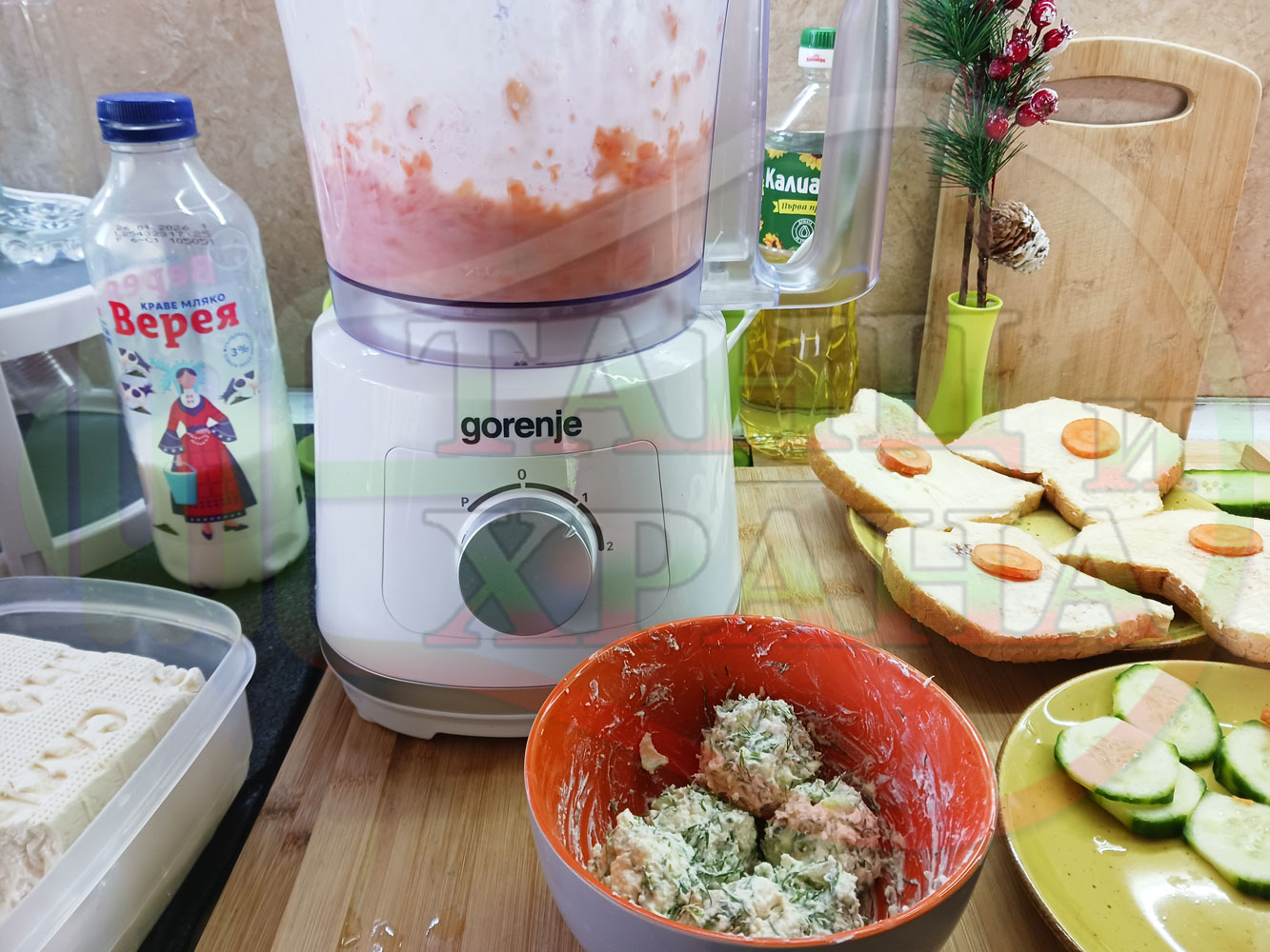 ПРОДУКТИ: Приблизителни количества за българска сурова гъста супа "Морковена прясномлечна краставичнокопърова с БГсирене" приготвена от моркови и прясно мляко гарнирана с топчета от сиренов крем с копър, краставици, чесън и краве бяло сирене (българско, саламурено) - двукомпонентна