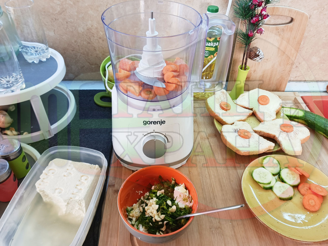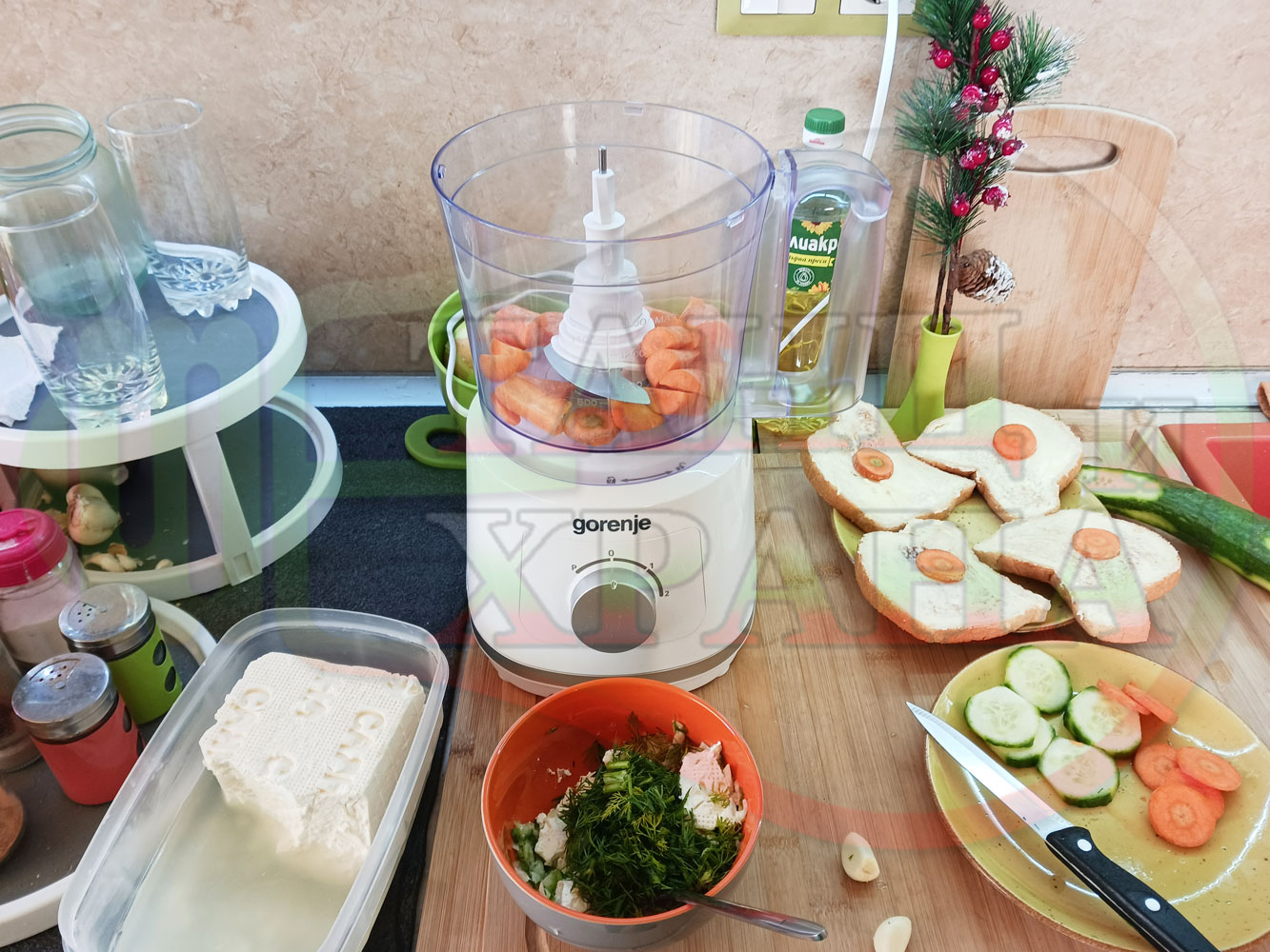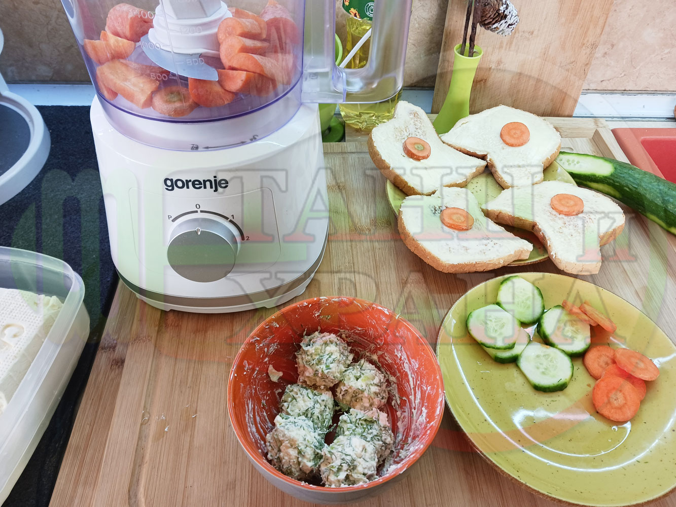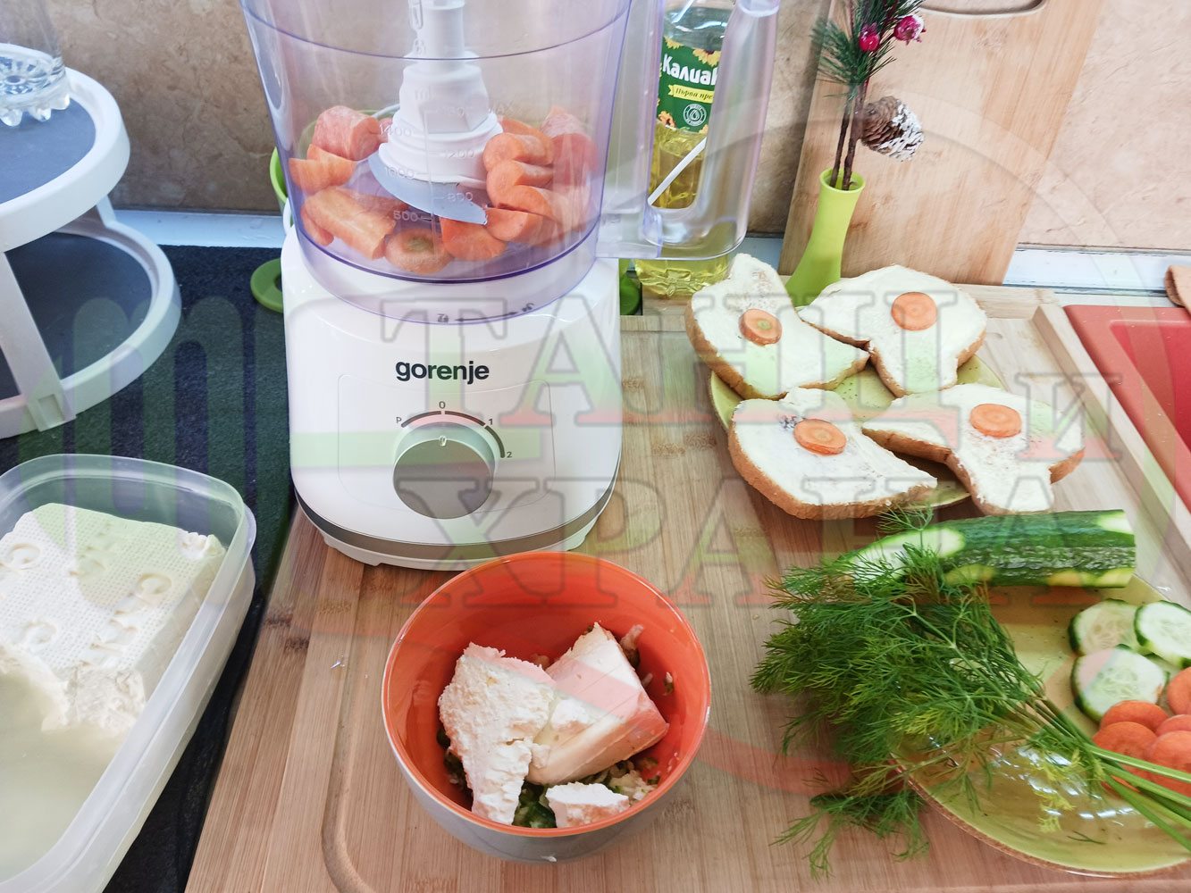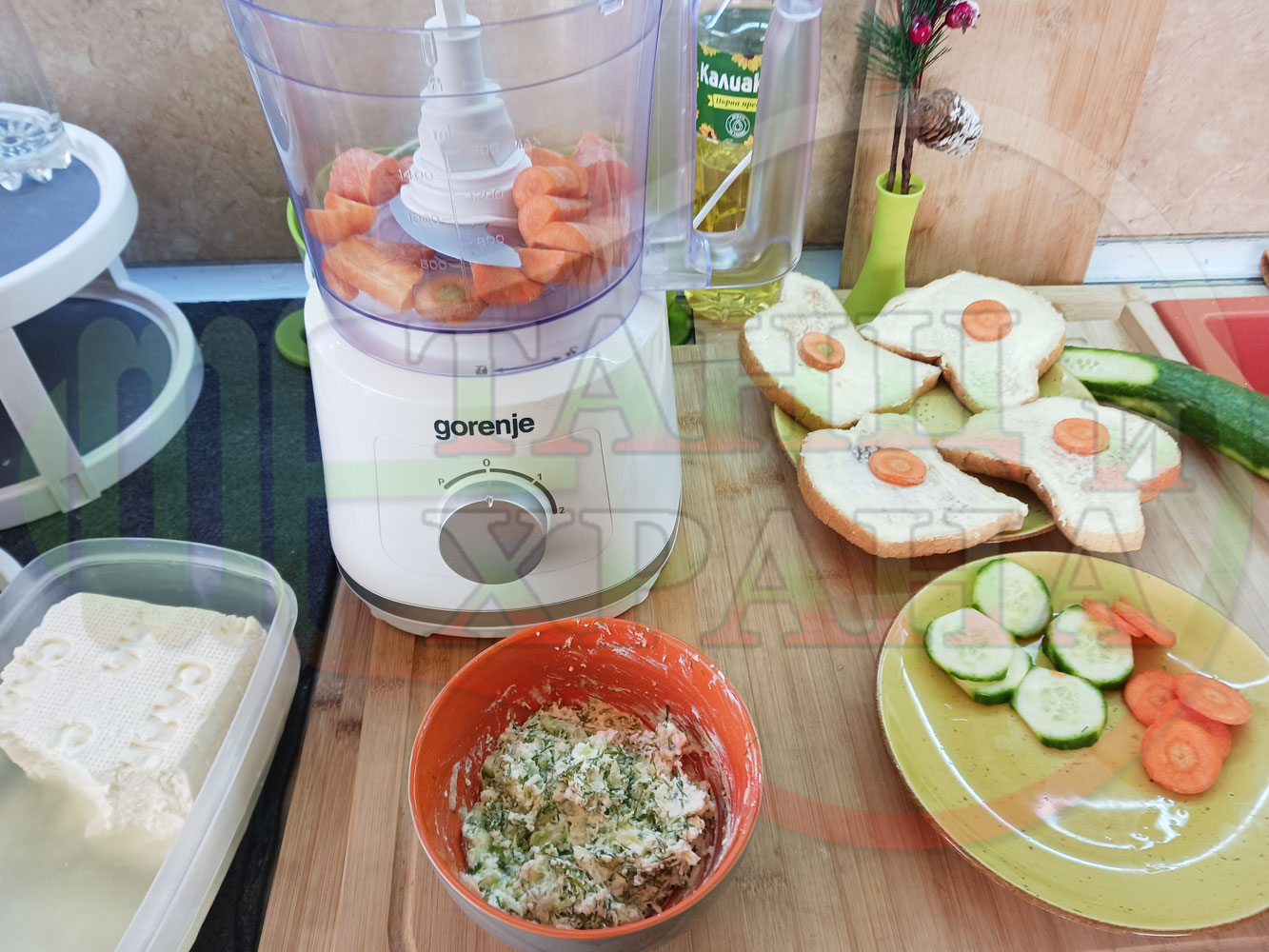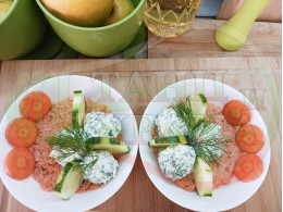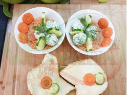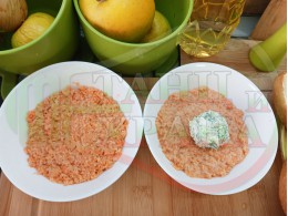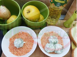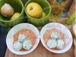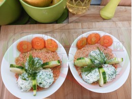 Българската морковена сурова гъста супа, която сътворих се оказа доста вкусна и се спретва буквално за "нула" време с чопър. Гарнирах супата с топчета от сиреново краставичен крем приготвени с пресни краставици, копър, чесън и българско краве бяло саламурено сирене и се получи най-вкусната сурова супа, която сме хапвали (поредната най-вкусна сурова супа (всичките сурови супи са вкусни по свой си начин според продуктите, които са включени в тях)). Двукомпонентността на супите (в голямата си част са авторски с иновативен метод на представяне и комбиниране на продуктите (прилагам метода на двукомпонентността в почти всички видове ястия, които приготвям)), позволява да се комбинират различни сурови и/или запечени продукти, с което се осъвременяват и обогатяват традиционни български супи, ястия, печива и различни гозби. Сиреновите топчета овкусяват супата с неповторимия вкус, който носят в идеална хармония с морковената супа и за пореден път се получи голяма вкусно, вкусна, вкусотия (вкуснотия), която е изключително полезна, обединяваща млечните протеини, минерали и микроелементи от прясното мляко и сиренето с богатството от полезни съставки на морковите, краставицата, копъра и чесъна. ![]()