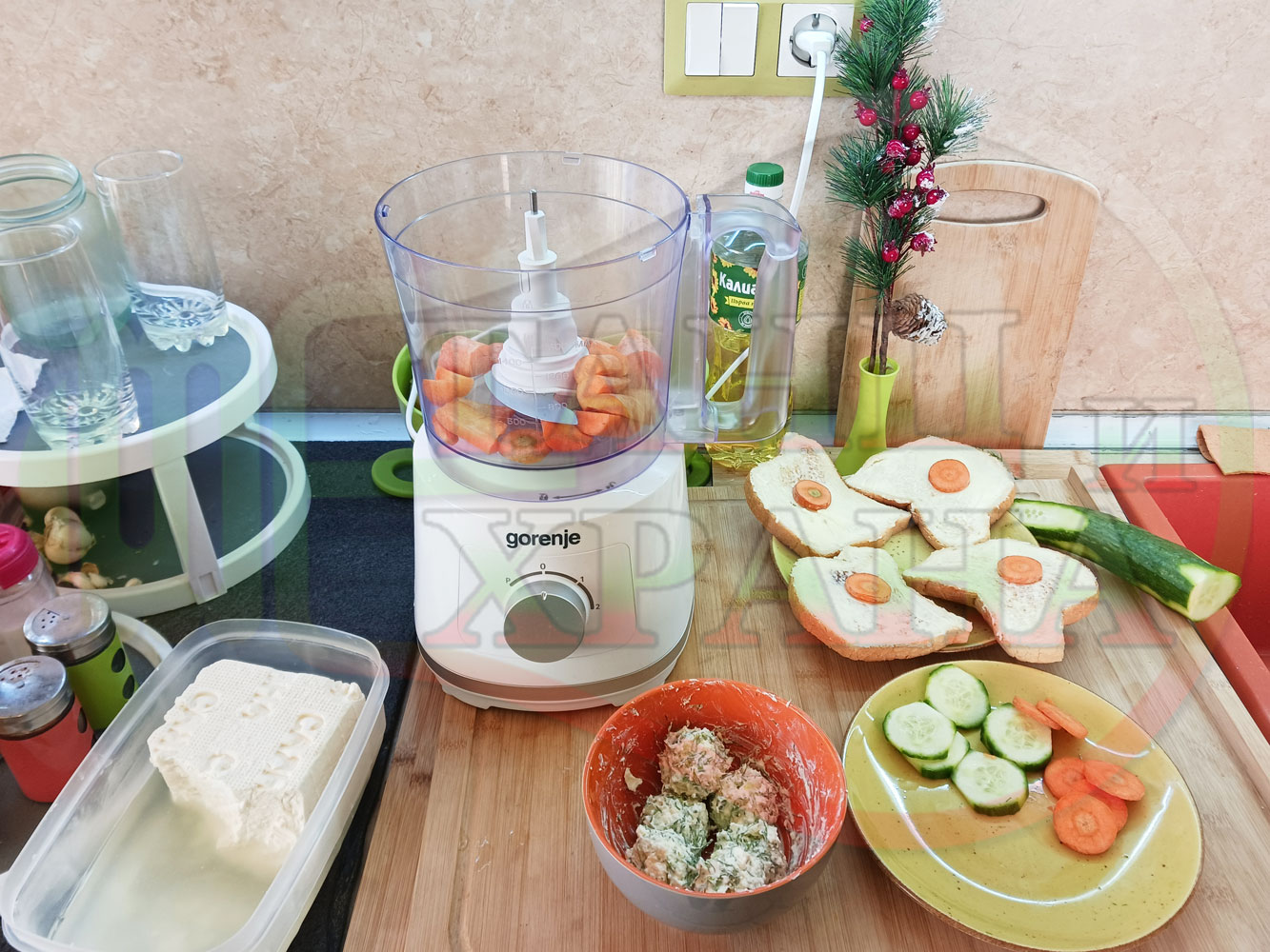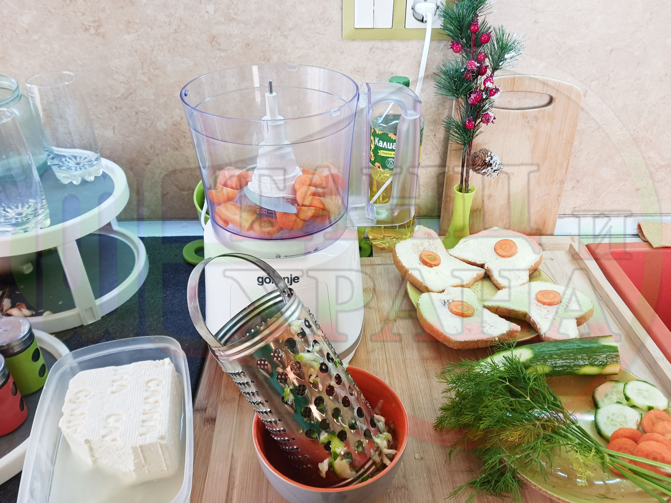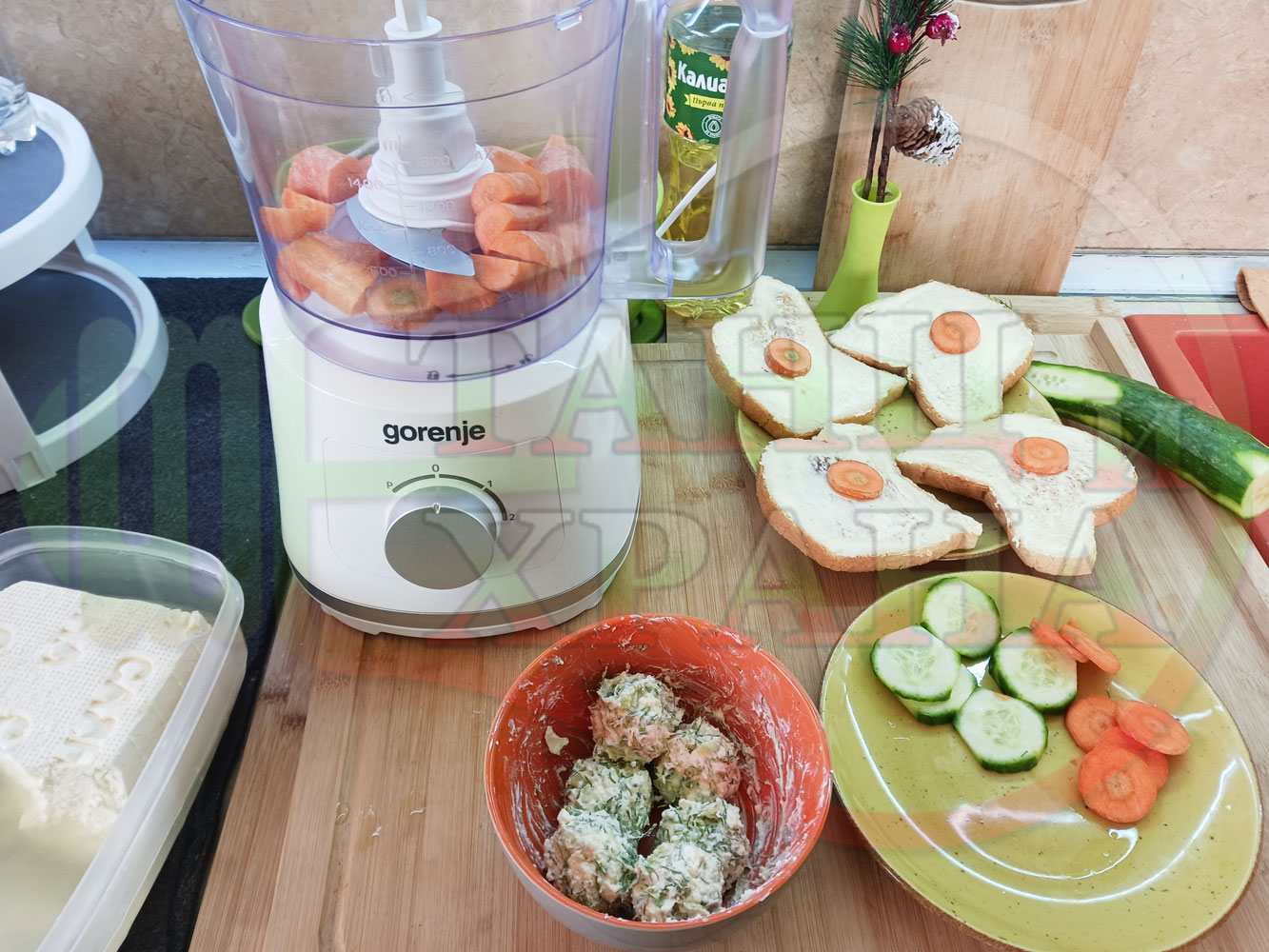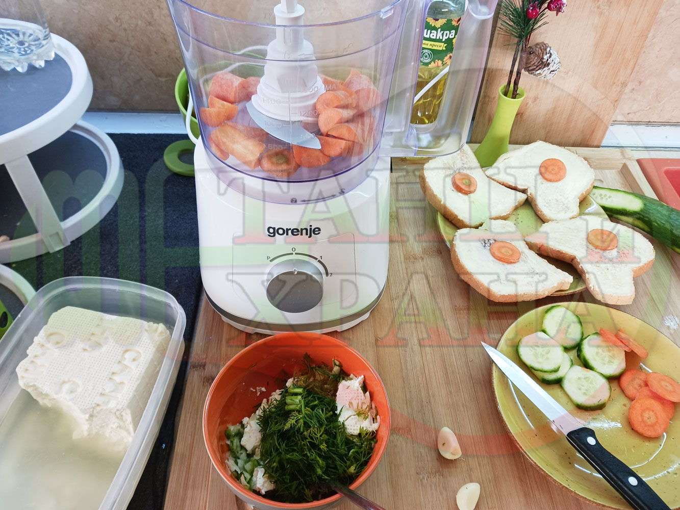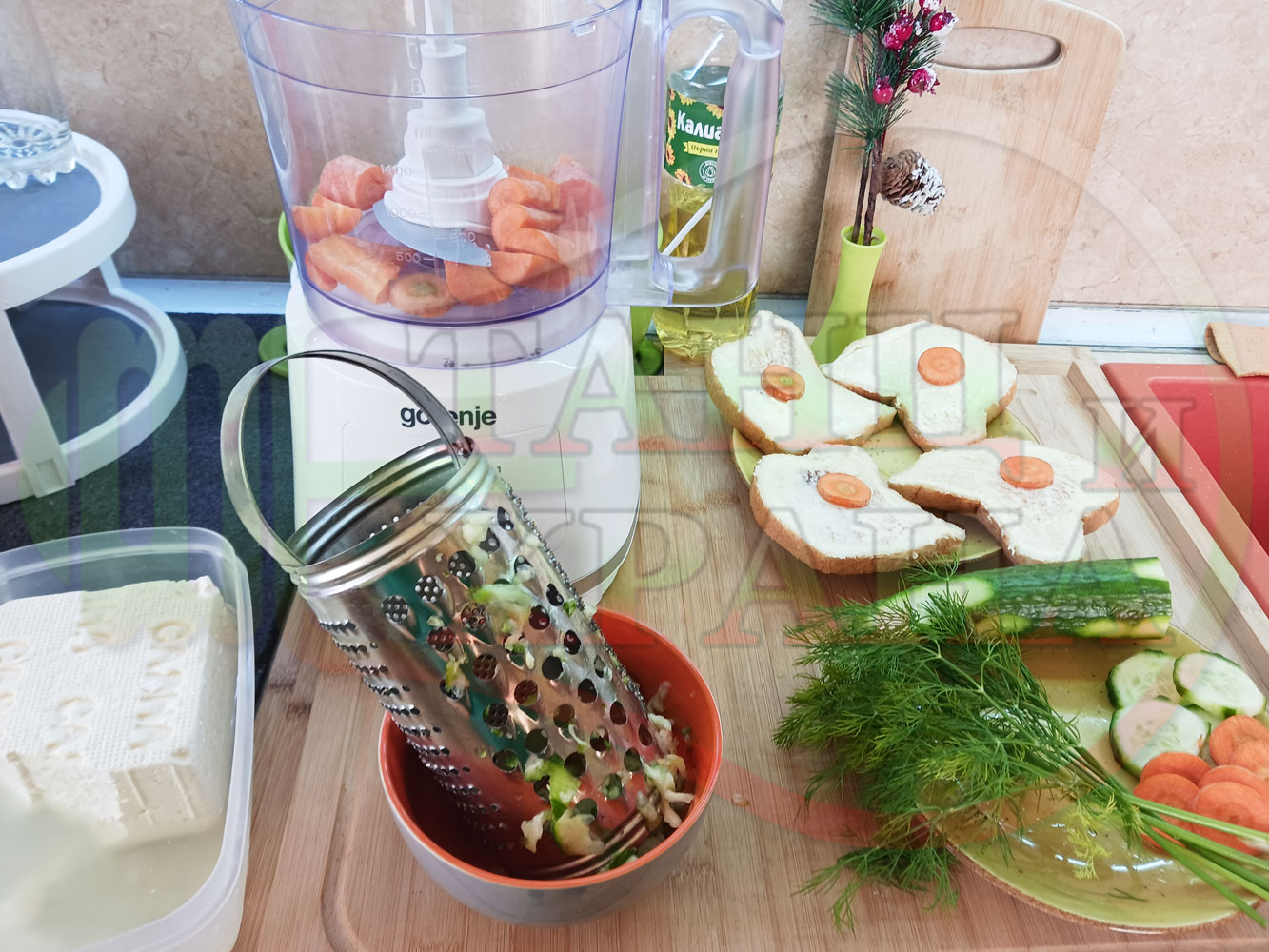Българската морковена сурова гъста супа, която сътворих се оказа доста вкусна и се спретва буквално за "нула" време с чопър. Гарнирах супата с топчета от сиреново краставичен крем приготвени с пресни краставици, копър, чесън и българско краве бяло саламурено сирене и се получи най-вкусната сурова супа, която сме хапвали (поредната най-вкусна сурова супа (всичките сурови супи са вкусни по свой си начин според продуктите, които са включени в тях)). Двукомпонентността на супите (в голямата си част са авторски с иновативен метод на представяне и комбиниране на продуктите (прилагам метода на двукомпонентността в почти всички видове ястия, които приготвям)), позволява да се комбинират различни сурови и/или запечени продукти, с което се осъвременяват и обогатяват традиционни български супи, ястия, печива и различни гозби. Сиреновите топчета овкусяват супата с неповторимия вкус, който носят в идеална хармония с морковената супа и за пореден път се получи голяма вкусно, вкусна, вкусотия (вкуснотия), която е изключително полезна, обединяваща млечните протеини, минерали и микроелементи от прясното мляко и сиренето с богатството от полезни съставки на морковите, краставицата, копъра и чесъна. ![]()