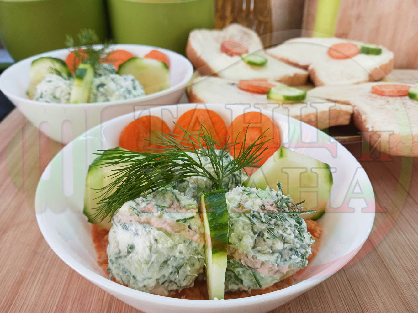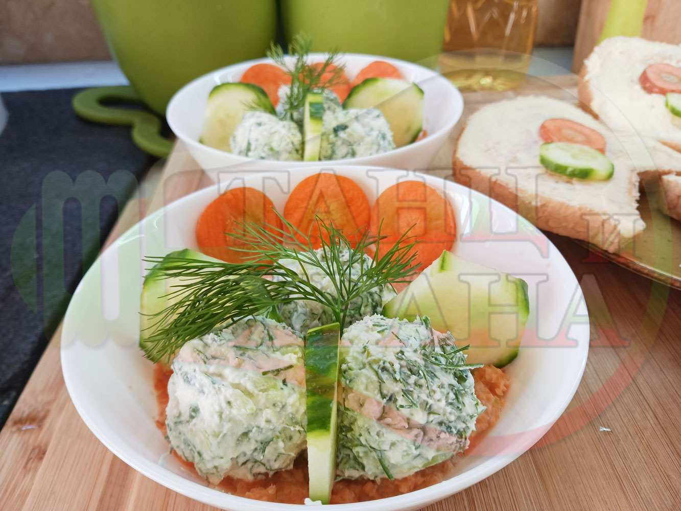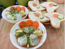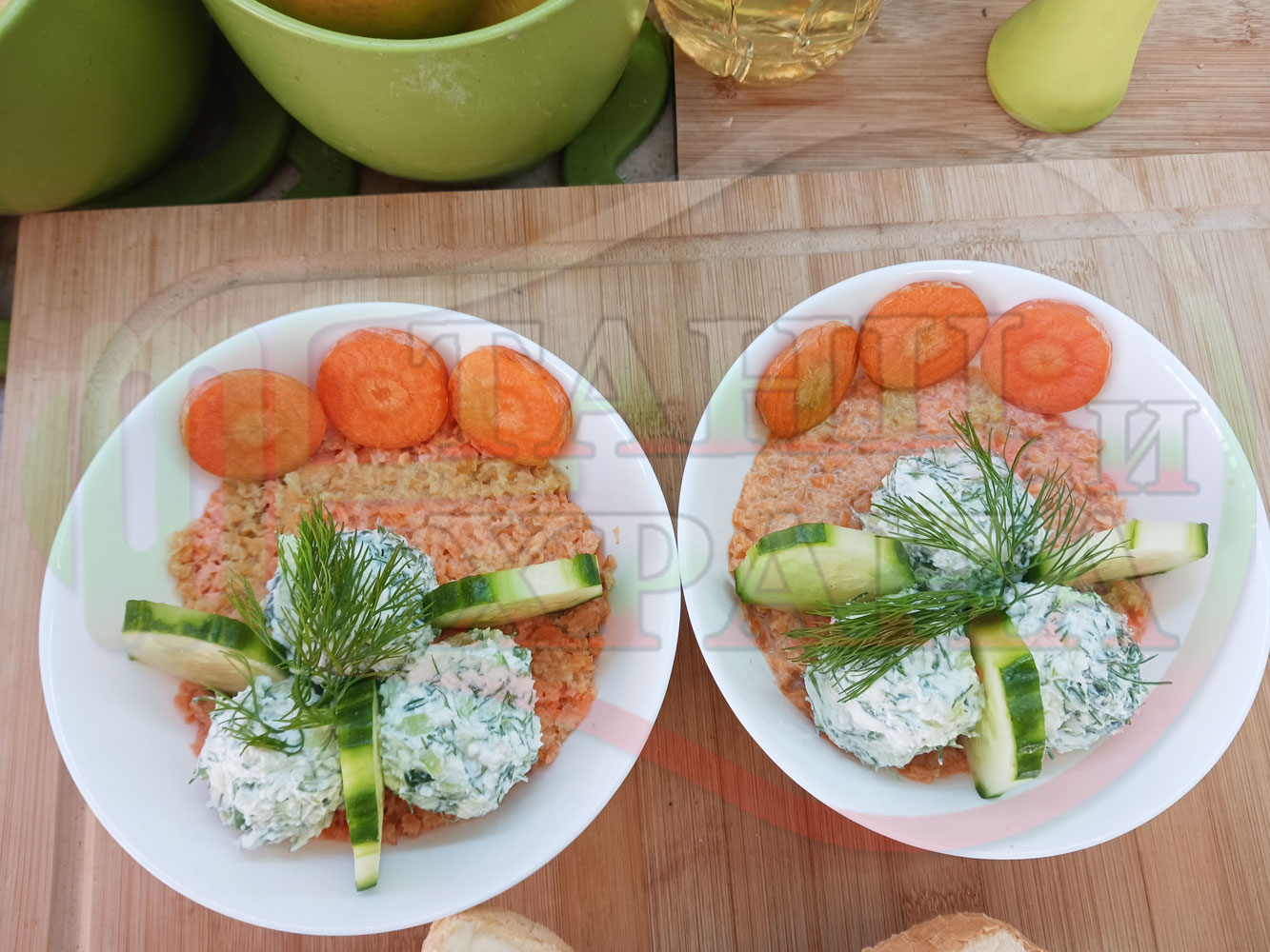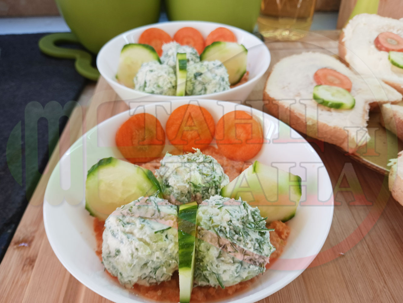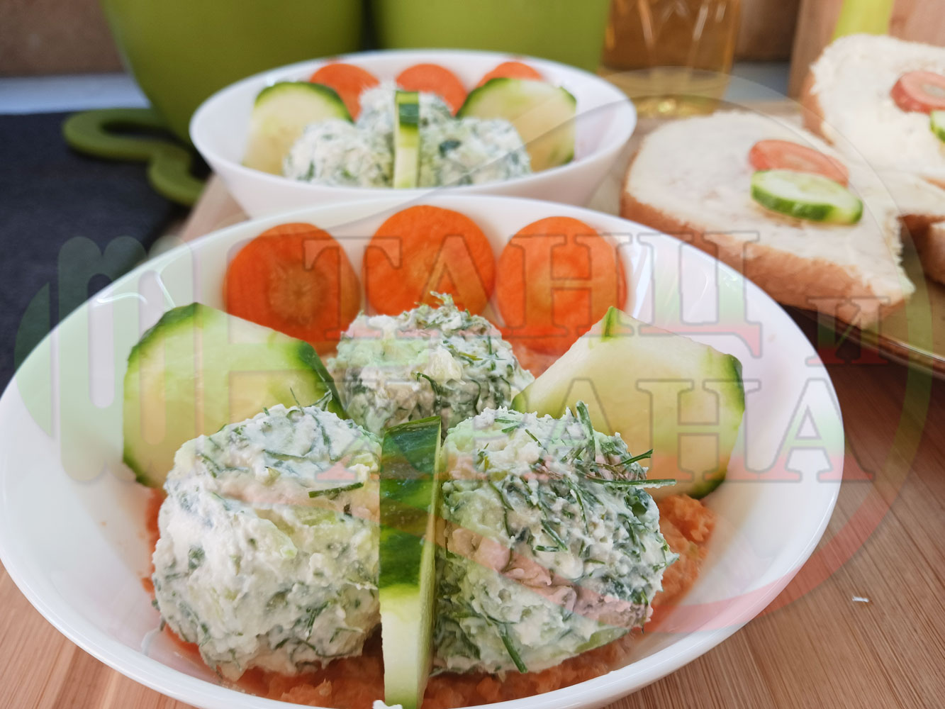 Българска сурова гъста супа "Морковена прясномлечна краставичнокопърова с БГсирене" приготвена от моркови и прясно мляко гарнирана с топчета от сиренов крем с копър, краставици, чесън и краве бяло сирене (българско, саламурено) - двукомпонентна