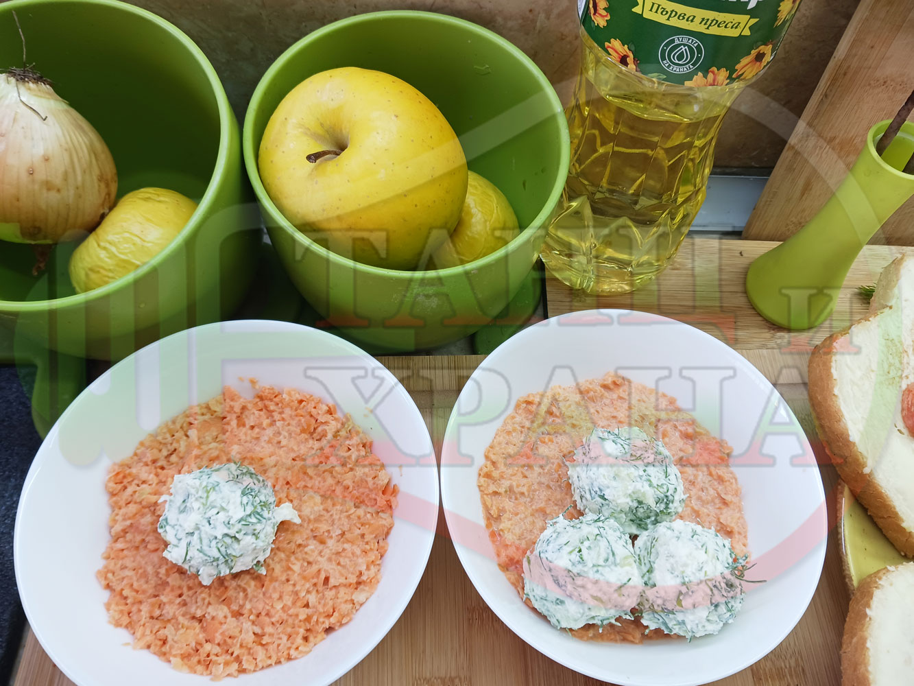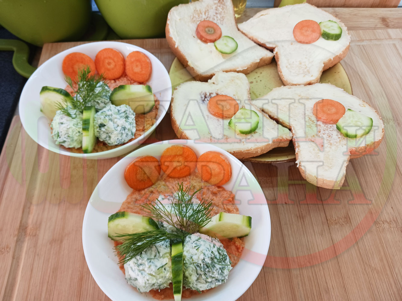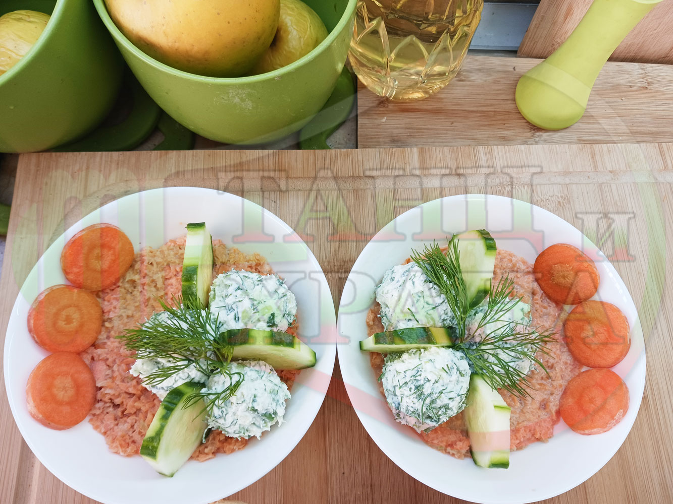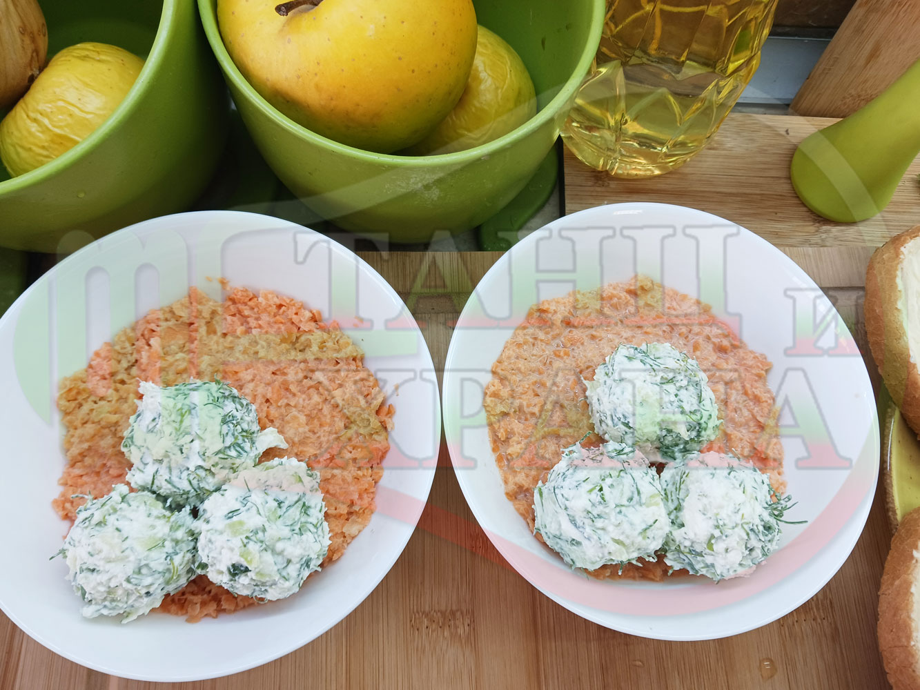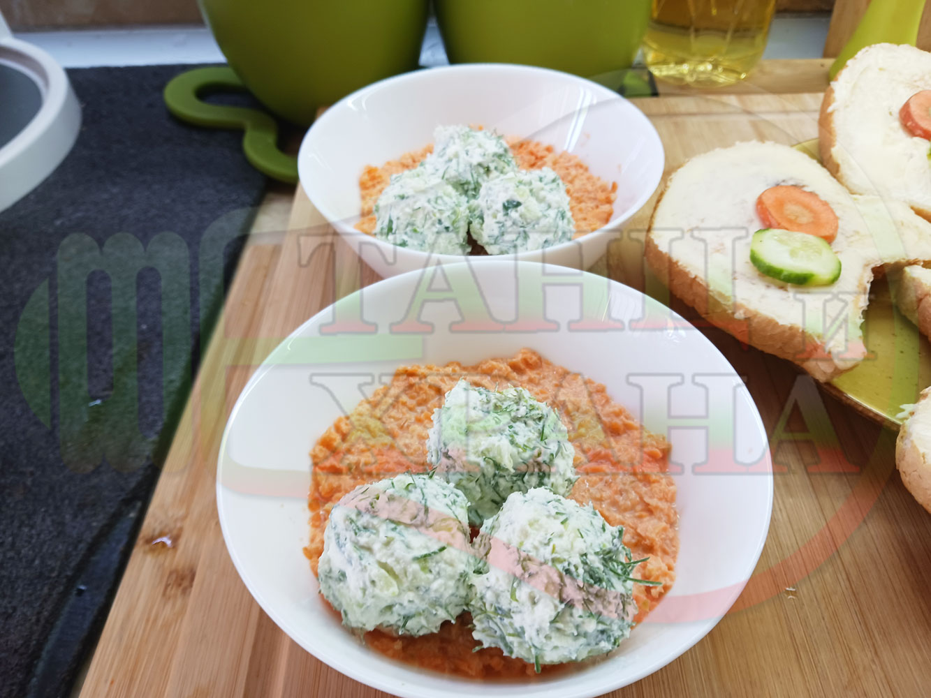 Българска сурова гъста супа "Морковена прясномлечна краставичнокопърова с БГсирене" приготвена от моркови и прясно мляко гарнирана с топчета от сиренов крем с копър, краставици, чесън и краве бяло сирене (българско, саламурено) - двукомпонентна