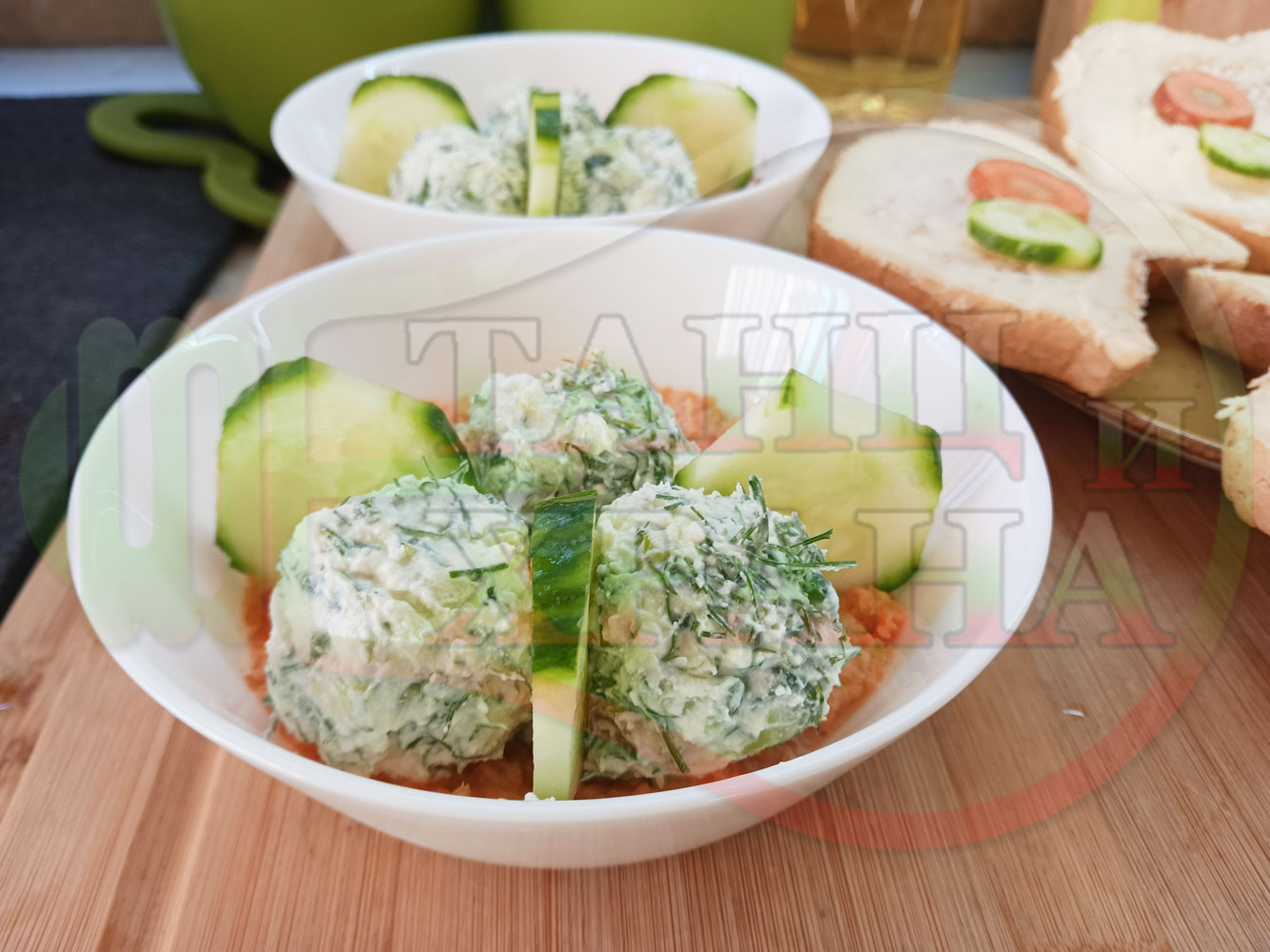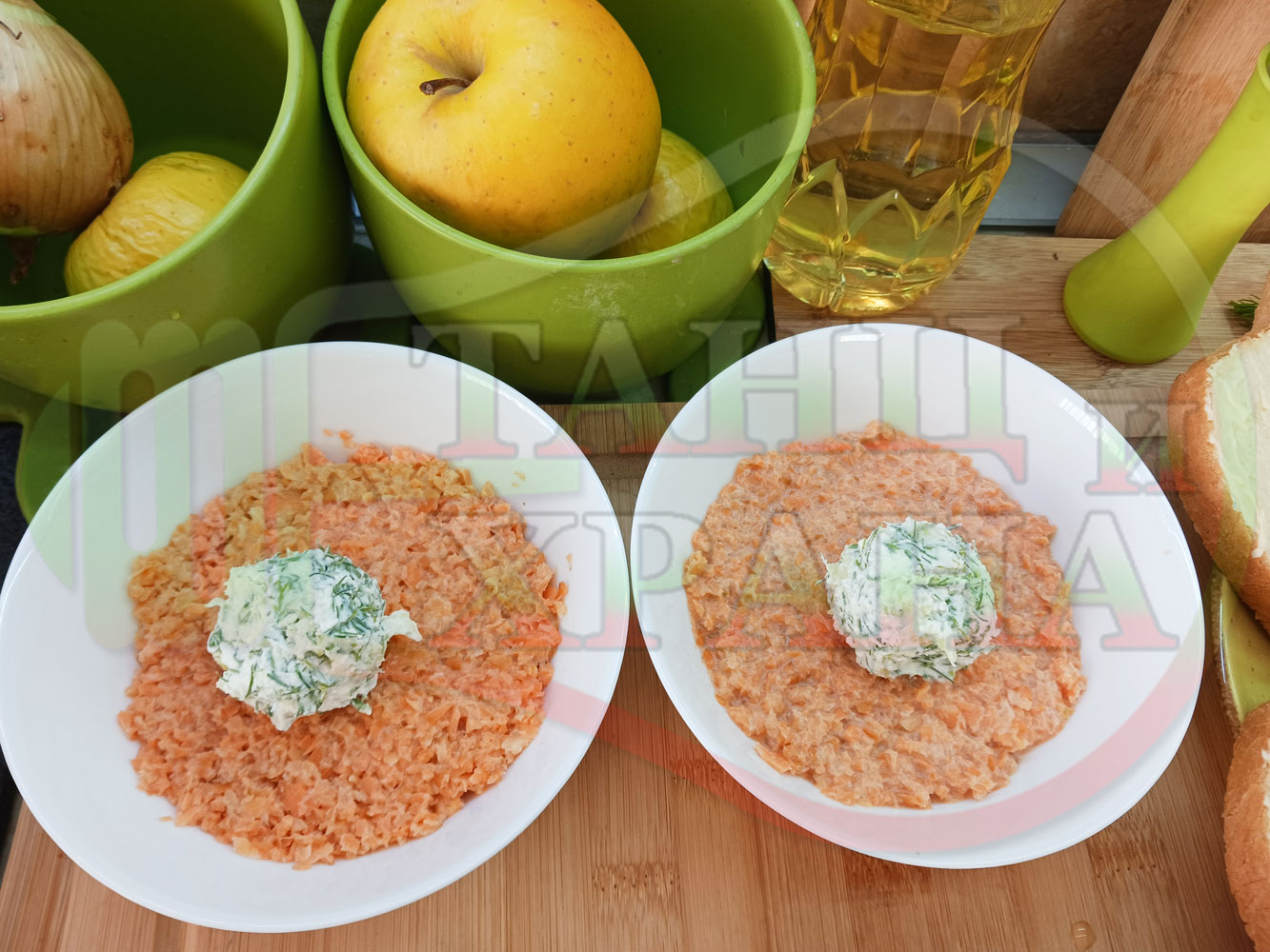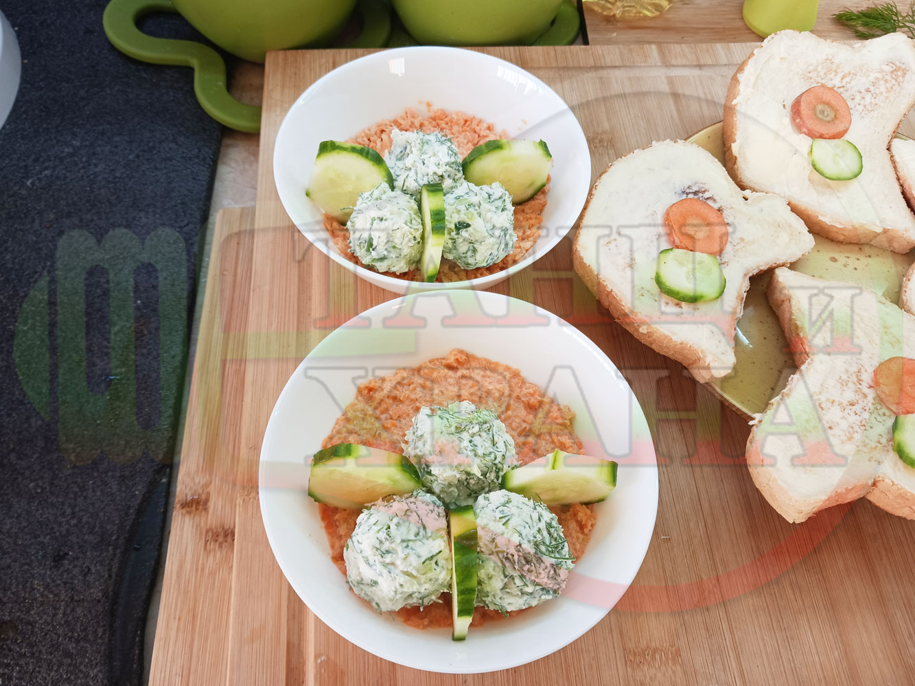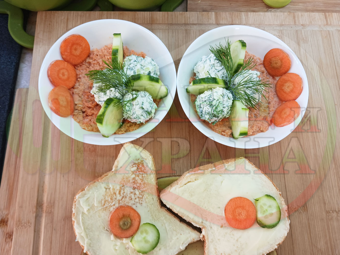 Българска сурова гъста супа "Морковена прясномлечна краставичнокопърова с БГсирене" приготвена от моркови и прясно мляко гарнирана с топчета от сиренов крем с копър, краставици, чесън и краве бяло сирене (българско, саламурено) - двукомпонентна