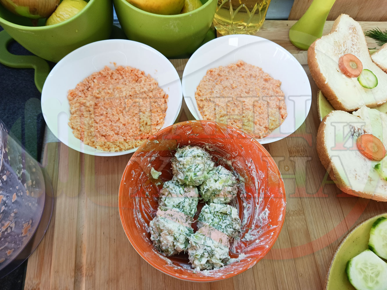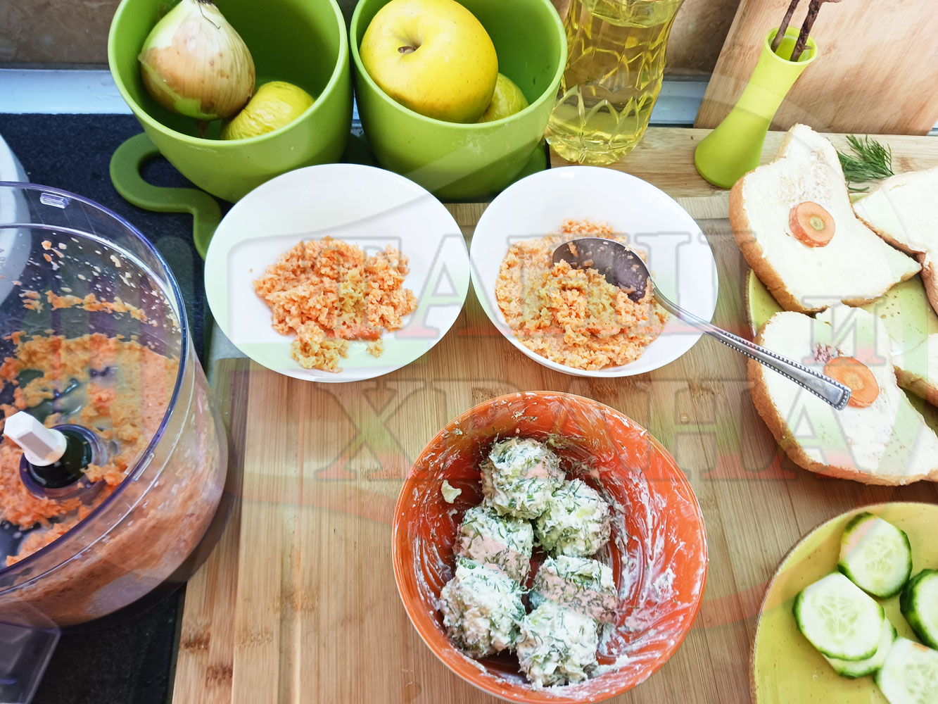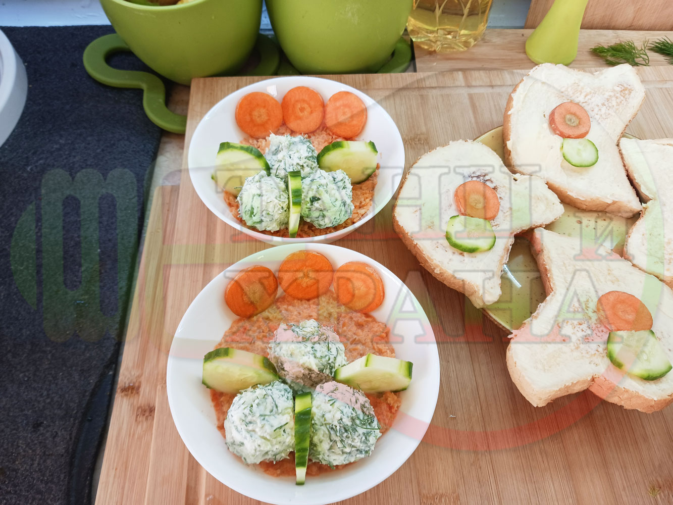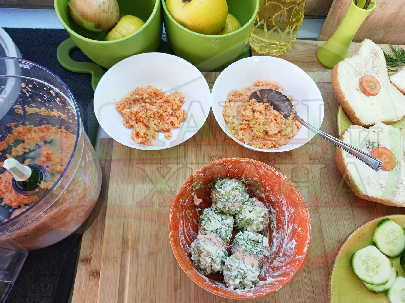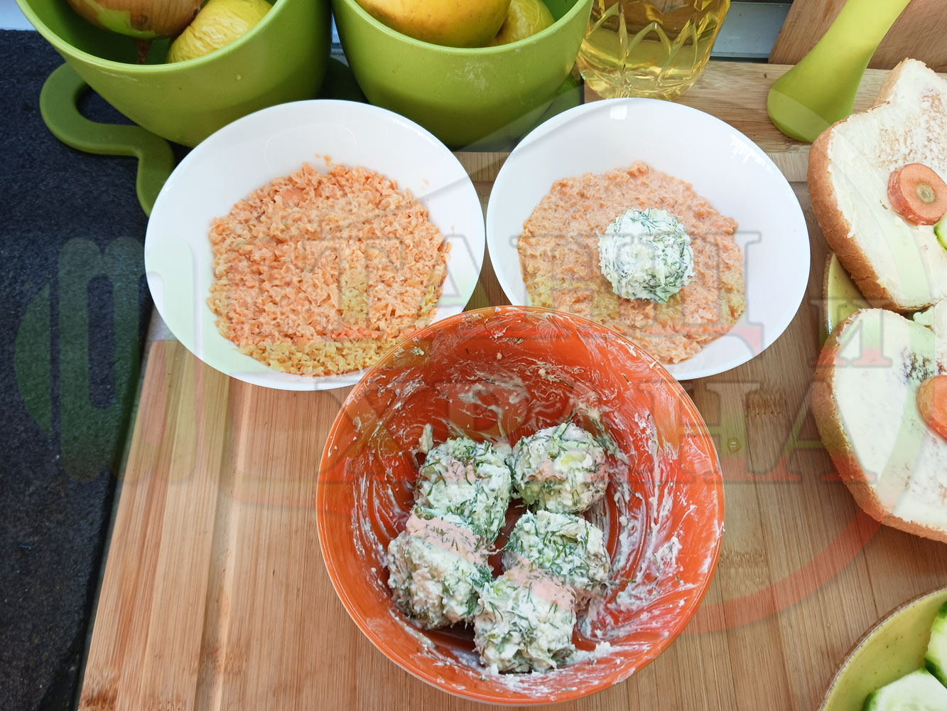 Българска сурова гъста супа "Морковена прясномлечна краставичнокопърова с БГсирене" приготвена от моркови и прясно мляко гарнирана с топчета от сиренов крем с копър, краставици, чесън и краве бяло сирене (българско, саламурено) - двукомпонентна