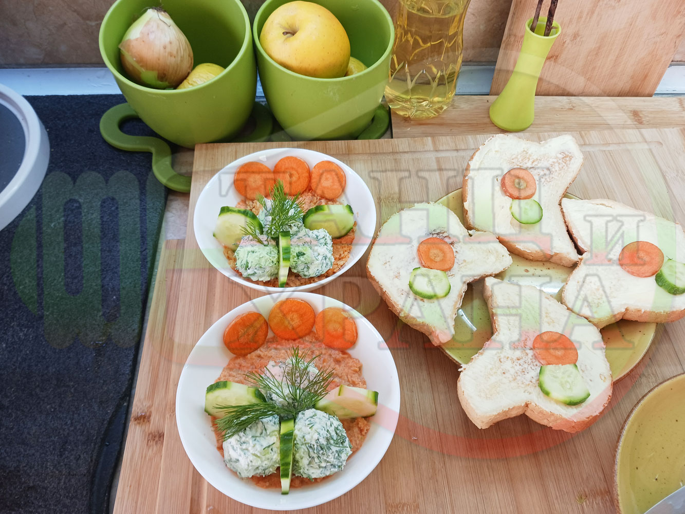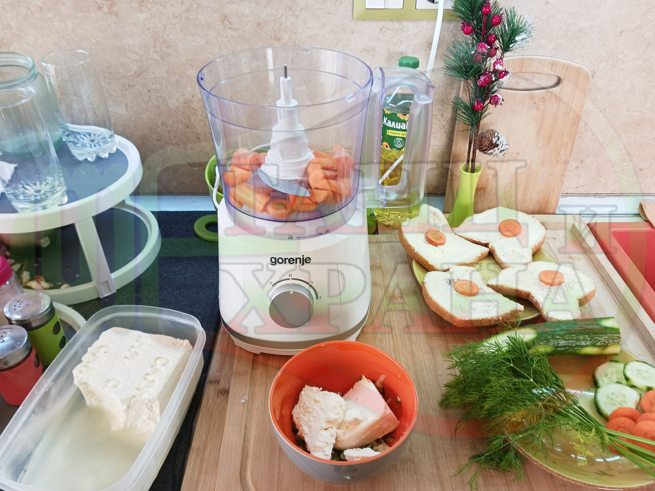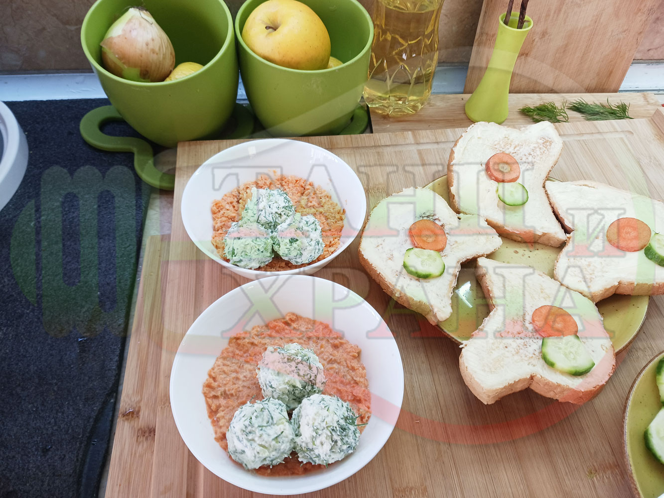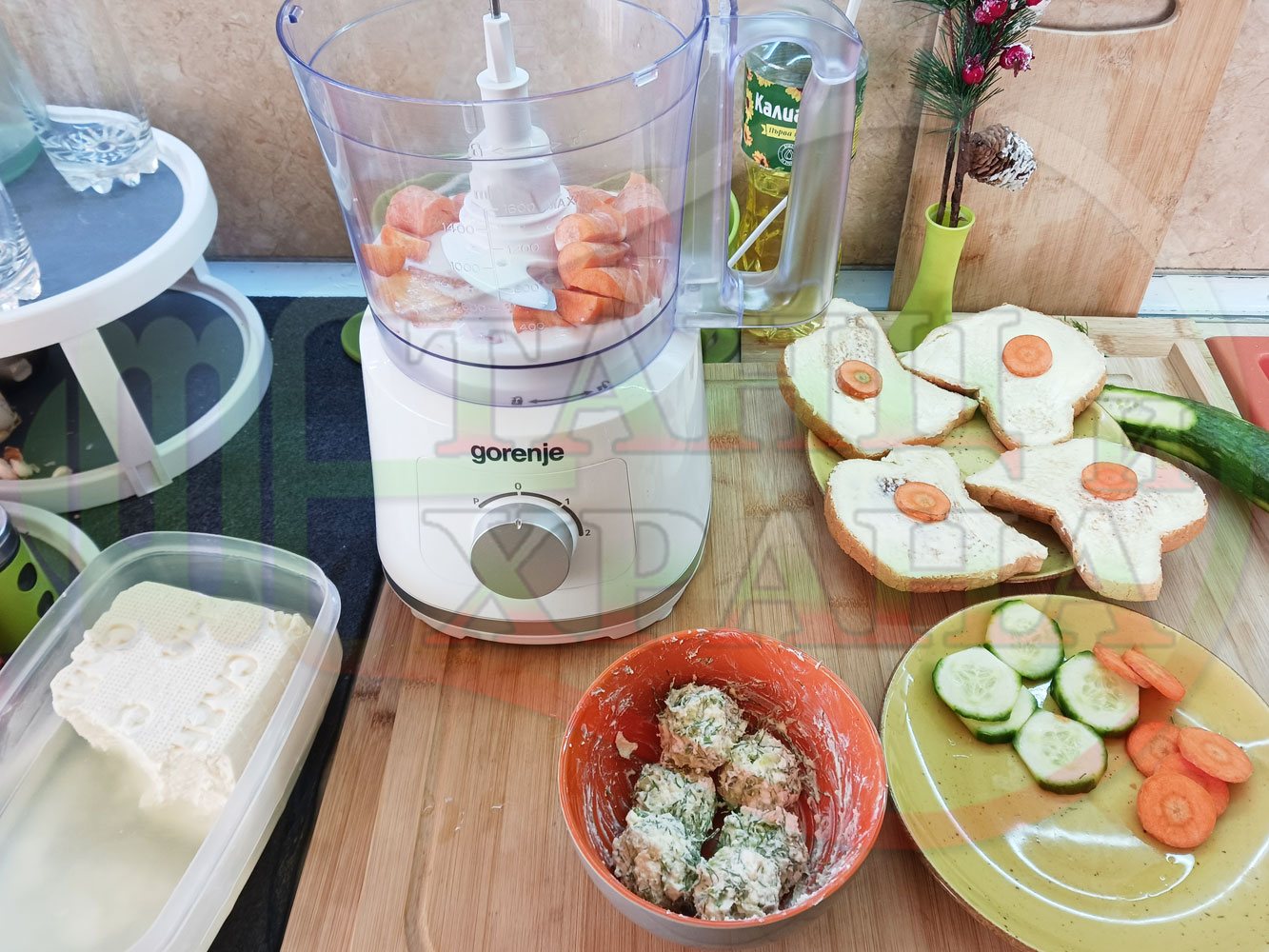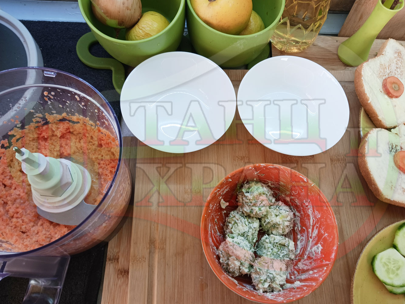 Българска сурова гъста супа "Морковена прясномлечна краставичнокопърова с БГсирене" приготвена от моркови и прясно мляко гарнирана с топчета от сиренов крем с копър, краставици, чесън и краве бяло сирене (българско, саламурено) - двукомпонентна