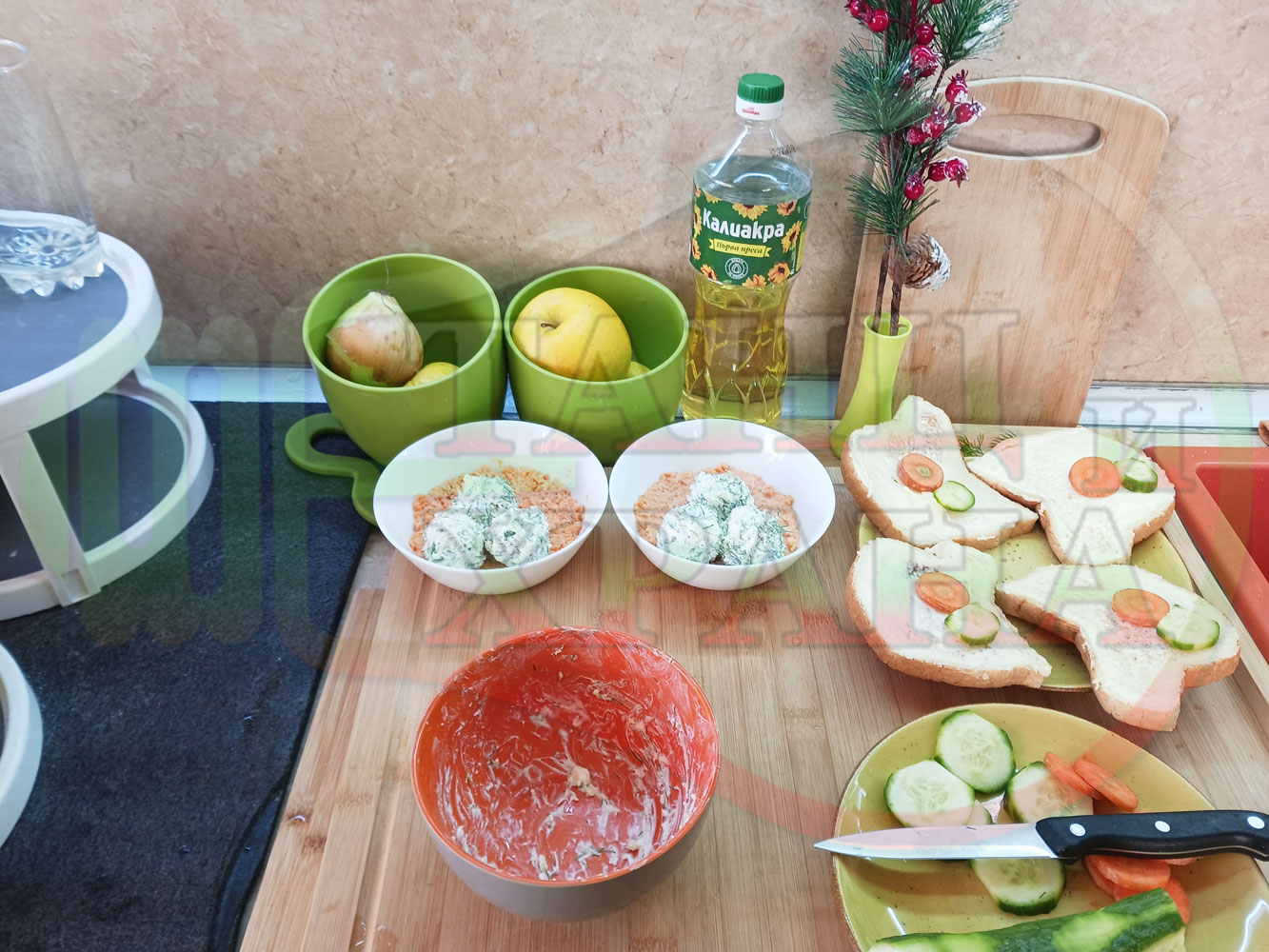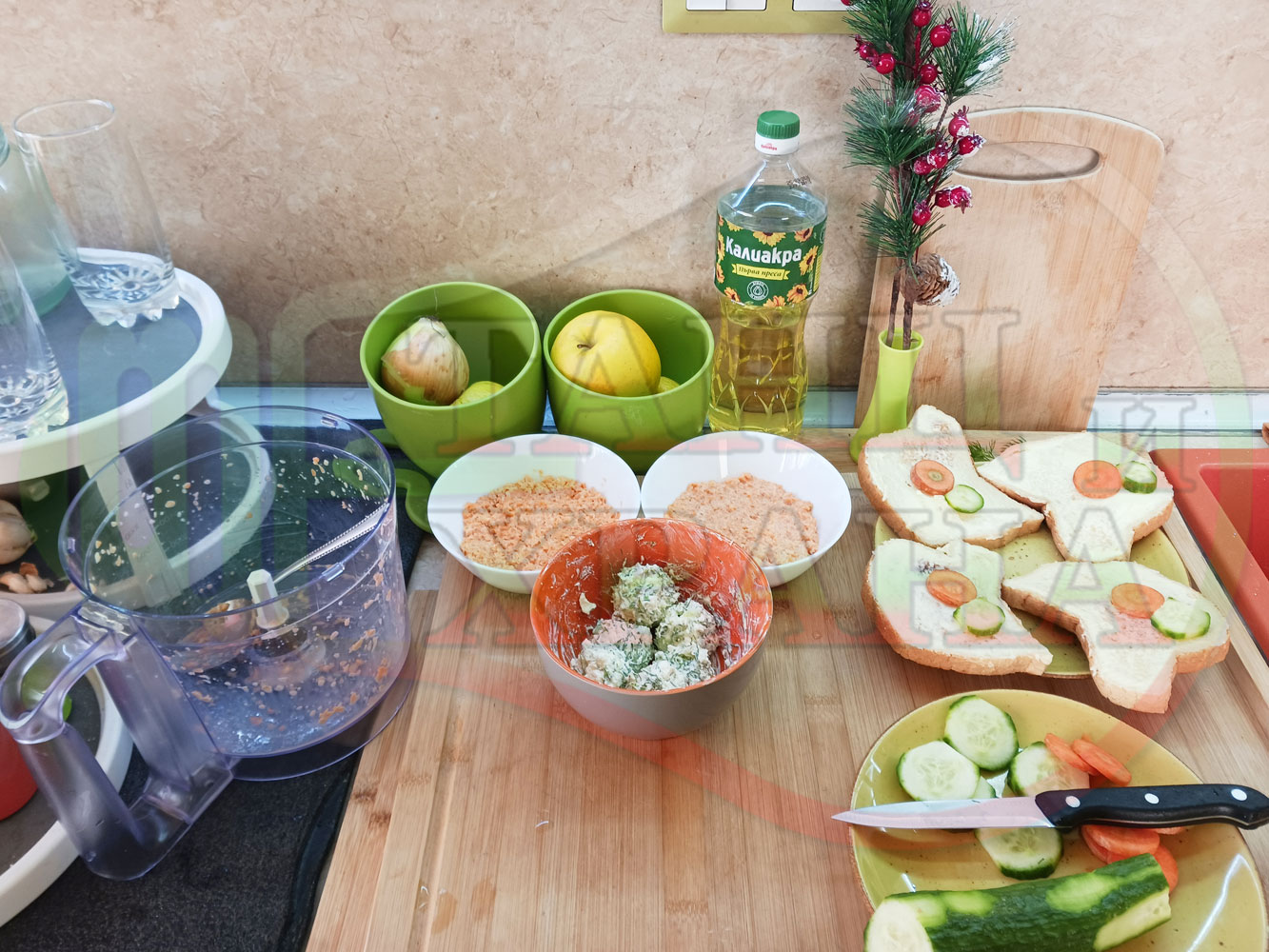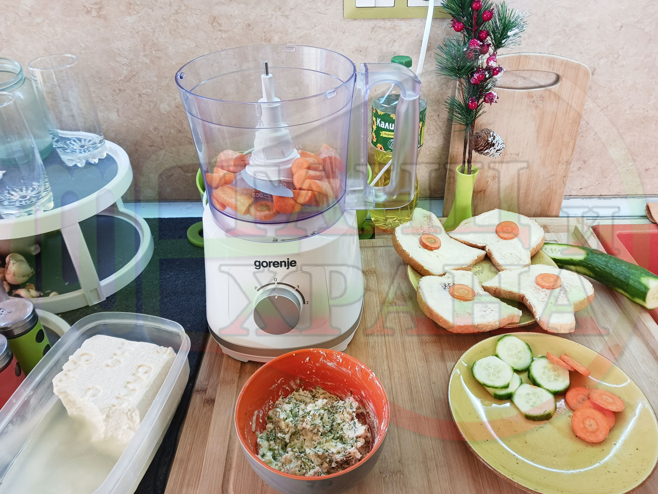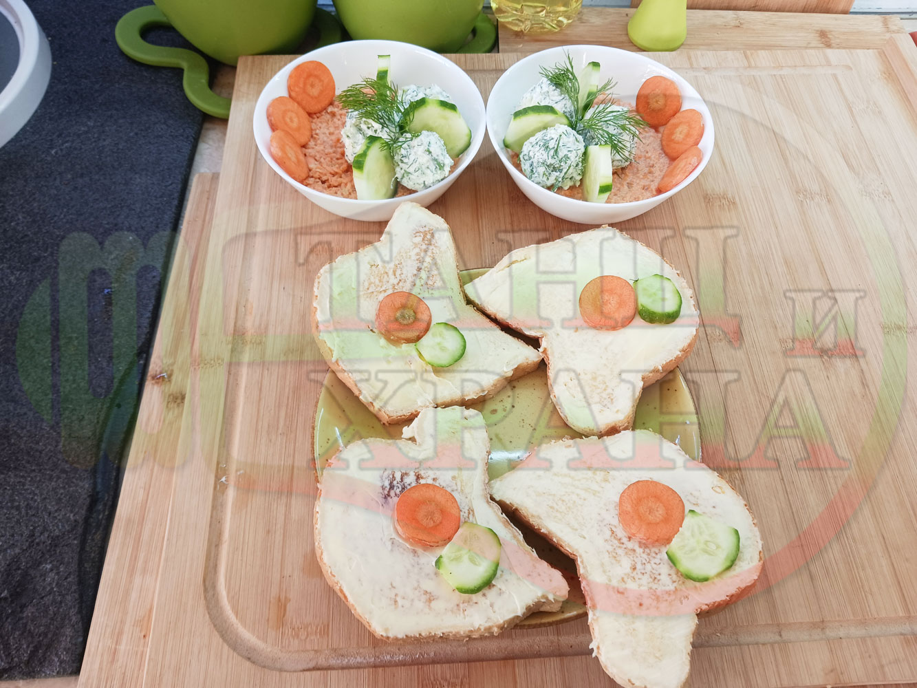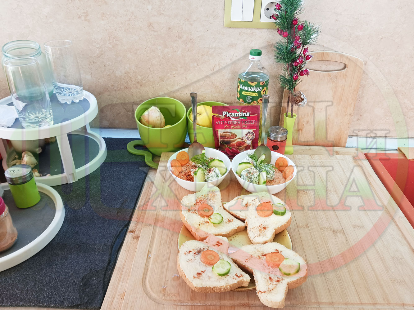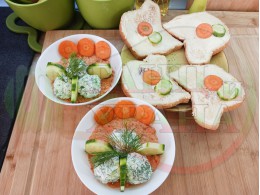 Добавете червен лют и/или сладък пипер при приготвянето на сиреново краставичния крем и/или поръсете готовите порции с 2-та вида пипер на вкус. Поднесете порциите с препечени на тостер филийки, намазани с краве масло и поръсени с червен сладък пипер и/или шарена сол. Украсете филийките с част от морковените и краставични кръгчета (украсете по ваше желание и усмотрение).