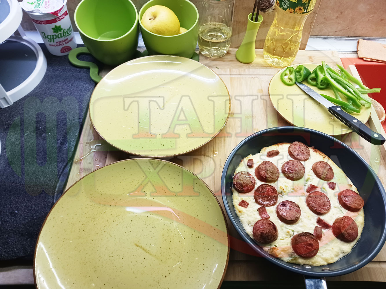 ПРОДУКТИ: Приблизителни количества за българска яйчена пита "Родопсконаденицова зеленочушкова с БГсирене" запечена на фурна с родопска наденица приготвена с яйчено сиренова основа с яйца, зелени пресни чушки, стар чесън и краве бяло сирене (българско, саламурено)