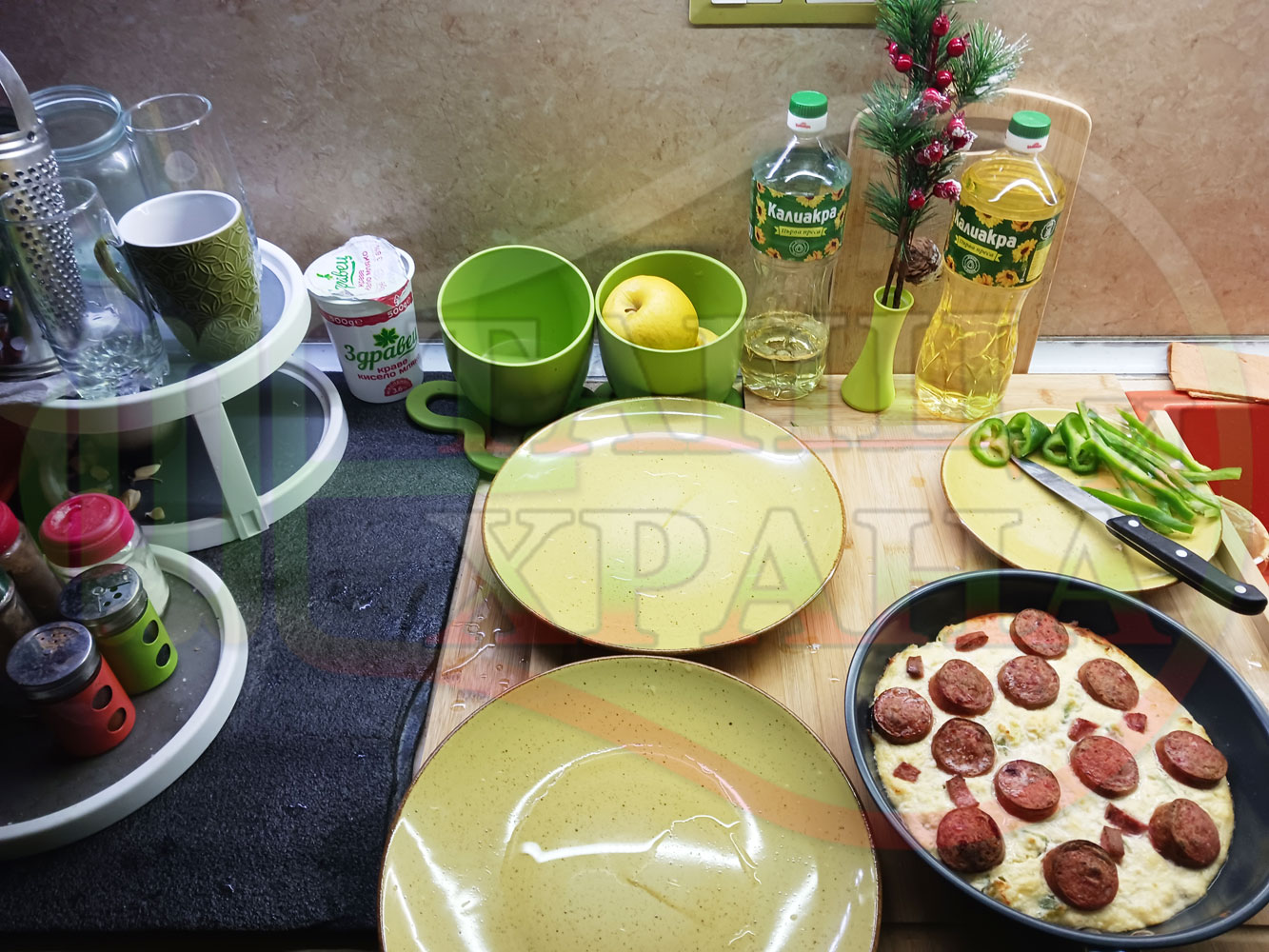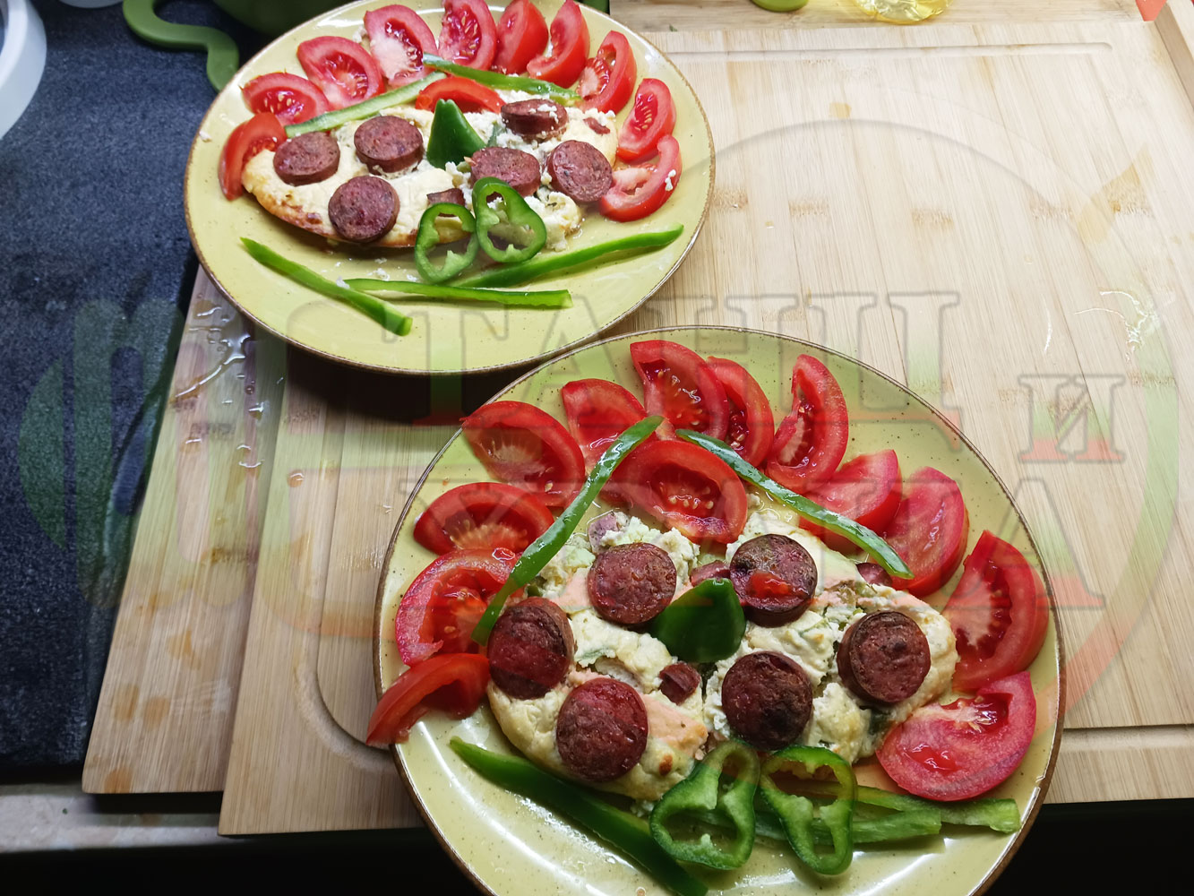 Българска яйчена пита "Родопсконаденицова зеленочушкова с БГсирене" запечена на фурна с родопска наденица приготвена с яйчено сиренова основа с яйца, зелени пресни чушки, стар чесън и краве бяло сирене (българско, саламурено)