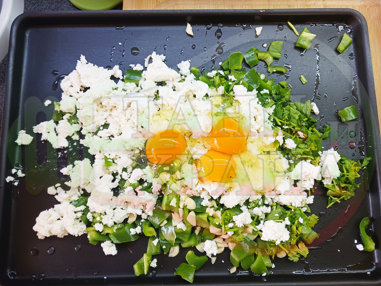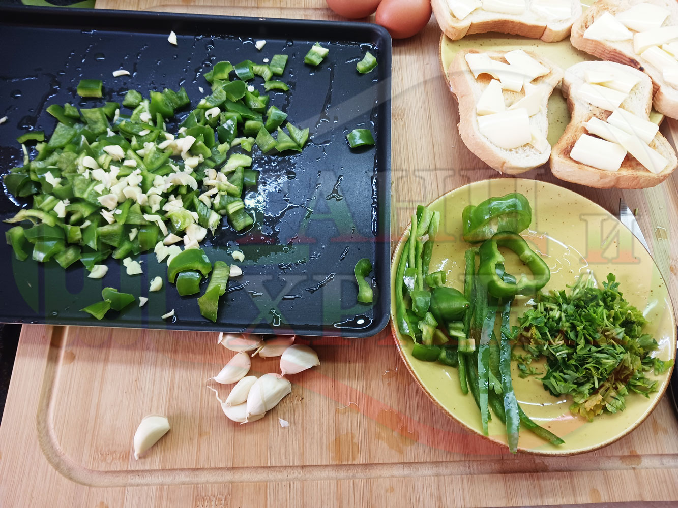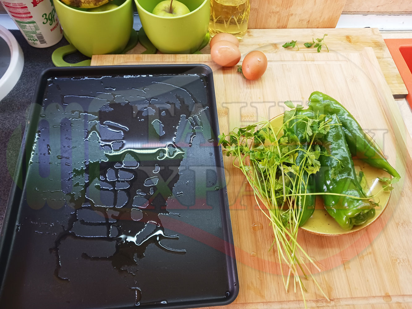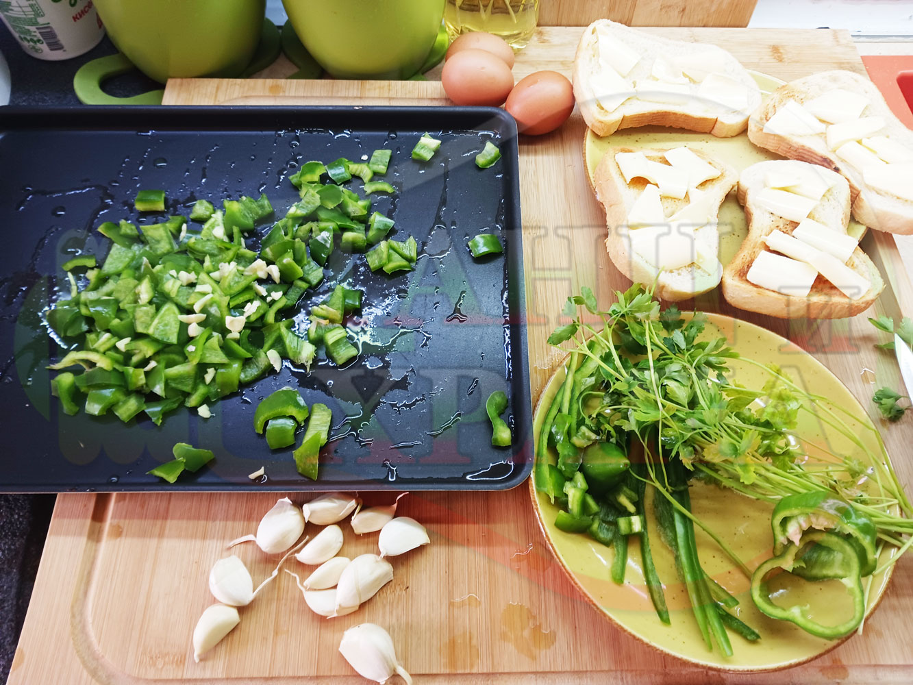 ПРОДУКТИ: Приблизителни количества за български зеленочушков миш маш "Лютиковочеснов с БГсирене" запечен на фурна със зелени пресни чушки, стар чесън, яйца, свеж магданоз и краве бяло сирене (българско, саламурено)