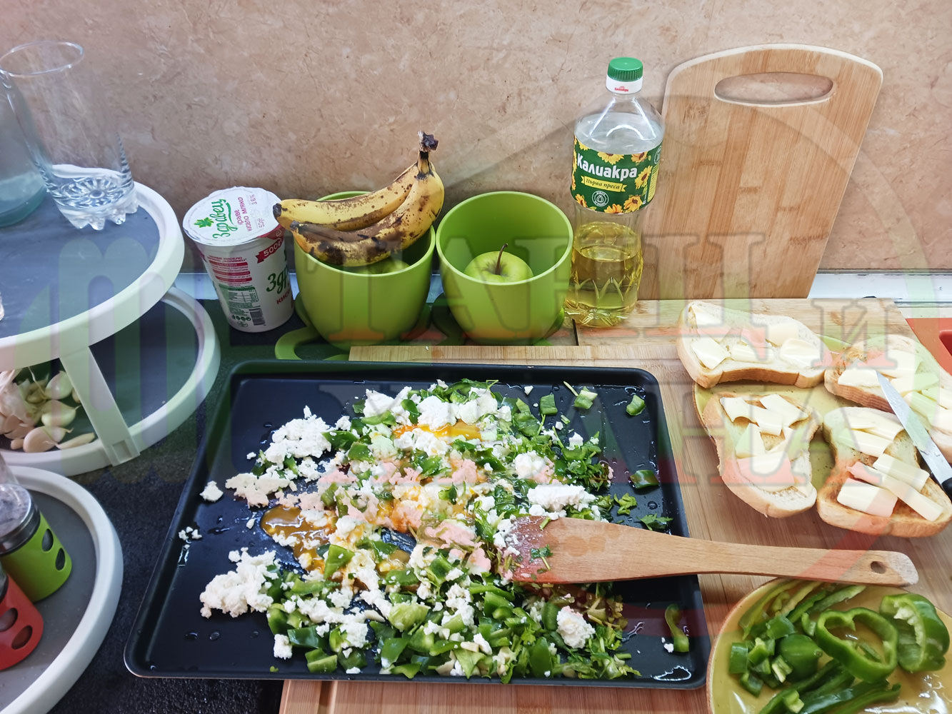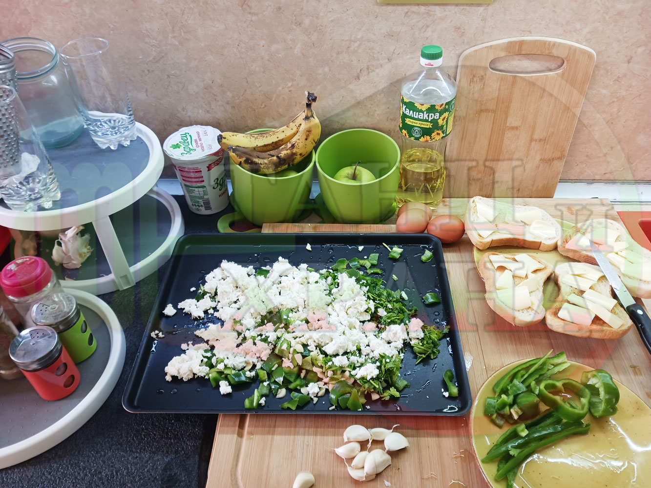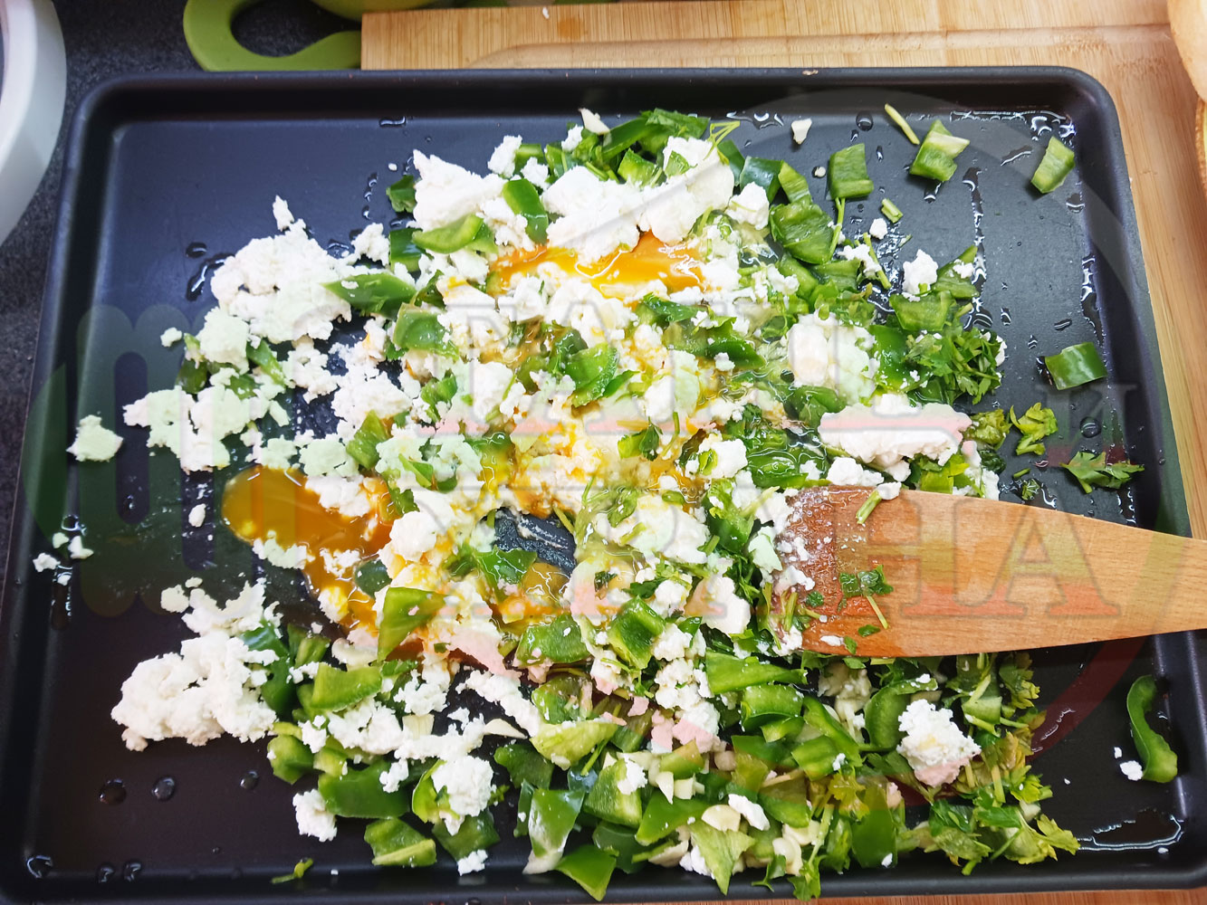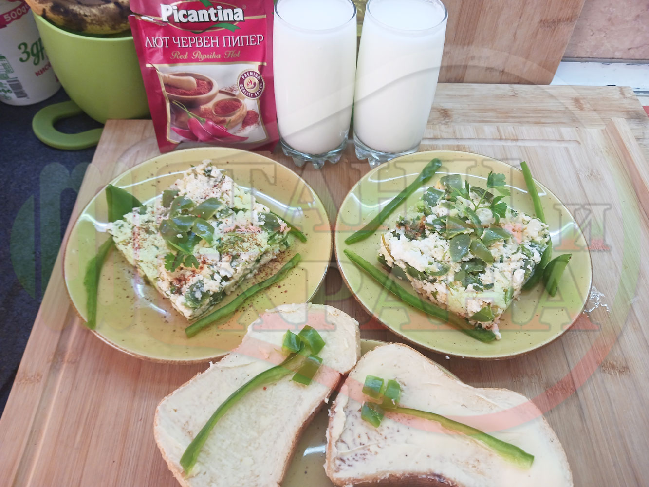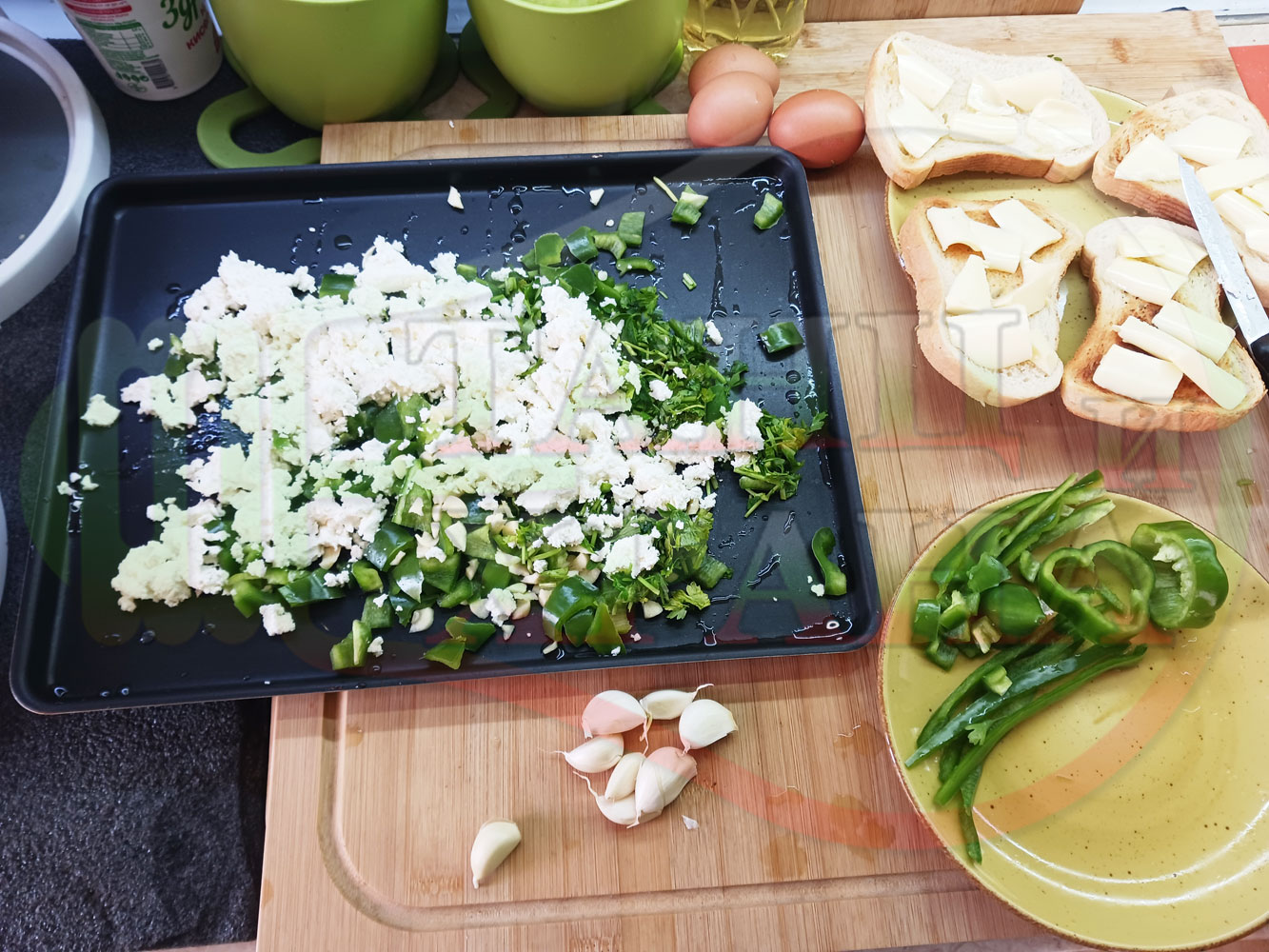 Спретнах изключително вкусен български зеленочушков лютиковочеснов миш маш със зелени пресни чушки, стар чесън, яйца и българско краве бяло саламурено сирене. Ммммм... в кухнята се носи аромат на запечени и леко карамелизирани зелени чушки, напоени и овкусени от саламурата на българското сирене в идеална хармония с яйцата, едва доловимата пикантна нотка на стария чесън и свежестта на пресния магданоз и отново се получи невероятна вкусно, вкусна, вкусотия (вкуснотия). laughing