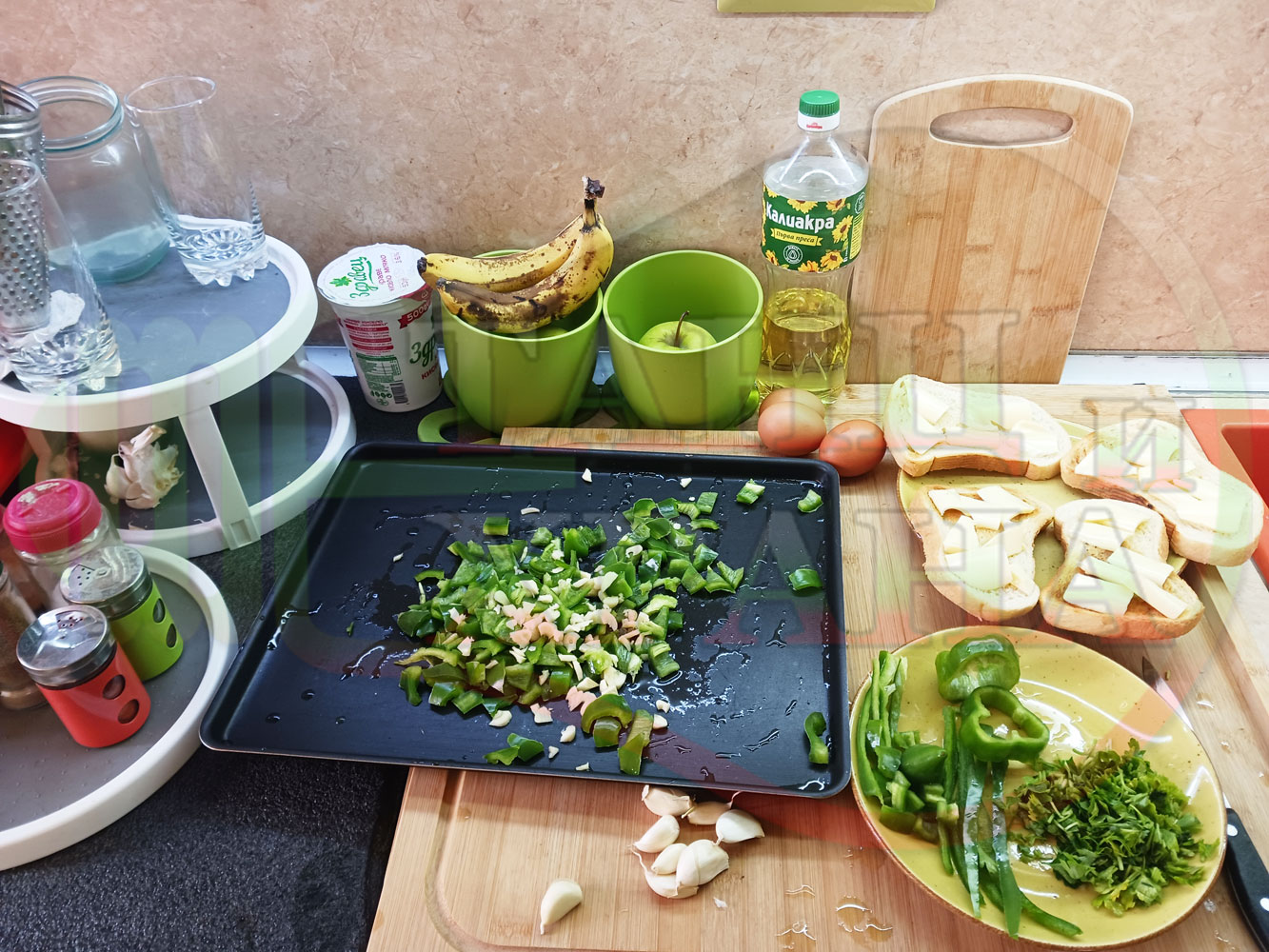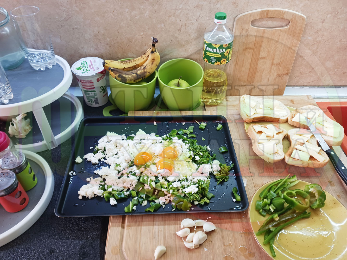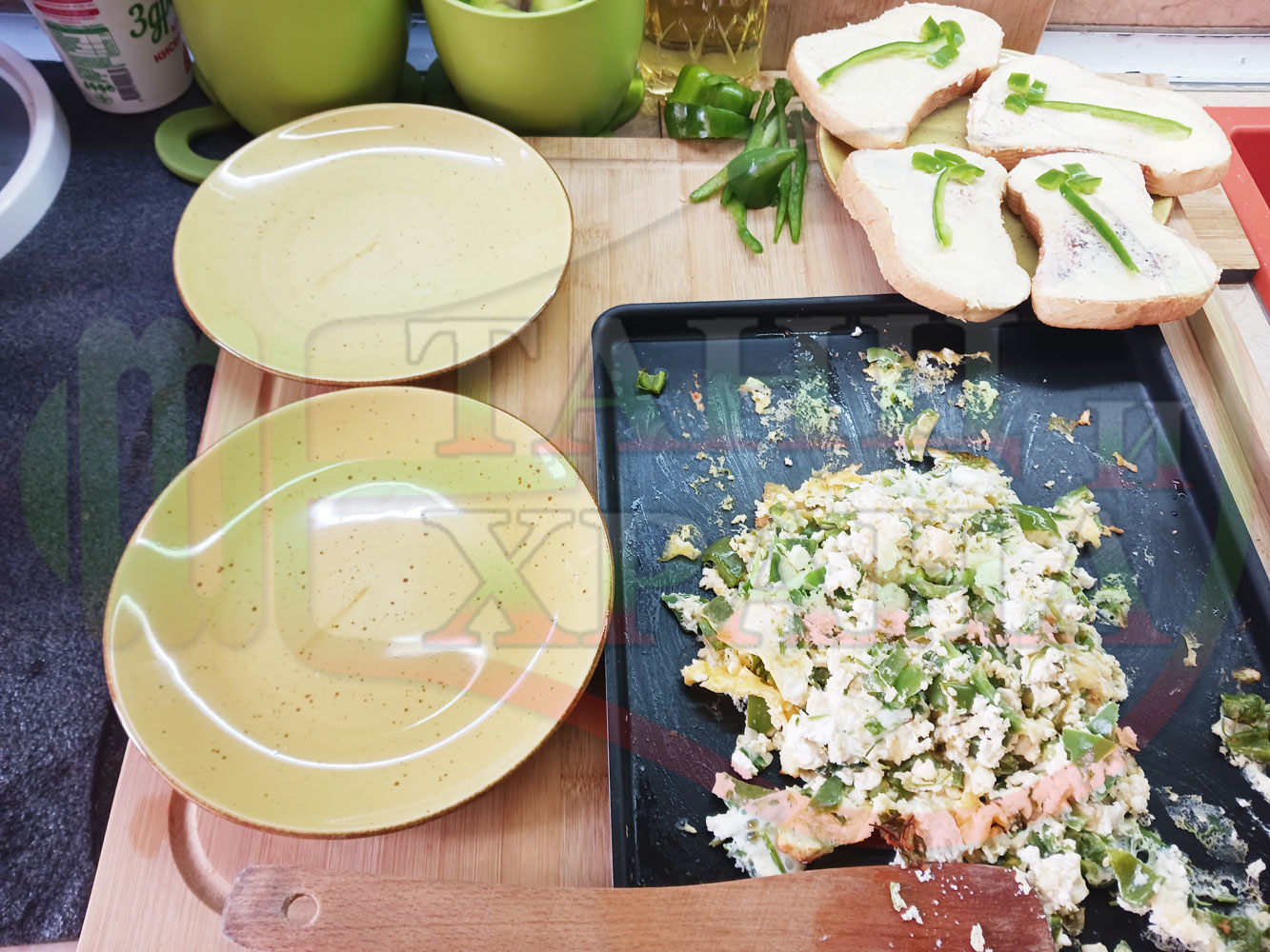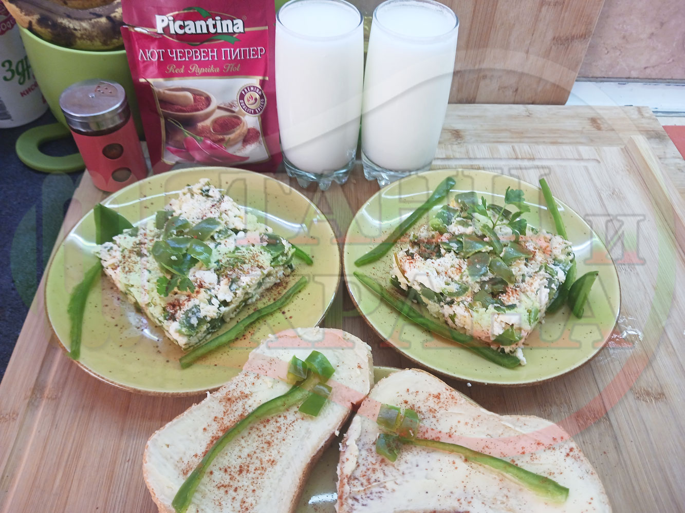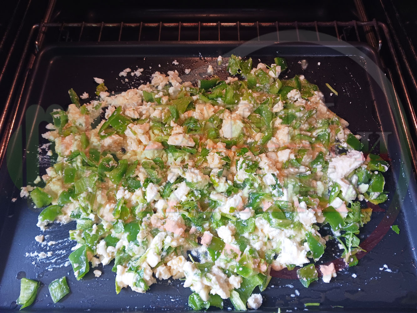 Спретнах изключително вкусен български зеленочушков лютиковочеснов миш маш със зелени пресни чушки, стар чесън, яйца и българско краве бяло саламурено сирене. Ммммм... в кухнята се носи аромат на запечени и леко карамелизирани зелени чушки, напоени и овкусени от саламурата на българското сирене в идеална хармония с яйцата, едва доловимата пикантна нотка на стария чесън и свежестта на пресния магданоз и отново се получи невероятна вкусно, вкусна, вкусотия (вкуснотия). laughing