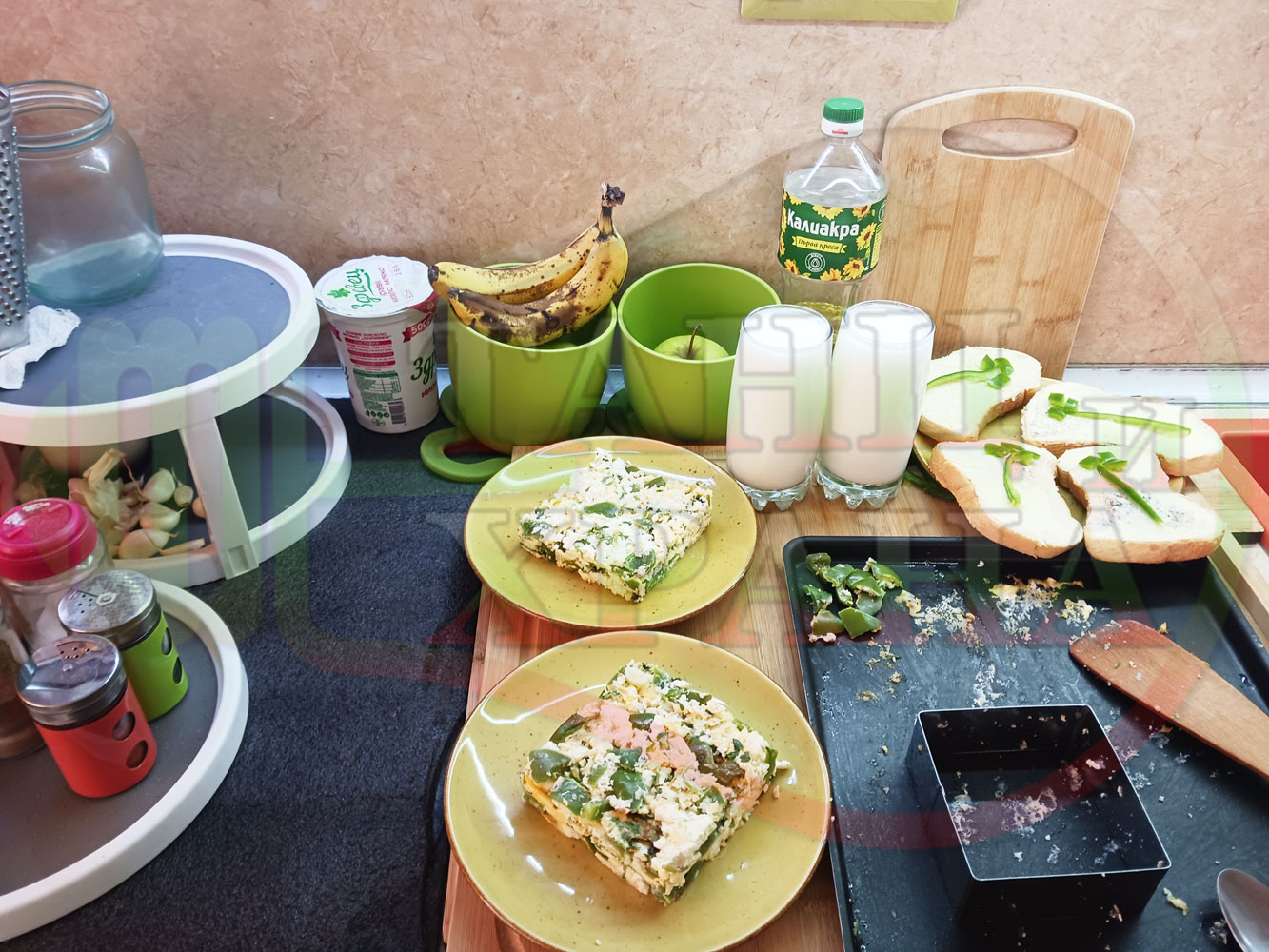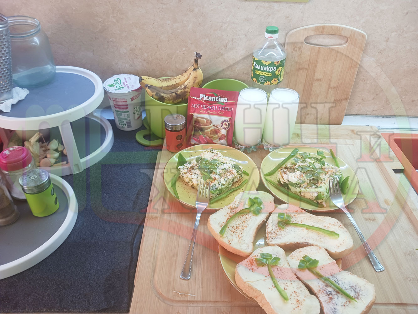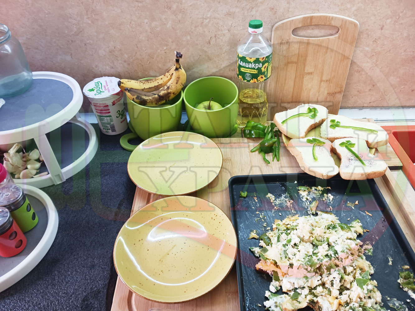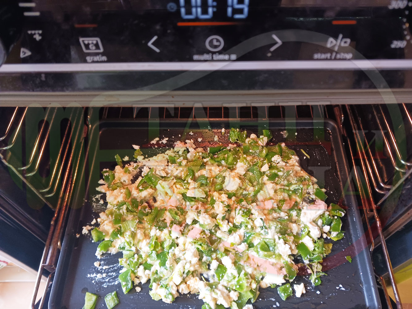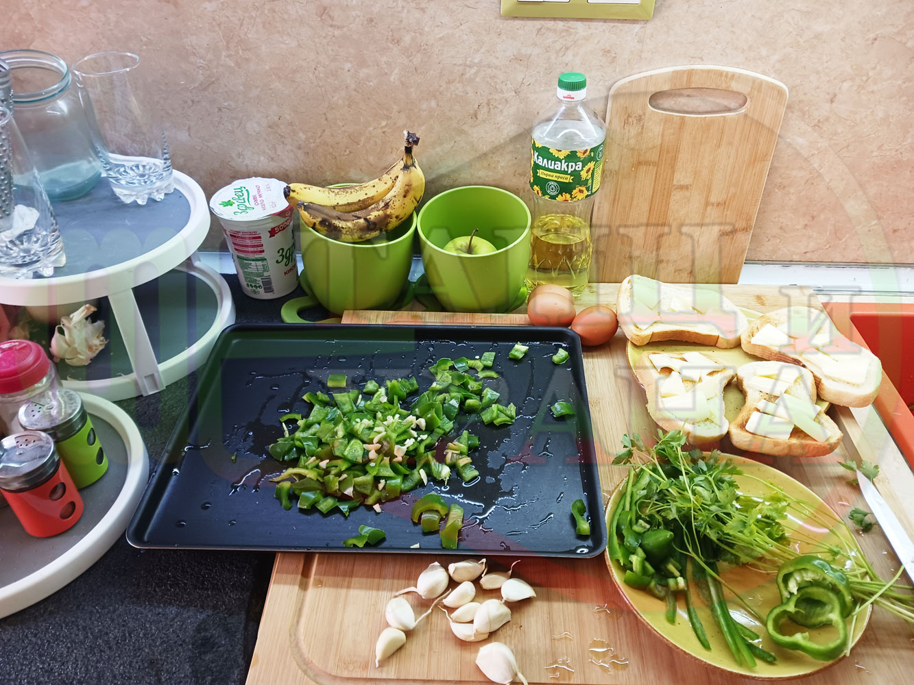 Спретнах изключително вкусен български зеленочушков лютиковочеснов миш маш със зелени пресни чушки, стар чесън, яйца и българско краве бяло саламурено сирене. Ммммм... в кухнята се носи аромат на запечени и леко карамелизирани зелени чушки, напоени и овкусени от саламурата на българското сирене в идеална хармония с яйцата, едва доловимата пикантна нотка на стария чесън и свежестта на пресния магданоз и отново се получи невероятна вкусно, вкусна, вкусотия (вкуснотия). laughing