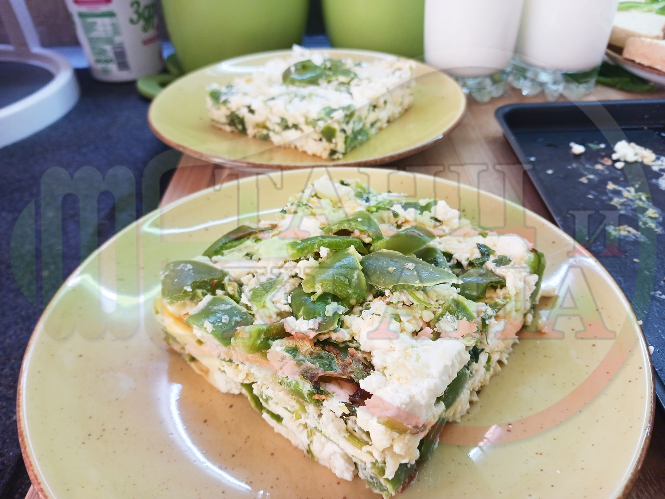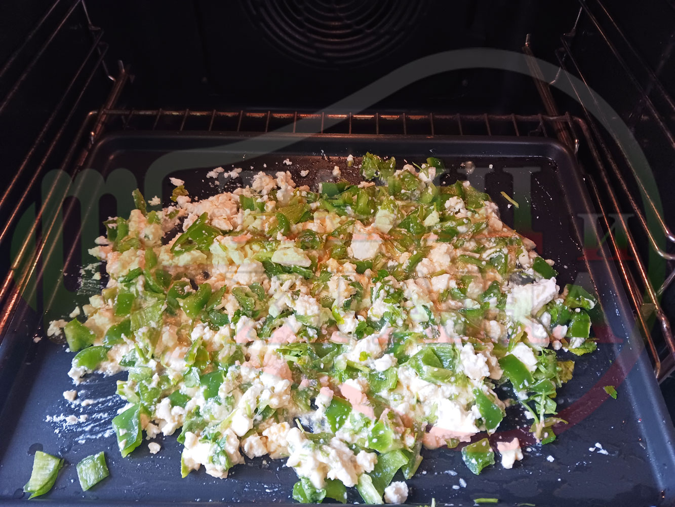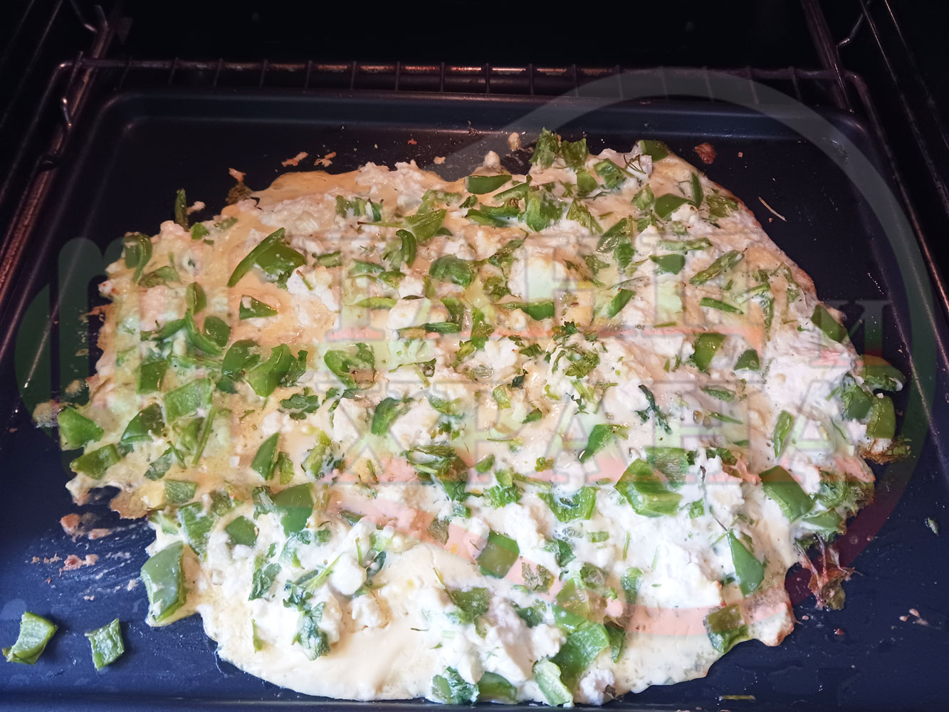 Български зеленочушков миш маш "Лютиковочеснов с БГсирене" запечен на фурна със зелени пресни чушки, стар чесън, яйца, свеж магданоз и краве бяло сирене (българско, саламурено)