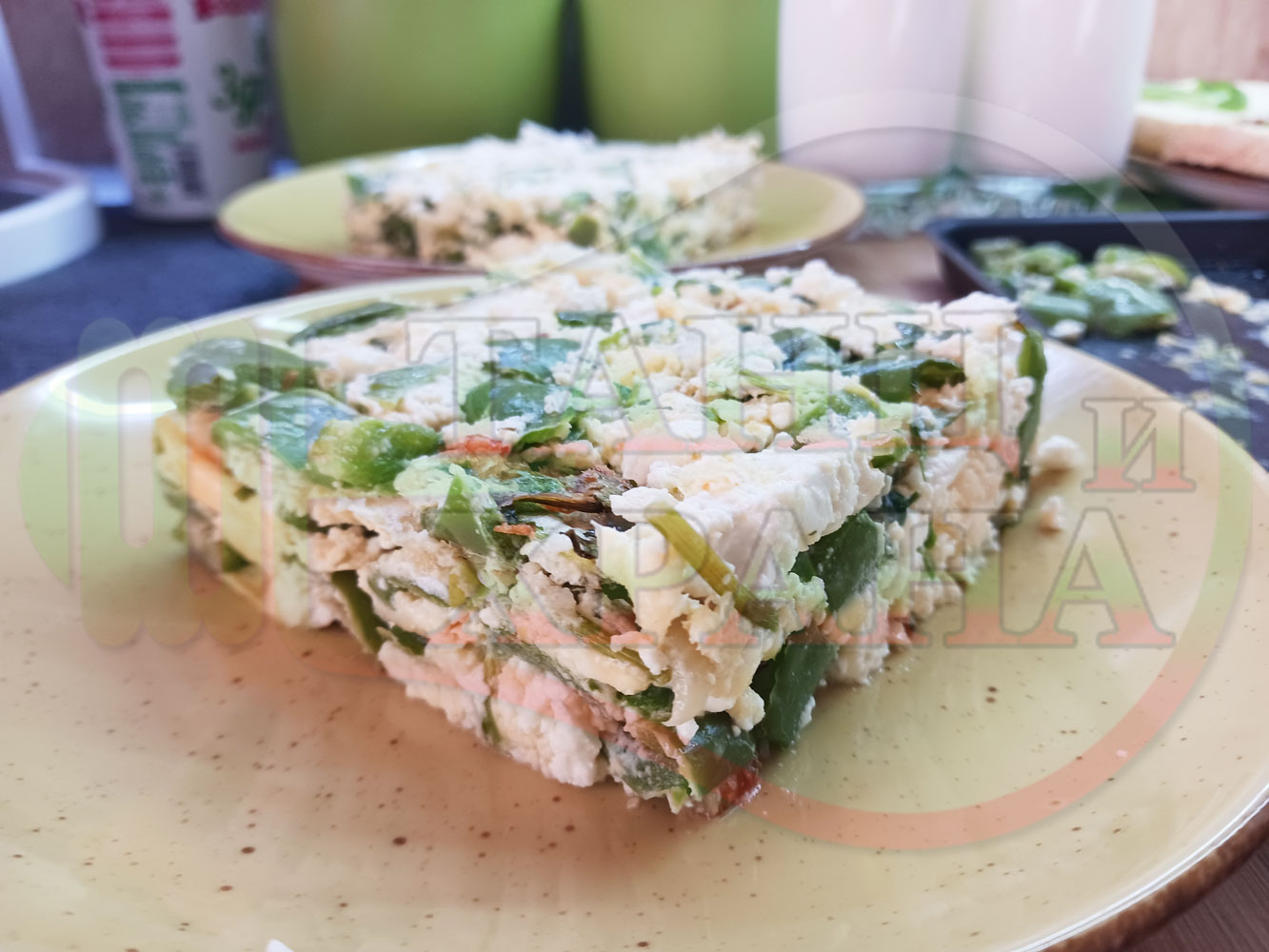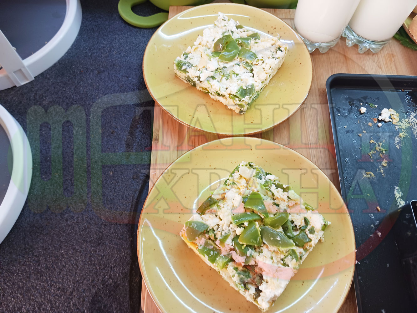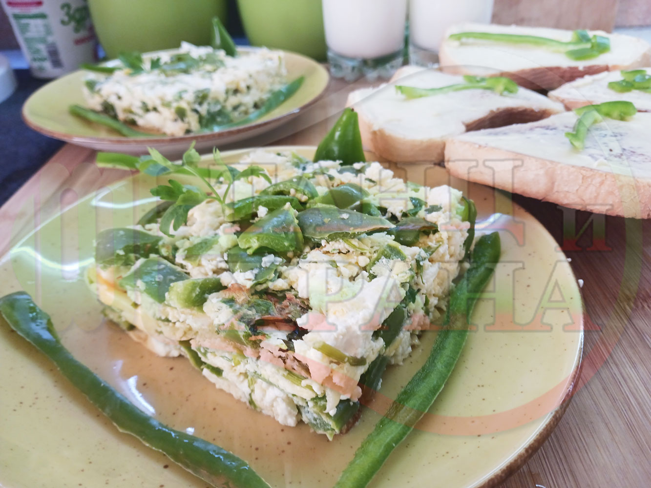 Български зеленочушков миш маш "Лютиковочеснов с БГсирене" запечен на фурна със зелени пресни чушки, стар чесън, яйца, свеж магданоз и краве бяло сирене (българско, саламурено)