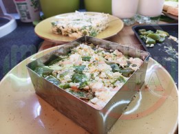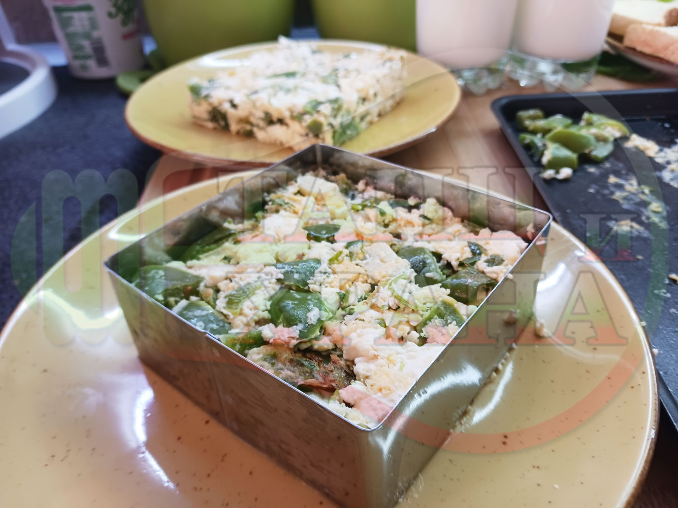 Извадете тавата със запечения миш маш от фурната и поставете метален квадрат в чиниите. Напълнете металния квадрат с миш маша и леко го притиснете за да се слегне и извадете внимателно металния квадрат, така че миш маша да запази квадратната форма. Украсете порциите със свежи листенца магданоз, с чушковите ивички и връхчета (украсете порциите по ваше желание и усмотрение).