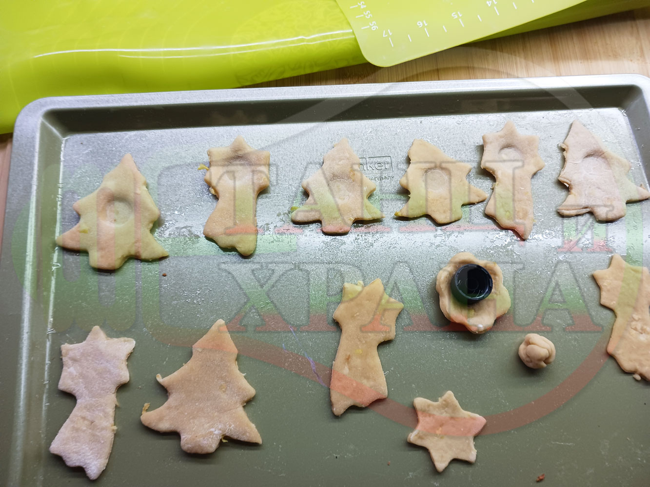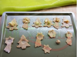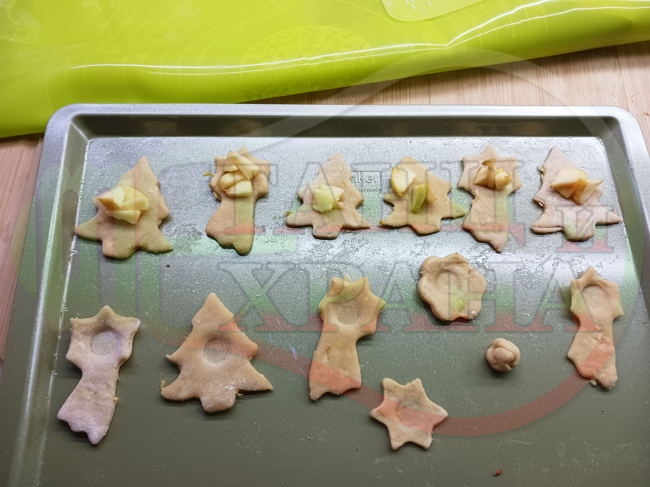 Поръсете с брашно работната площ върху, която ще разточвате. Извадете купата от хладилника и поставете тестото върху поръсената с брашно работна площ (използвайте силиконова подложка за разточване, в случай че имате такава). Разточете тестото до средно дебела кора около 2 см. и оформете различни видове фигурки с метални формички или с малки чашки и други видове кухненски прибори. Съберете отразъците от тестото, които са останали след оформянето на фигурките, размесете го, набрашнете работната площ и отново го разточете и отрежете различни коледни фигурки. Повторете процедурата до пълното оползотворяване на тестото или заделете част от него за последващо изпичане на курабийки или за друг вид коледно печиво. На част от курабийките оформете малки вдлъбнатини с капачка или друг вид подходящ прибор, поставете част от нарязаната на парченца ябълка във всяка вдлъбнатина и поръсете ябълковите парченца с кристална захар.