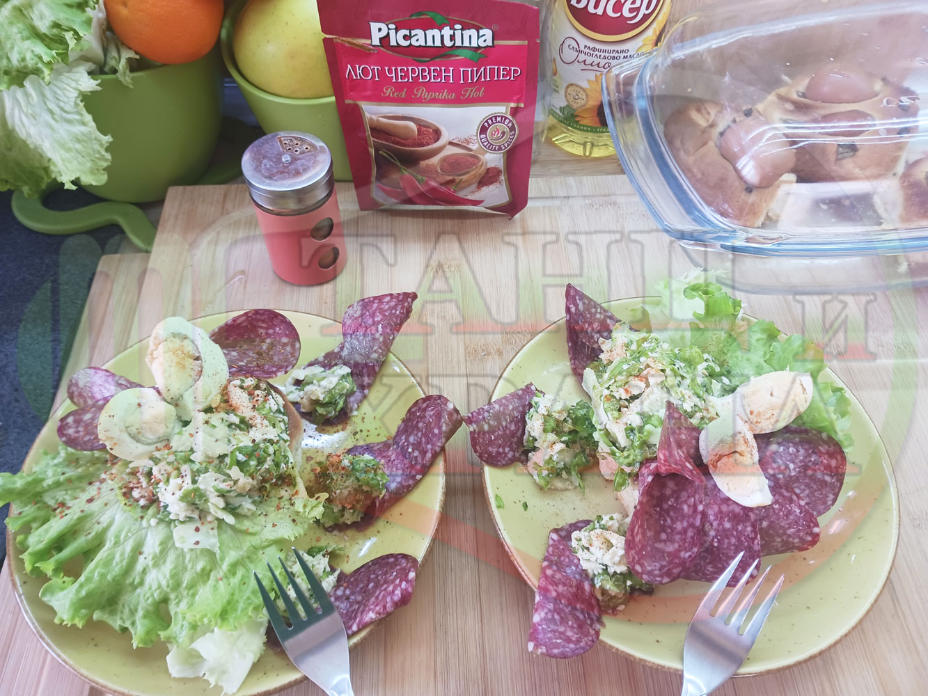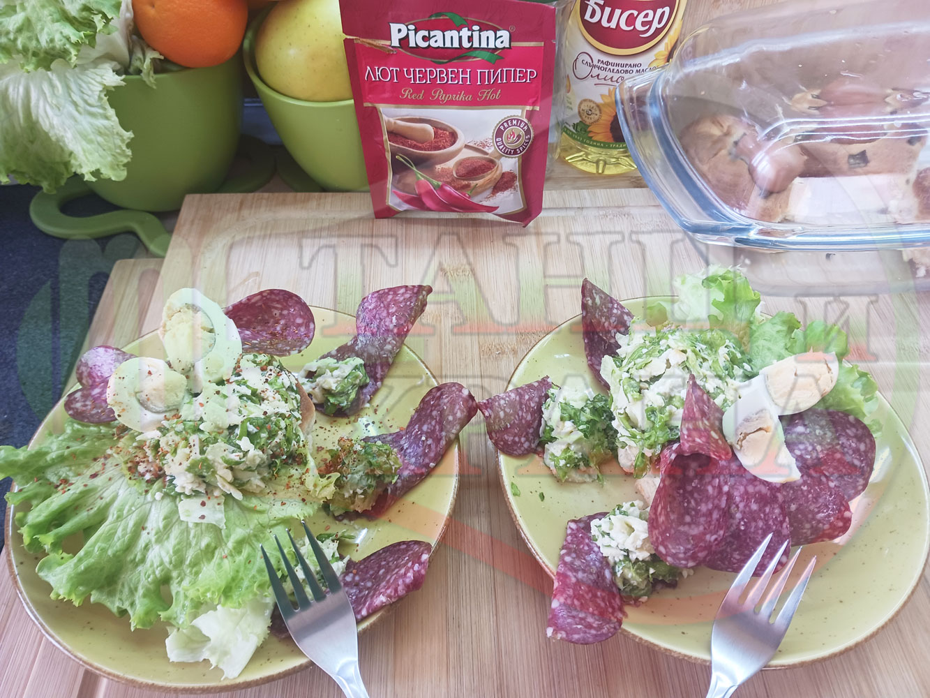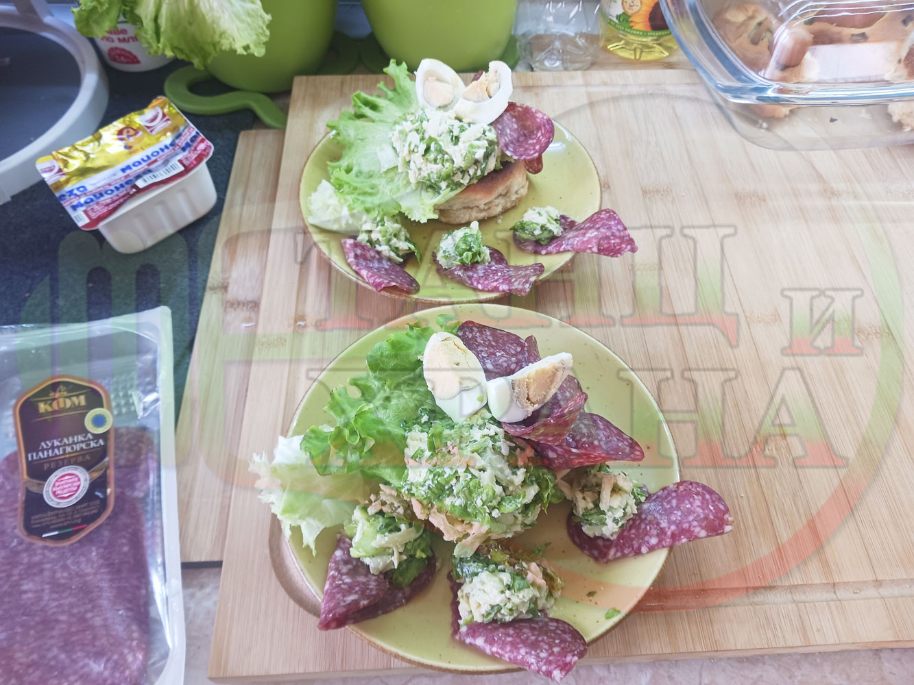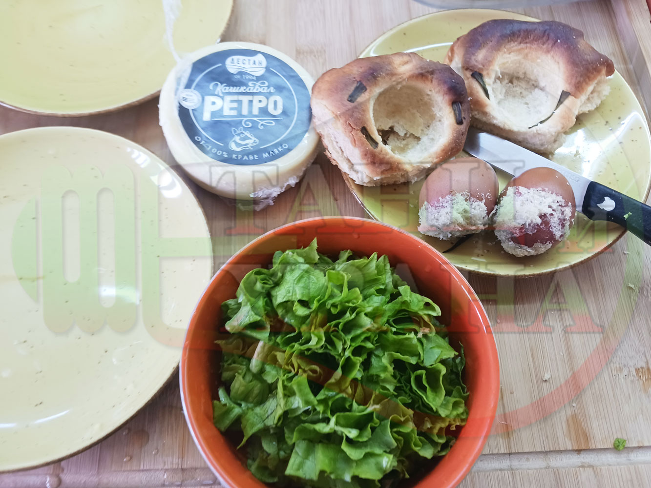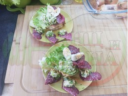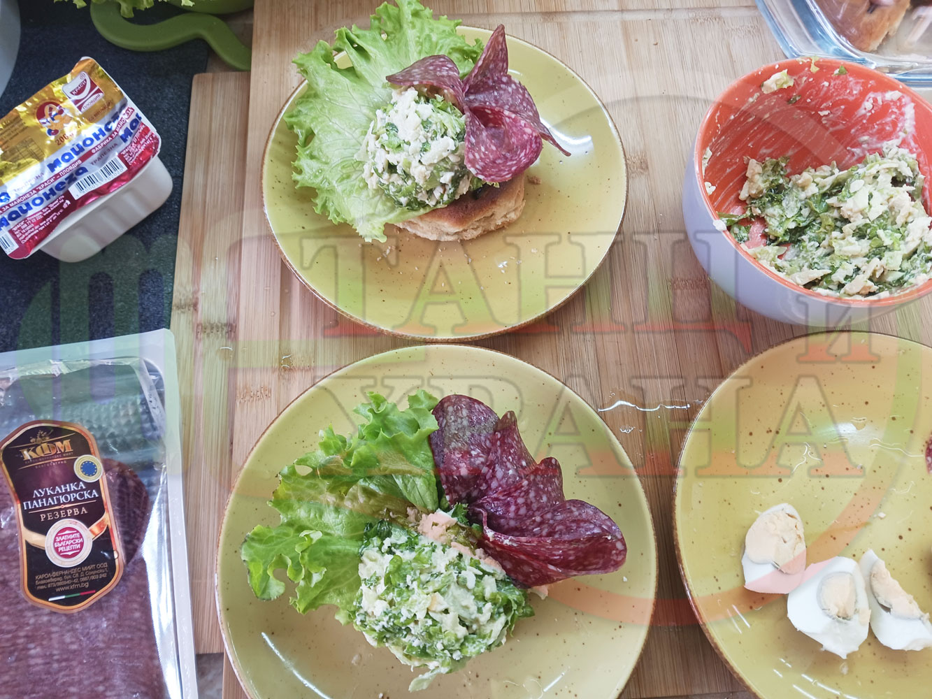 Приготвих кашкаваления крем със свежа маруля, яйце от коколниците, настърган на едро млечен кашкавал и майонеза. Гарнирах българските коколнишки сандвичи с панагюрска луканка и яйце.
