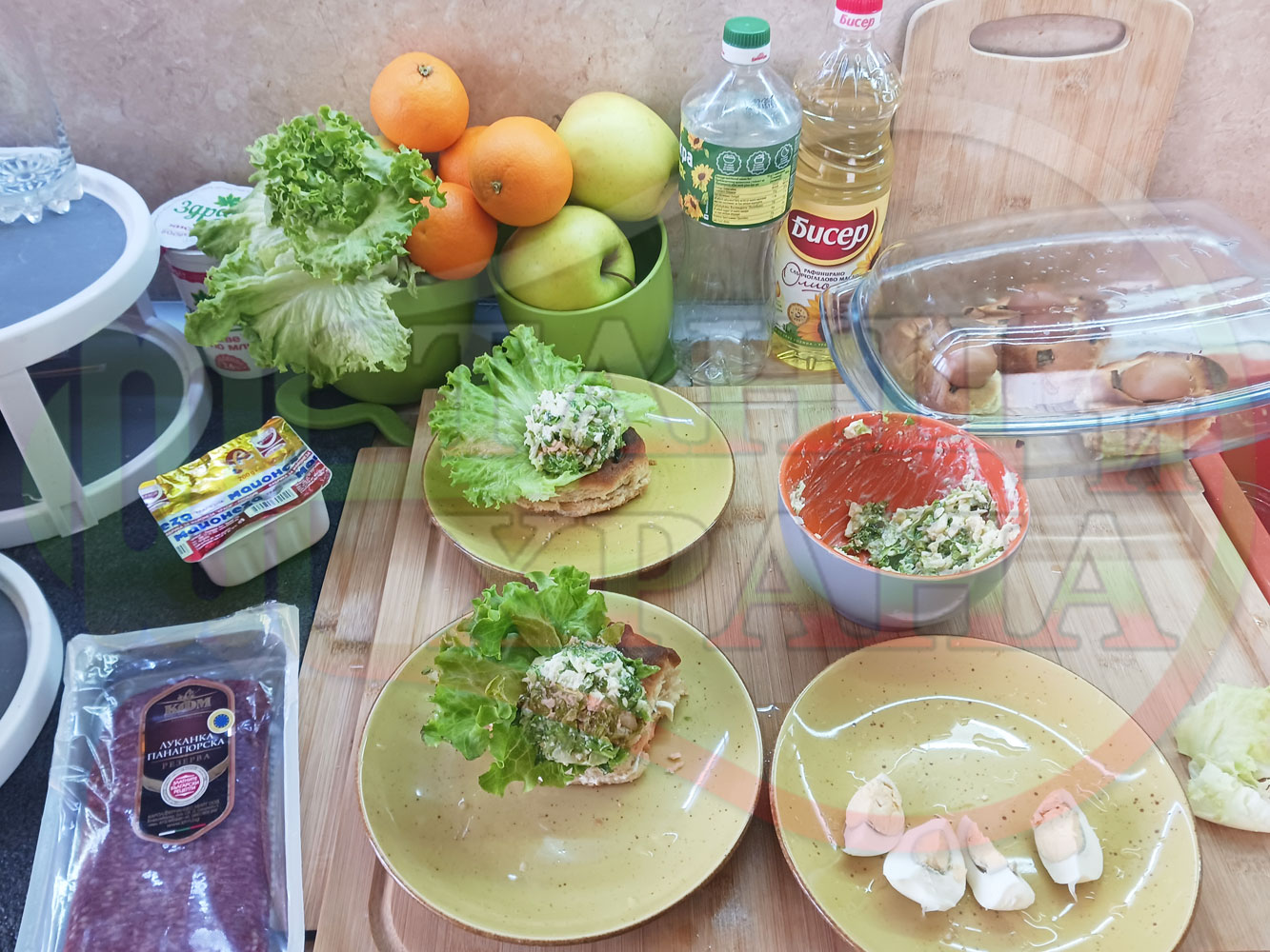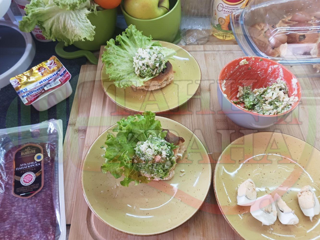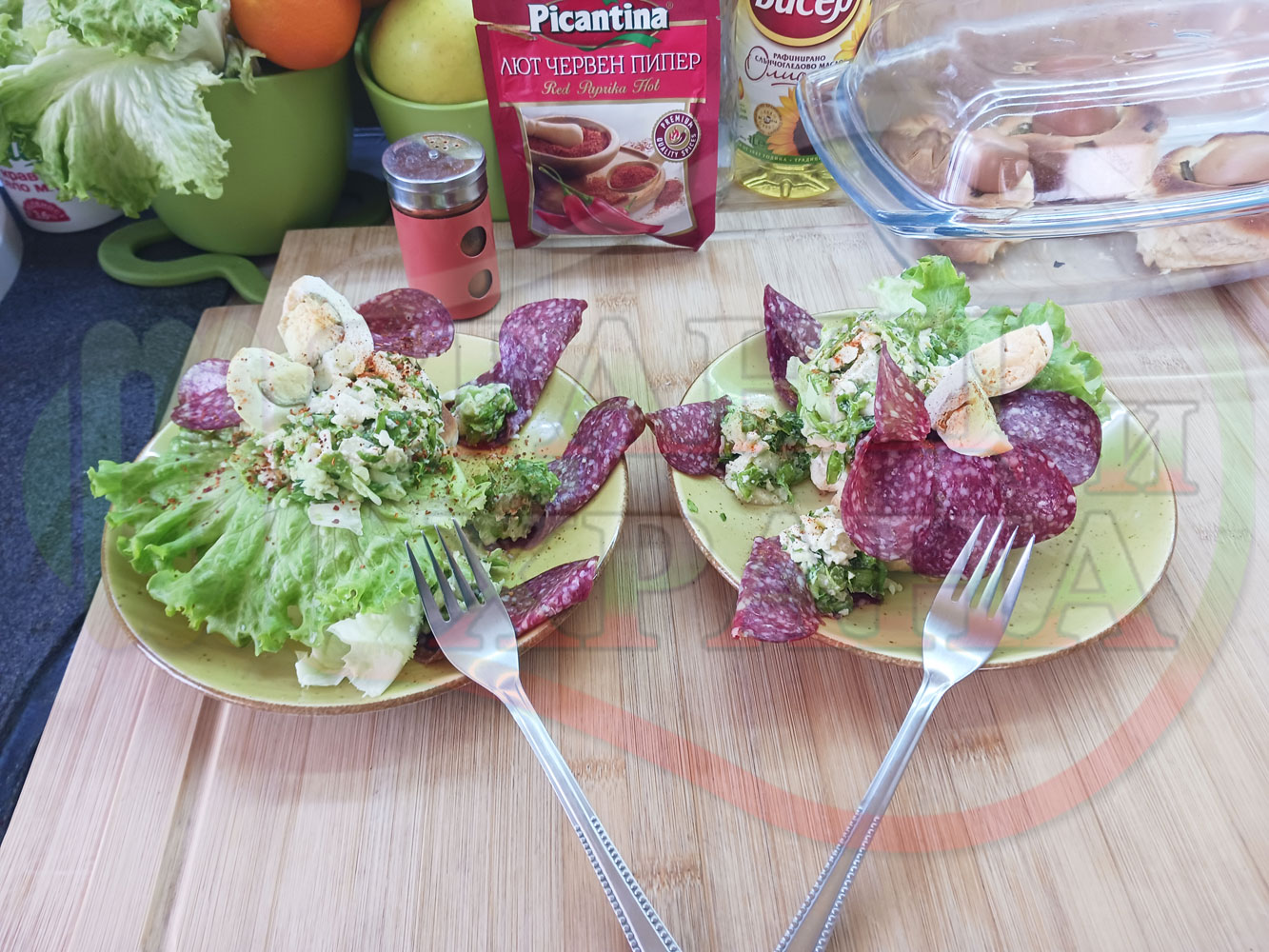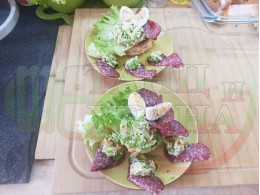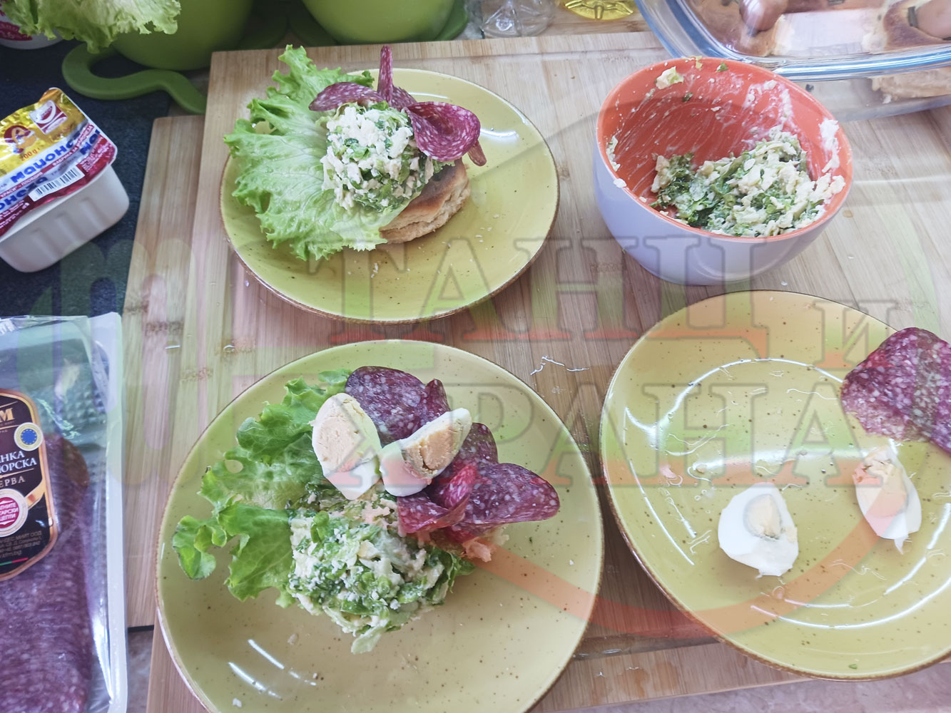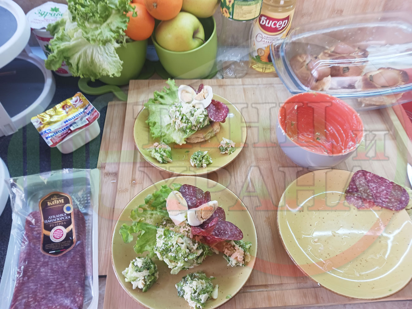 Приготвих кашкаваления крем със свежа маруля, яйце от коколниците, настърган на едро млечен кашкавал и майонеза. Гарнирах българските коколнишки сандвичи с панагюрска луканка и яйце.