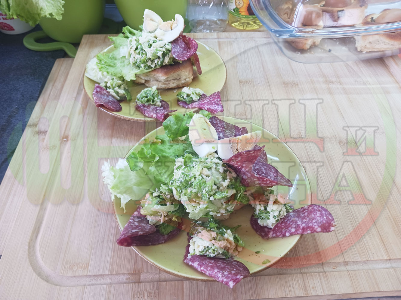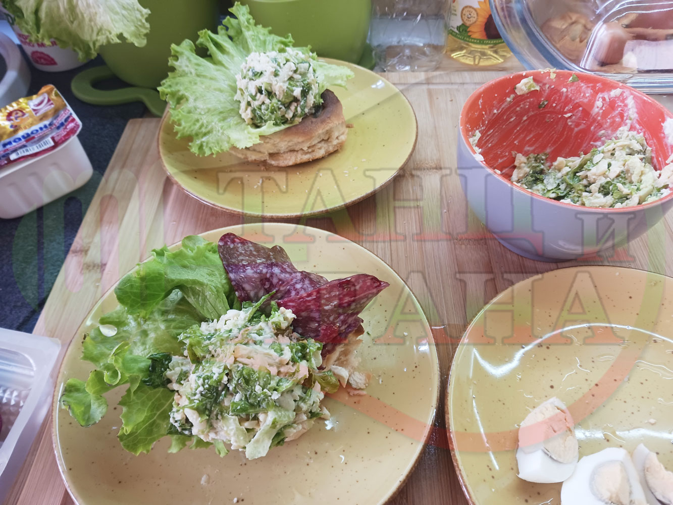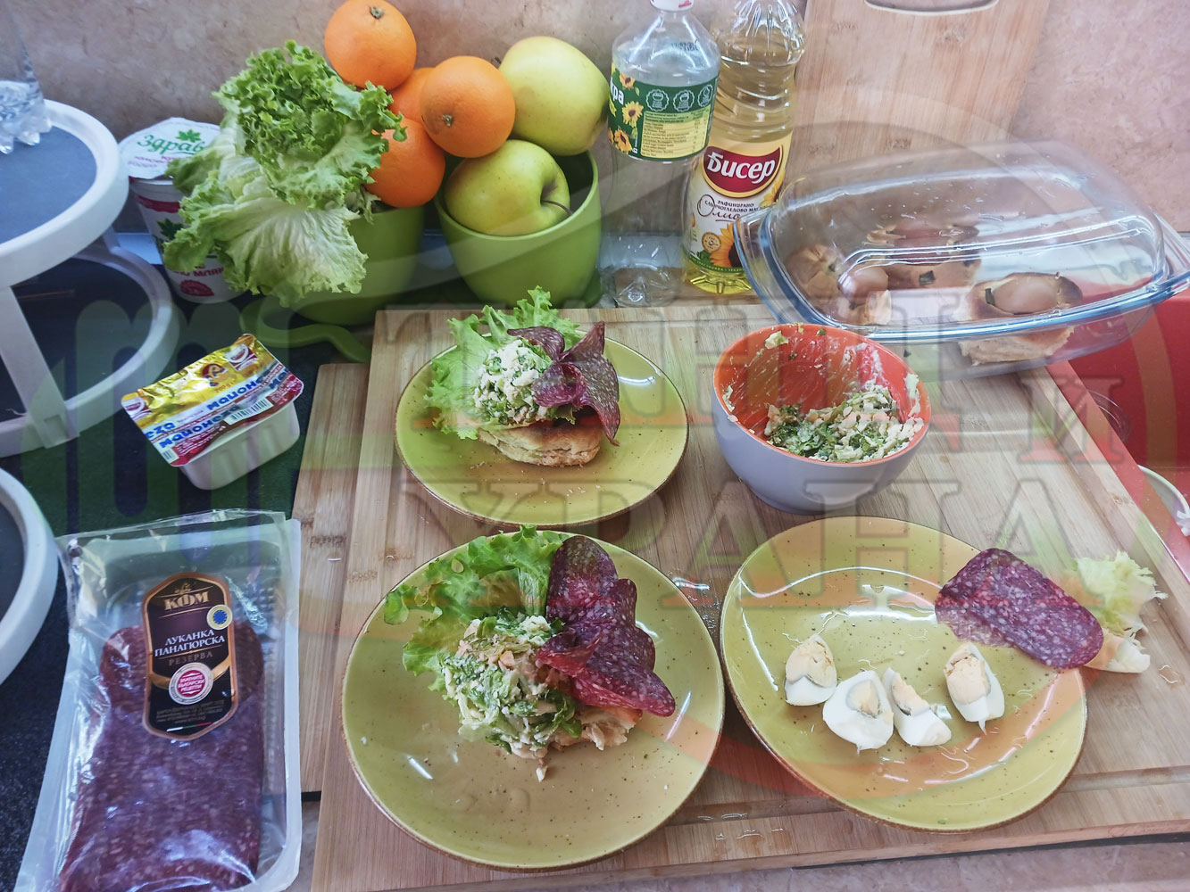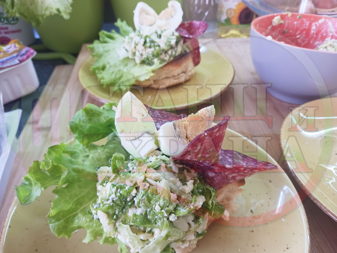 Приготвих кашкаваления крем със свежа маруля, яйце от коколниците, настърган на едро млечен кашкавал и майонеза. Гарнирах българските коколнишки сандвичи с панагюрска луканка и яйце.