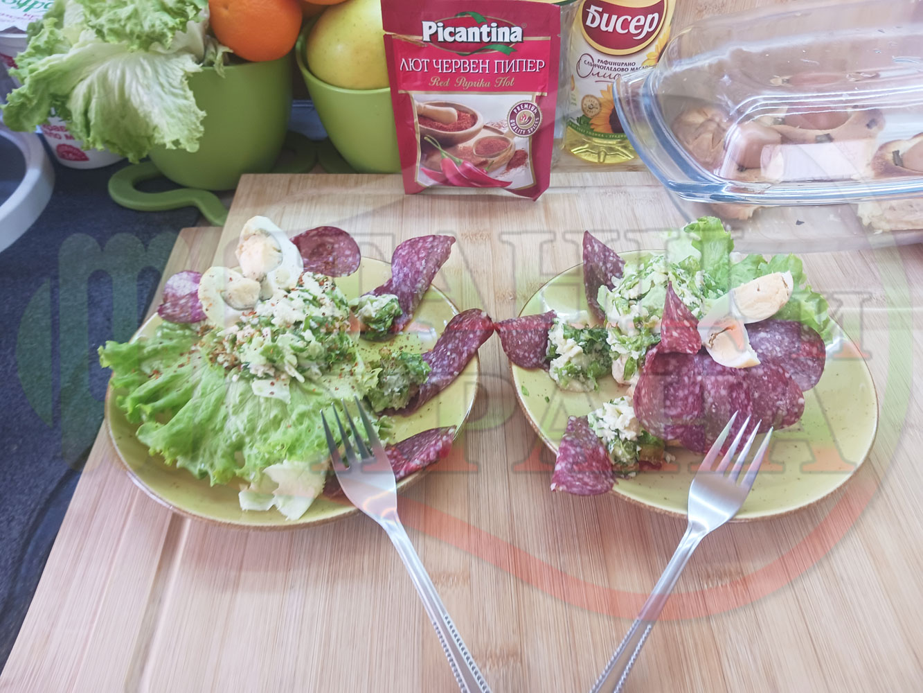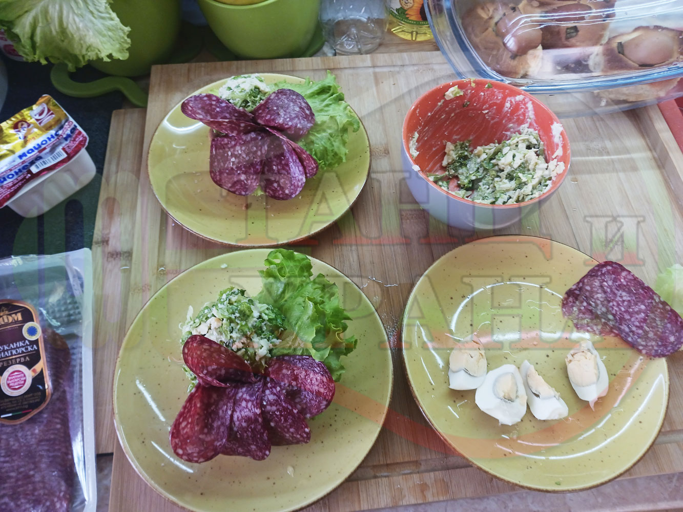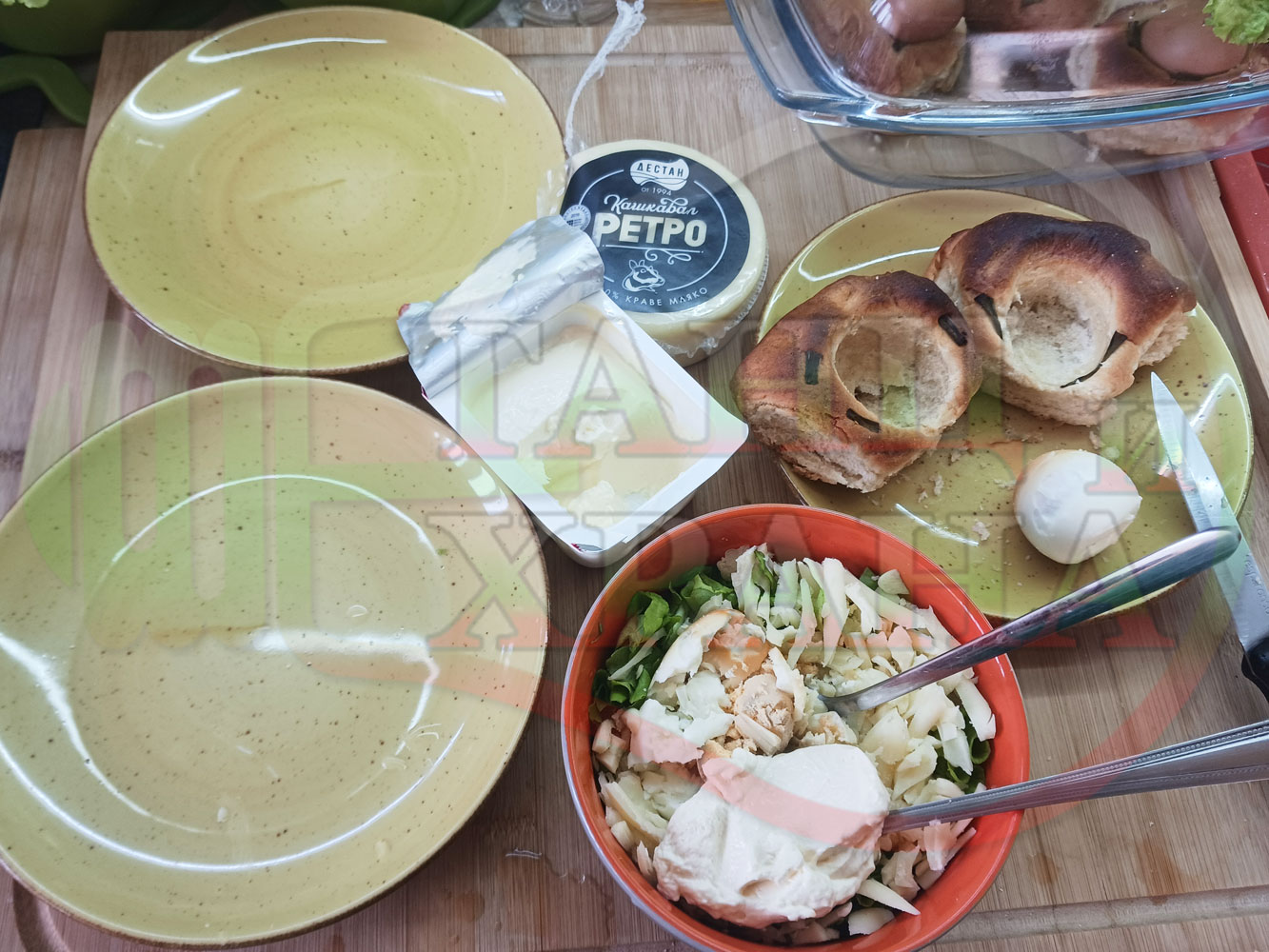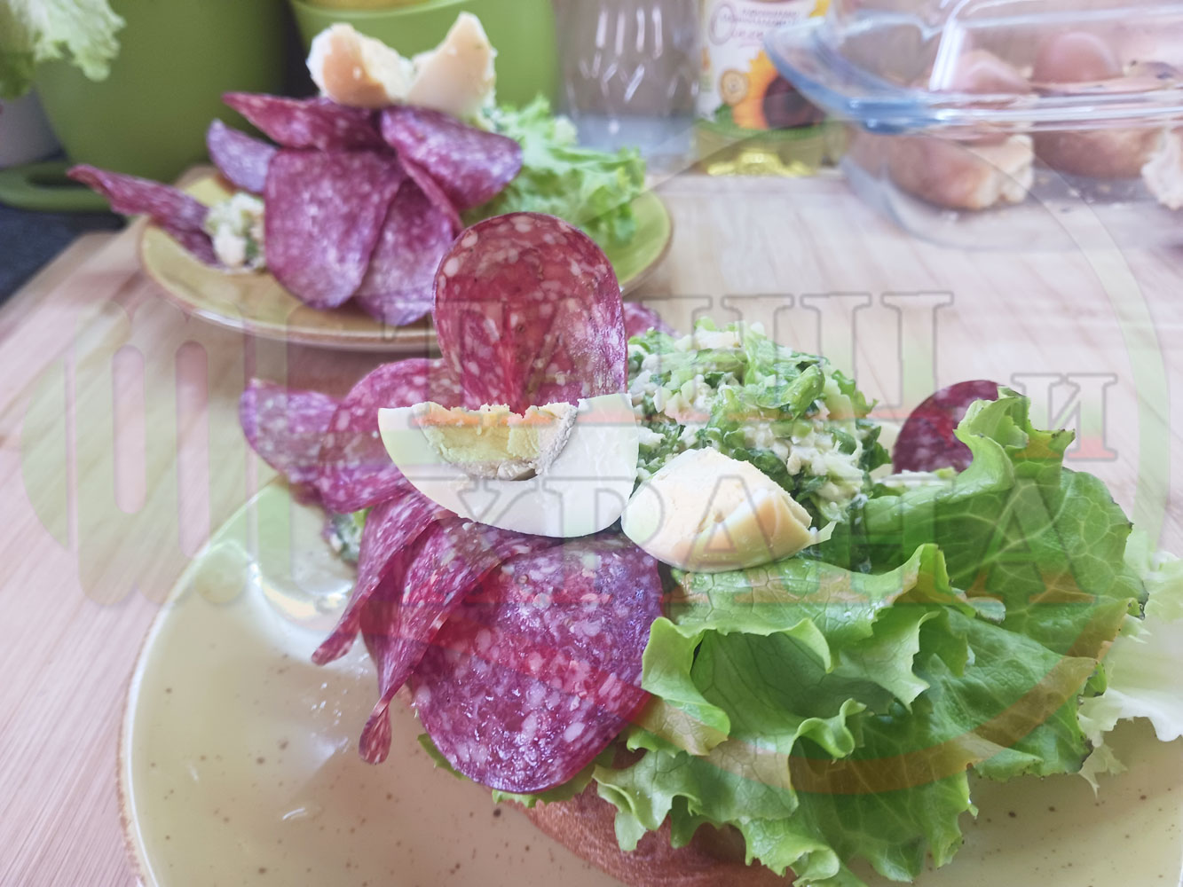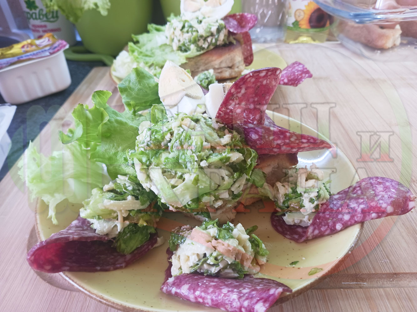 Приготвих кашкаваления крем със свежа маруля, яйце от коколниците, настърган на едро млечен кашкавал и майонеза. Гарнирах българските коколнишки сандвичи с панагюрска луканка и яйце.