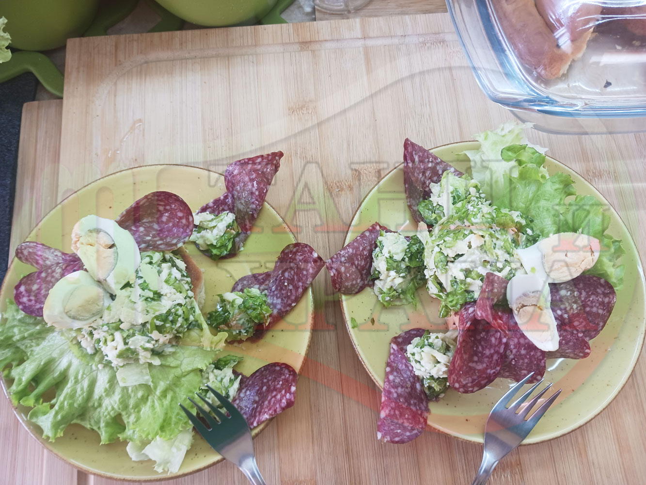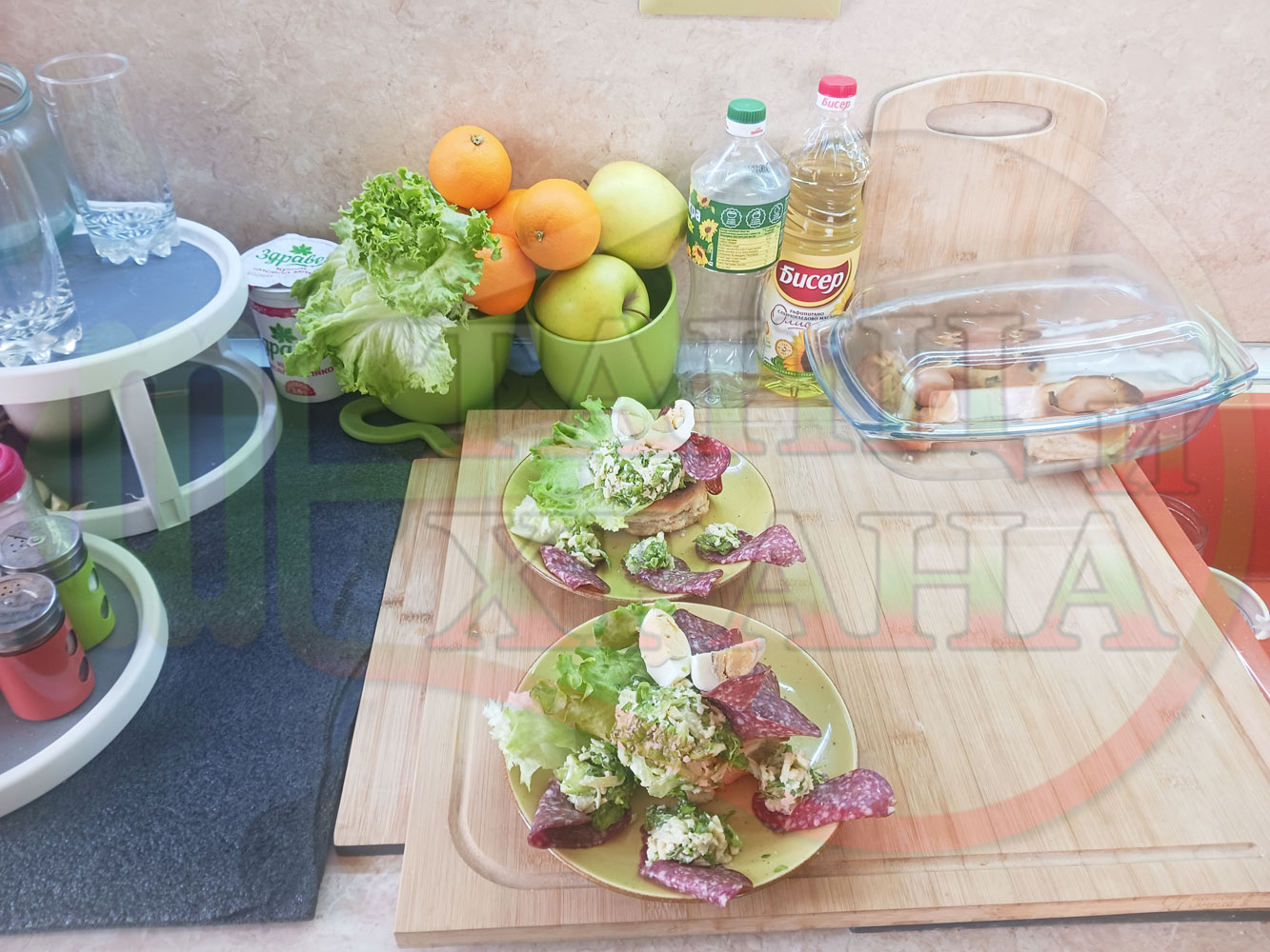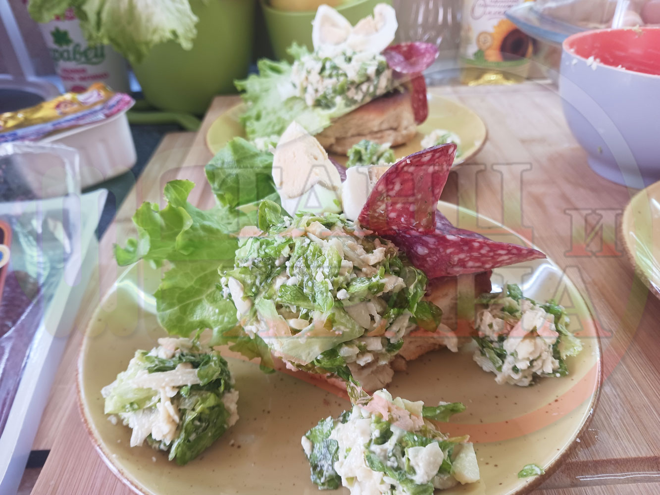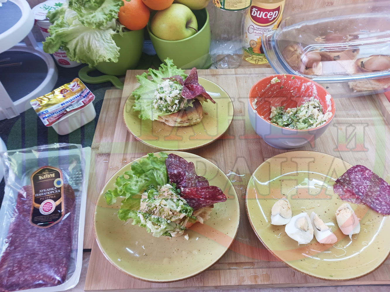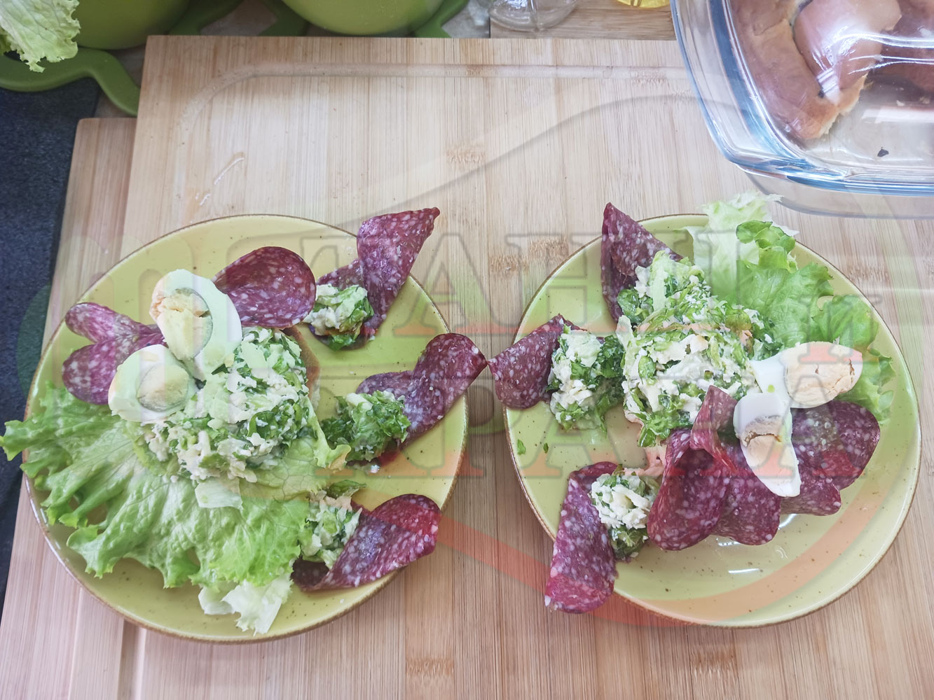 Приготвих кашкаваления крем със свежа маруля, яйце от коколниците, настърган на едро млечен кашкавал и майонеза. Гарнирах българските коколнишки сандвичи с панагюрска луканка и яйце.