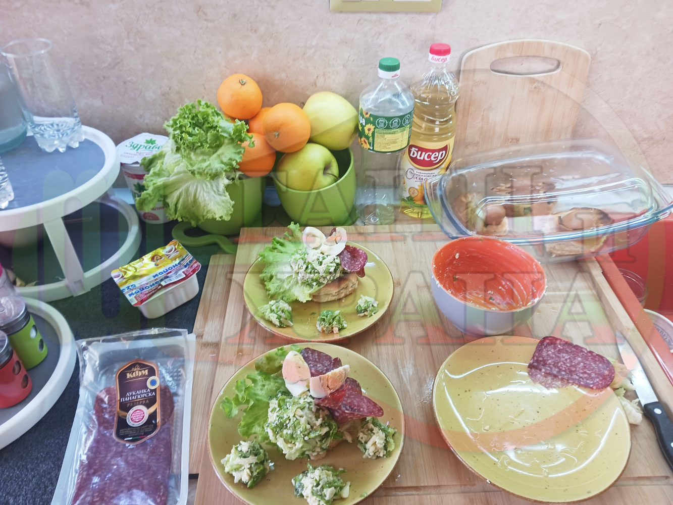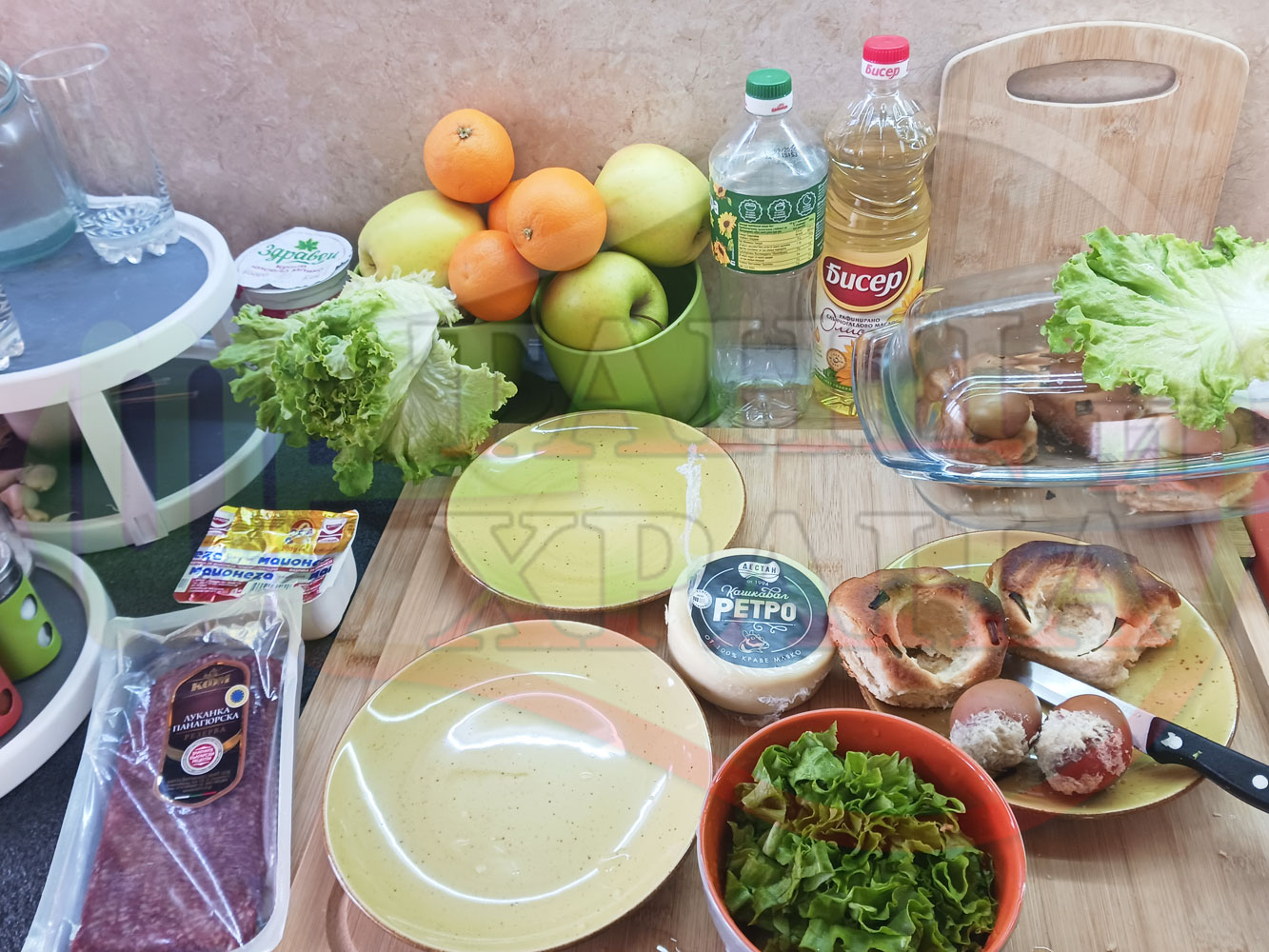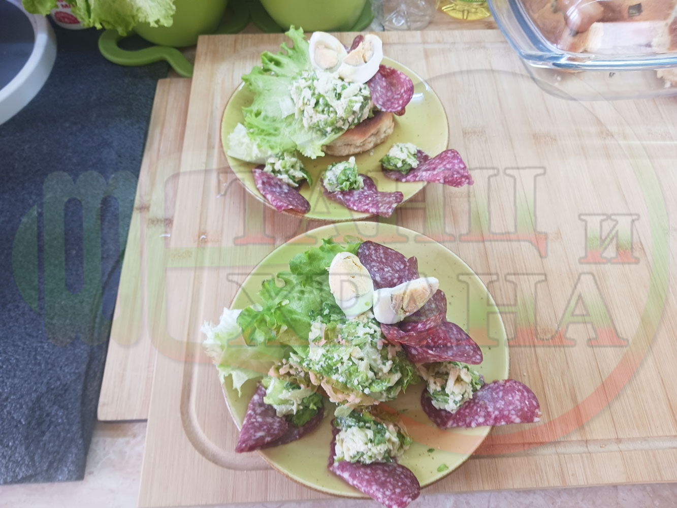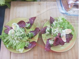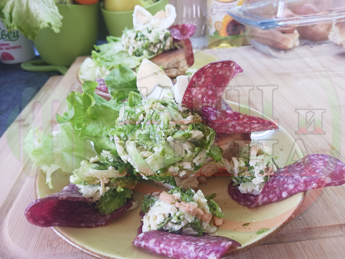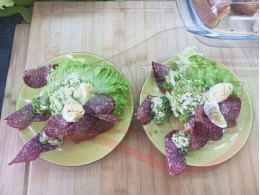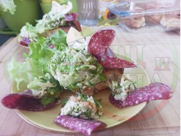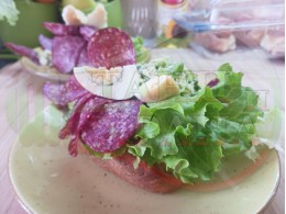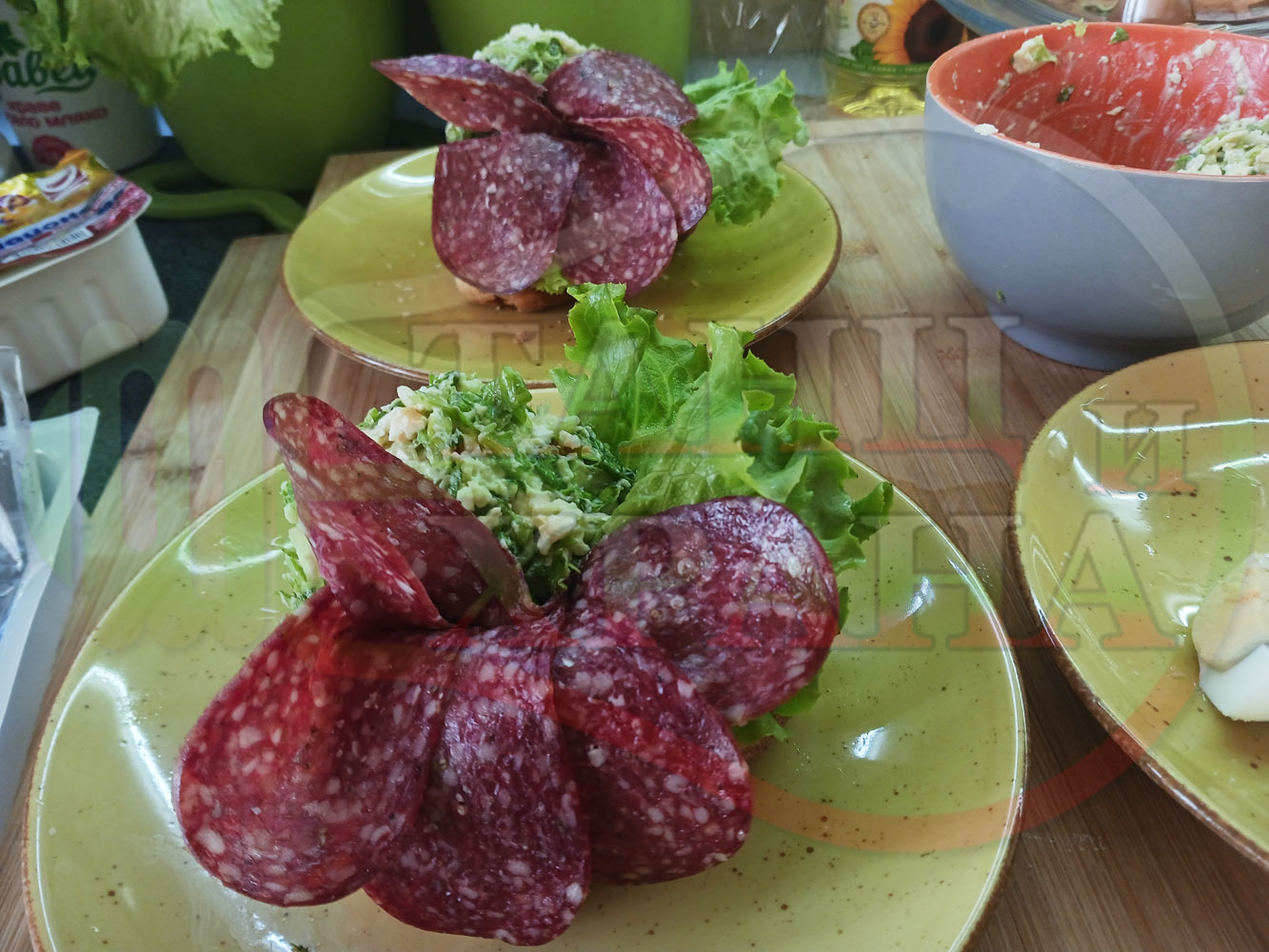 Приготвих кашкаваления крем със свежа маруля, яйце от коколниците, настърган на едро млечен кашкавал и майонеза. Гарнирах българските коколнишки сандвичи с панагюрска луканка и яйце.